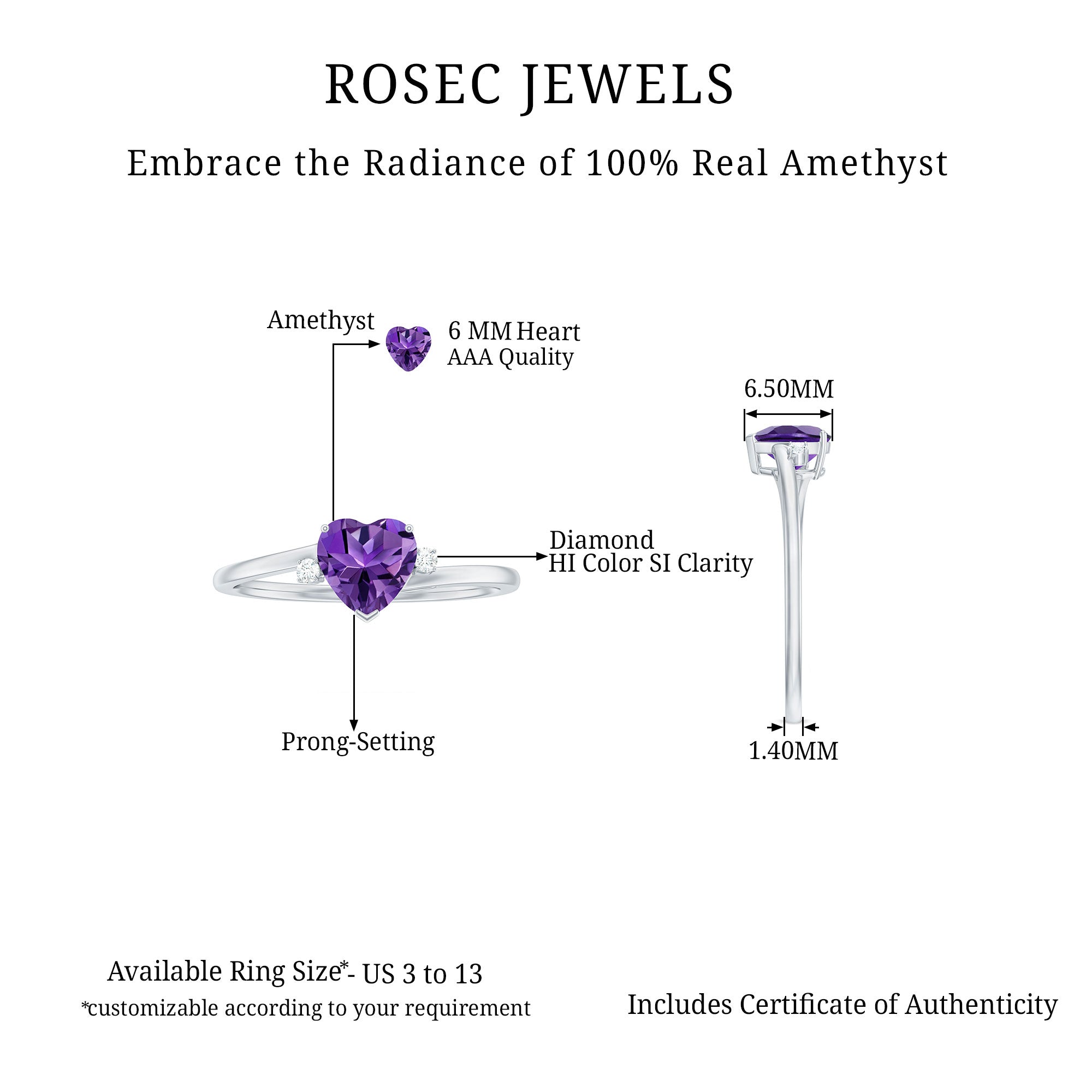 The beautiful purple gemstone ring styles range from solitaire rings to more intricate vintage-inspired rings. Natural Amethyst is popular and an extraordinary choice for wedding bands, and engagement rings. This exquisite gemstone embodies the essence of love, enduring unity, and long-term commitment.