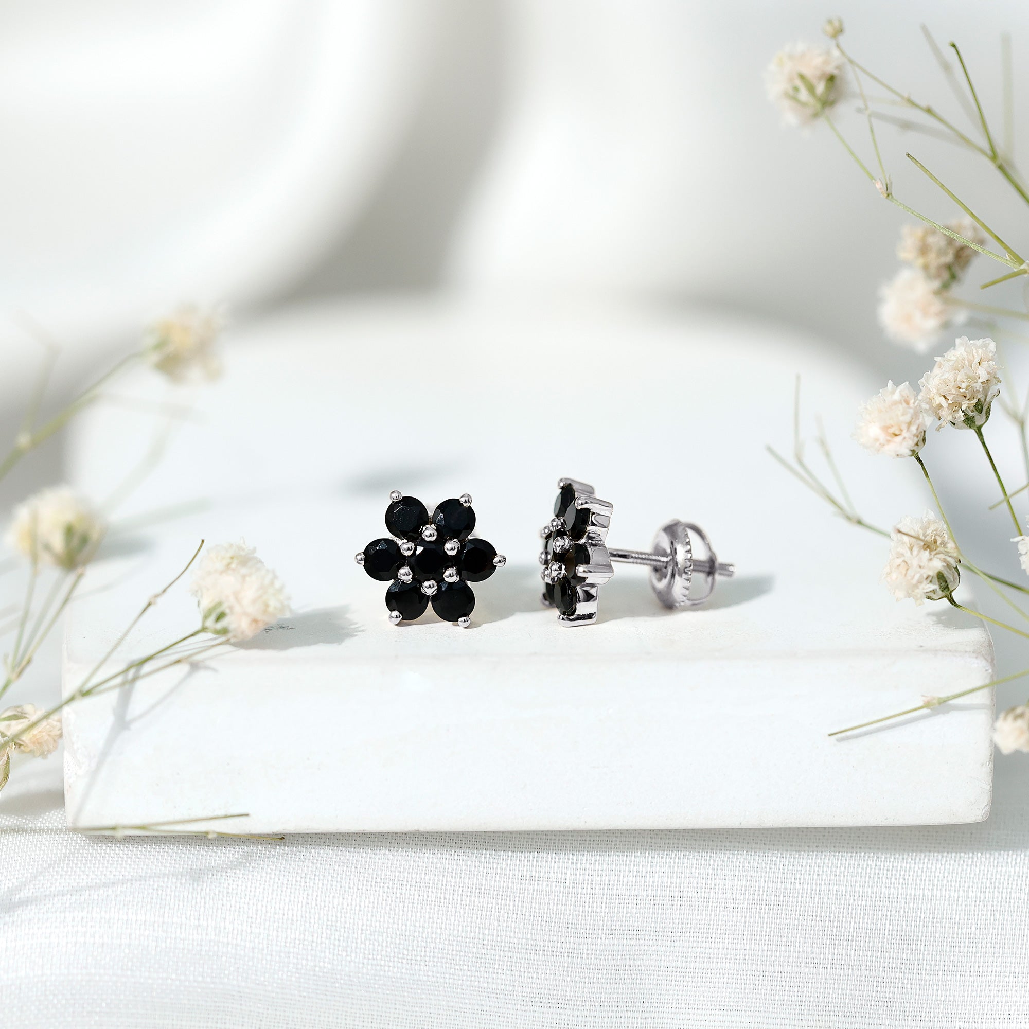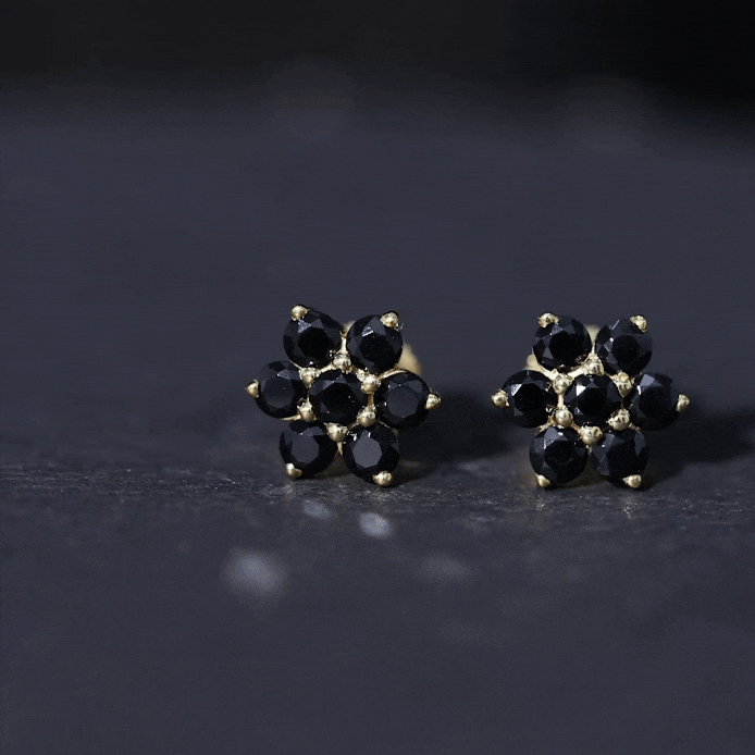 The charm of floral designs is timeless, especially when they shine like this. The Black Onyx Stud Earrings are designed in a lovely flower cluster pattern that exudes femininity, elegance, and personality. Adorned with round cut black onyx stones, they create a harmonious and striking appearance. The cluster design gives the Flower Stud Earrings a distinctive flair, resembling a blooming flower that fits perfectly on the ear. Each stone is carefully set to accentuate the overall design and ensure long-lasting durability. Designed for women who value classic yet expressive jewelry, the Onyx Flower Earrings are perfect for everyday wear as well as special occasions. Whether for festive events or sophisticated dinners, they seamlessly complement various settings. The secure screw back closures keep the Black Onyx Earrings securely in place, providing comfort and confidence all day long. Delivered in a jewelry box with a certificate of authenticity, this pair is ready to be gifted as soon as it arrives.