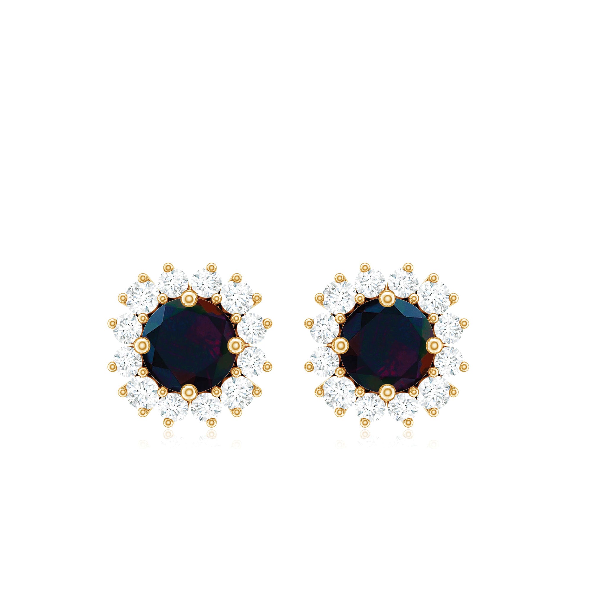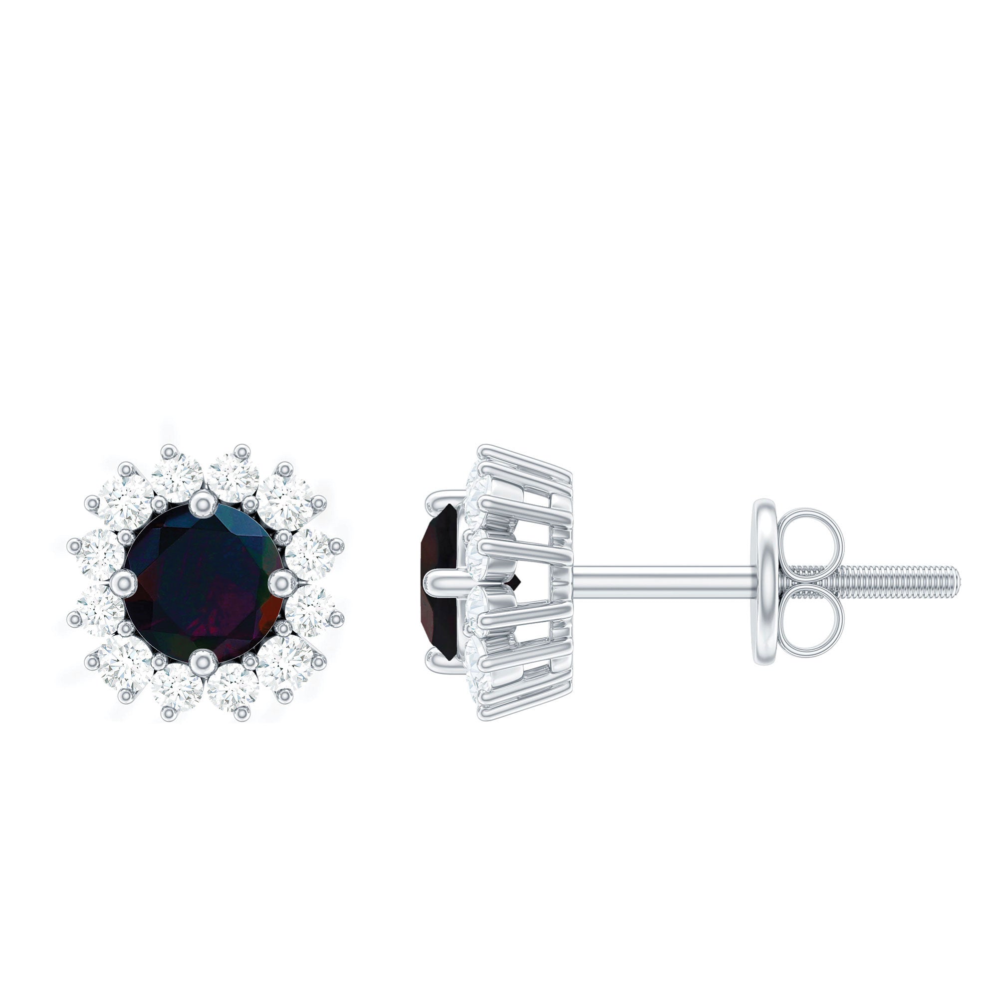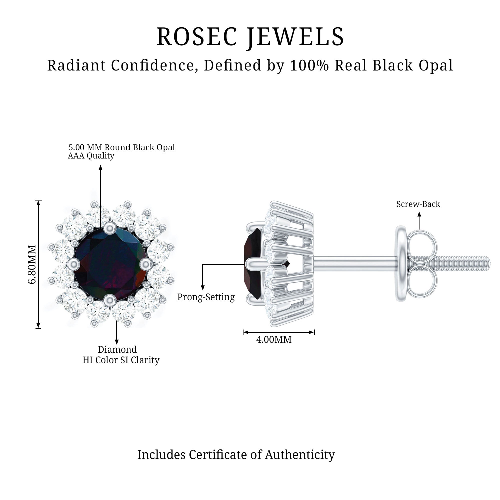 Capture attention wherever you go with these breathtaking Black Opal Earrings. Each earring features a mesmerizing 5 mm Round Shape Black Opal in Prong Setting at its center, glowing with mysterious flashes of color that change with every angle. Surrounding the AAA Quality Opal, a Halo of sparkling Diamond stones adds a touch of brilliance, creating the perfect balance of bold and elegant. Secured with Screw Back Closure, these Black Opal Diamond Earrings stay comfortably in place, making them ideal for all-day wear or special nights out. These Black Opal Studs catch light and admiration effortlessly. Whether you are dressing up for a party, a romantic dinner or just want to elevate your everyday style, these Black Opal Stud Earrings add instant sophistication. They come ready to gift in a chic jewelry box, making them a thoughtful present for someone special or a luxurious treat for yourself. The combination of unique AAA Quality Black Opal and shimmering HI-SI Diamond stones gives a modern twist to classic elegance, making them versatile enough to pair with both casual and formal outfits.