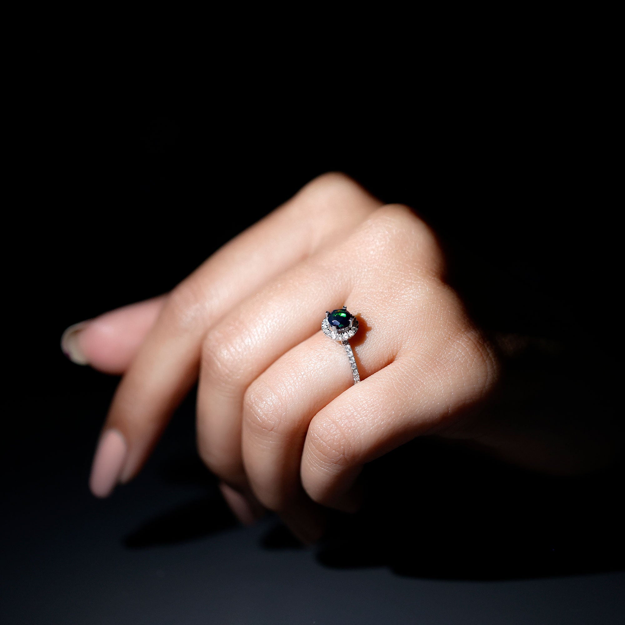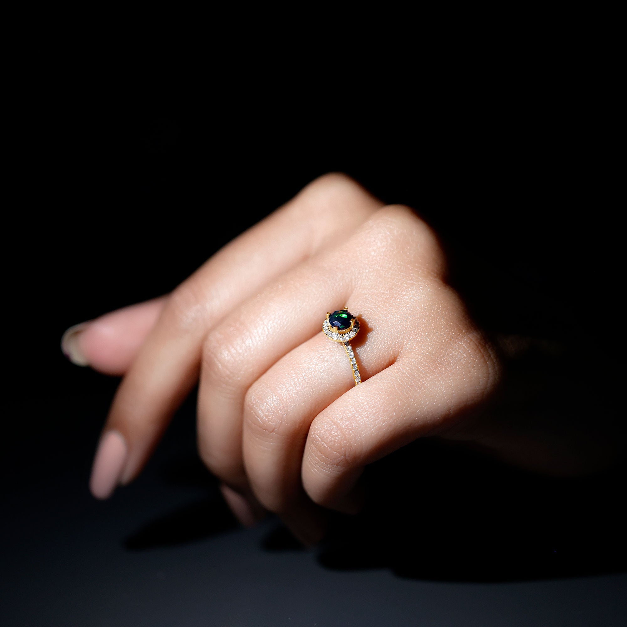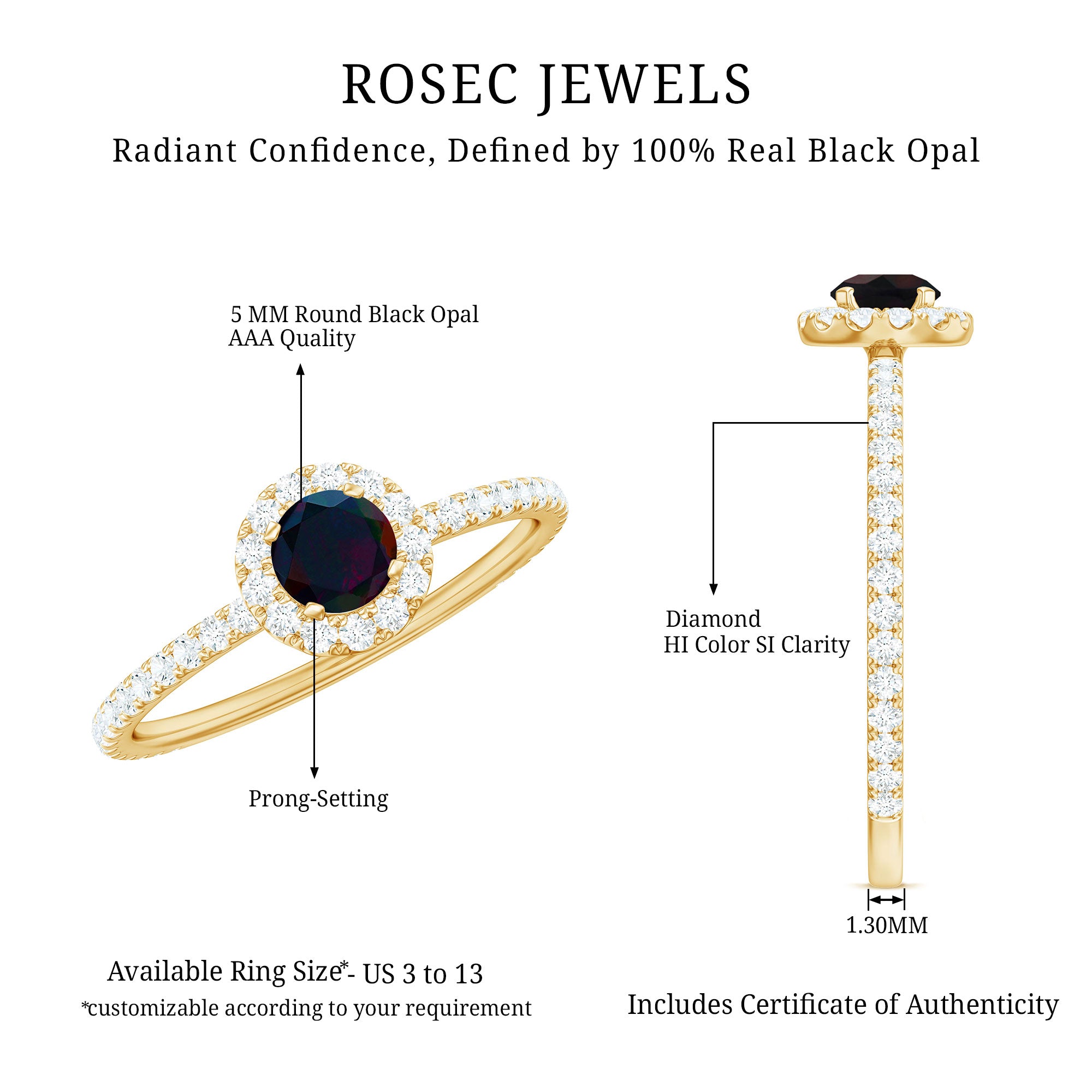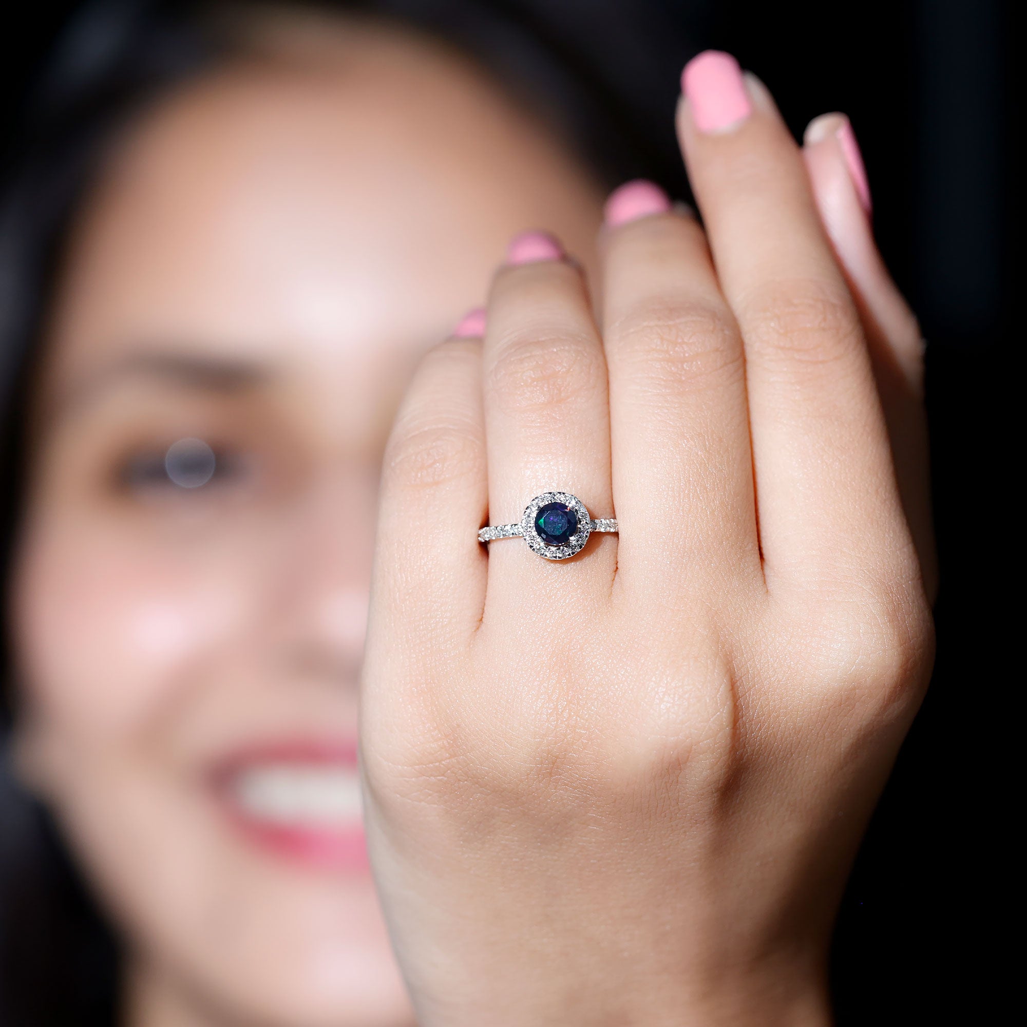 A promise of love feels even more meaningful when expressed through a design that speaks from the heart. The Black Opal and Diamond Ring is crafted to capture that feeling with elegance and warmth. At the center sits a 5 MM round black opal held securely in prong setting. A halo of sparkling diamonds circles the opal, with more diamonds flowing along the band to give the Black Opal Promise Ring a soft and glowing charm. Every detail is created with care, using AAA quality black opal and bright HI-SI quality diamonds that reflect light beautifully. The design feels classic yet unique, making it a lovely choice for a pre-engagement moment or a meaningful gift that represents devotion. Its smooth finish and balanced shape make it comfortable for daily wear while still looking special enough for important occasions. Whether chosen for a partner or for yourself, the Halo Ring brings beauty, emotion, and a touch of magic to every moment.