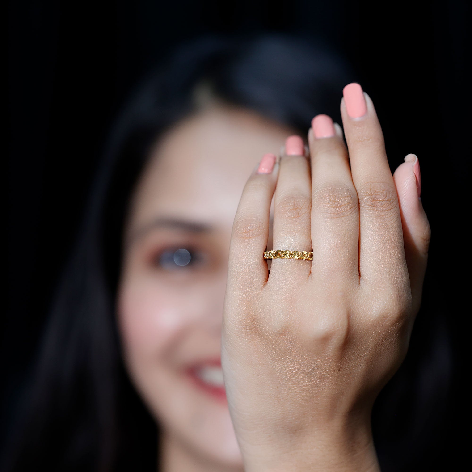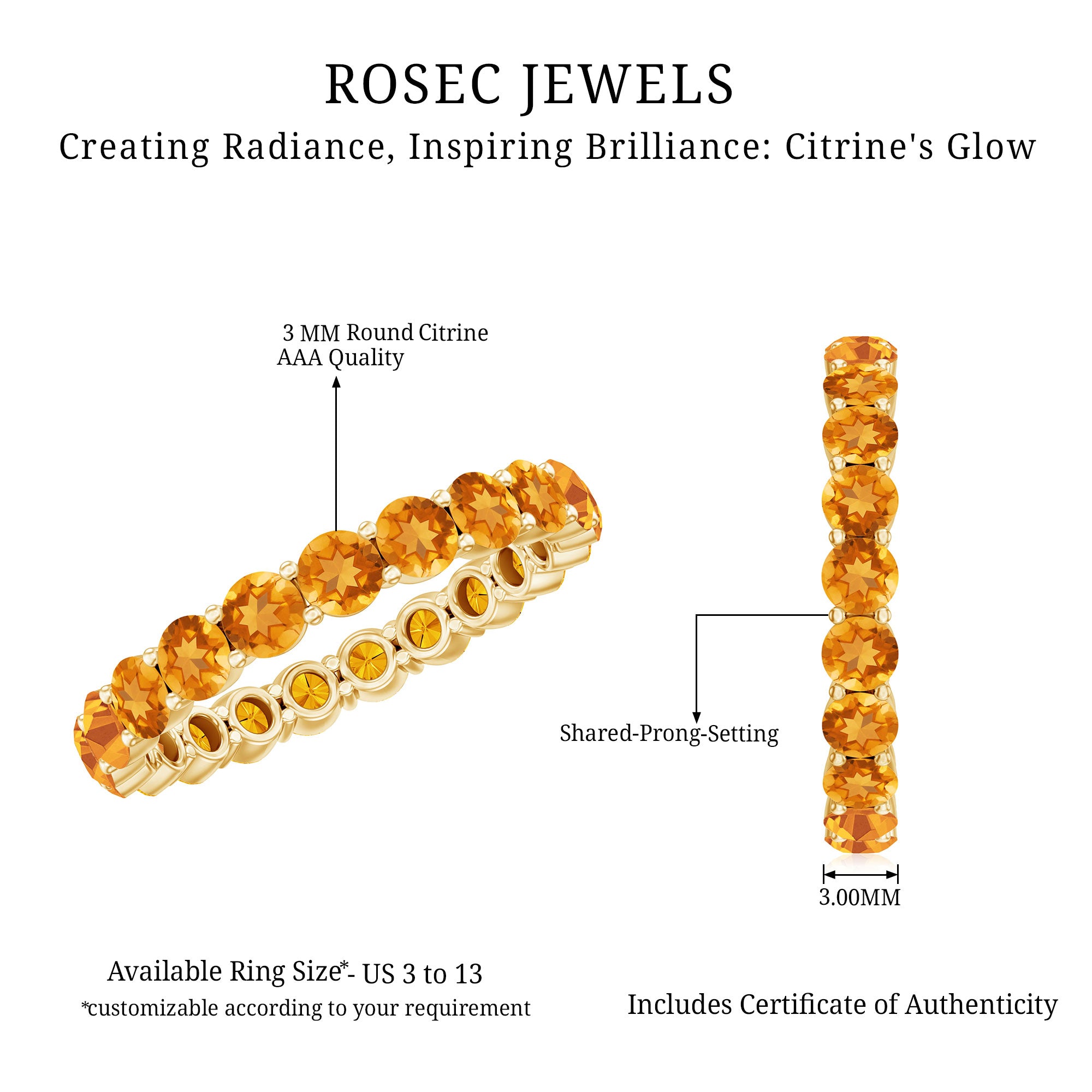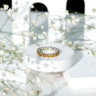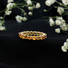 Bring warmth and vibrancy to your jewelry collection with this Citrine Eternity Ring. Featuring round cut citrine stones that shimmer with a golden glow, this full eternity band adds a cheerful and elegant touch to any outfit. Each stone is carefully set in secure shared prong setting, creating a smooth look that reflects light beautifully. Perfect for November birthdays, this Citrine Anniversary Band symbolizes happiness, positivity, and new beginnings. Its slim design ensures comfortable wear throughout the day while making it easy to pair with other rings for a stylish, layered look. Whether added to an engagement ring, worn as a wedding band, or chosen as a meaningful gift, this citrine eternity ring is versatile enough for any occasion. Available in multiple sizes, it provides a perfect fit for anyone, ensuring comfort and elegance. Its stackable design allows you to mix and match with other rings, creating a personalized style that feels unique. Arriving in a beautiful jewelry box, the Citrine Wedding Band is ready to gift for weddings, anniversaries, or to celebrate any special moment.