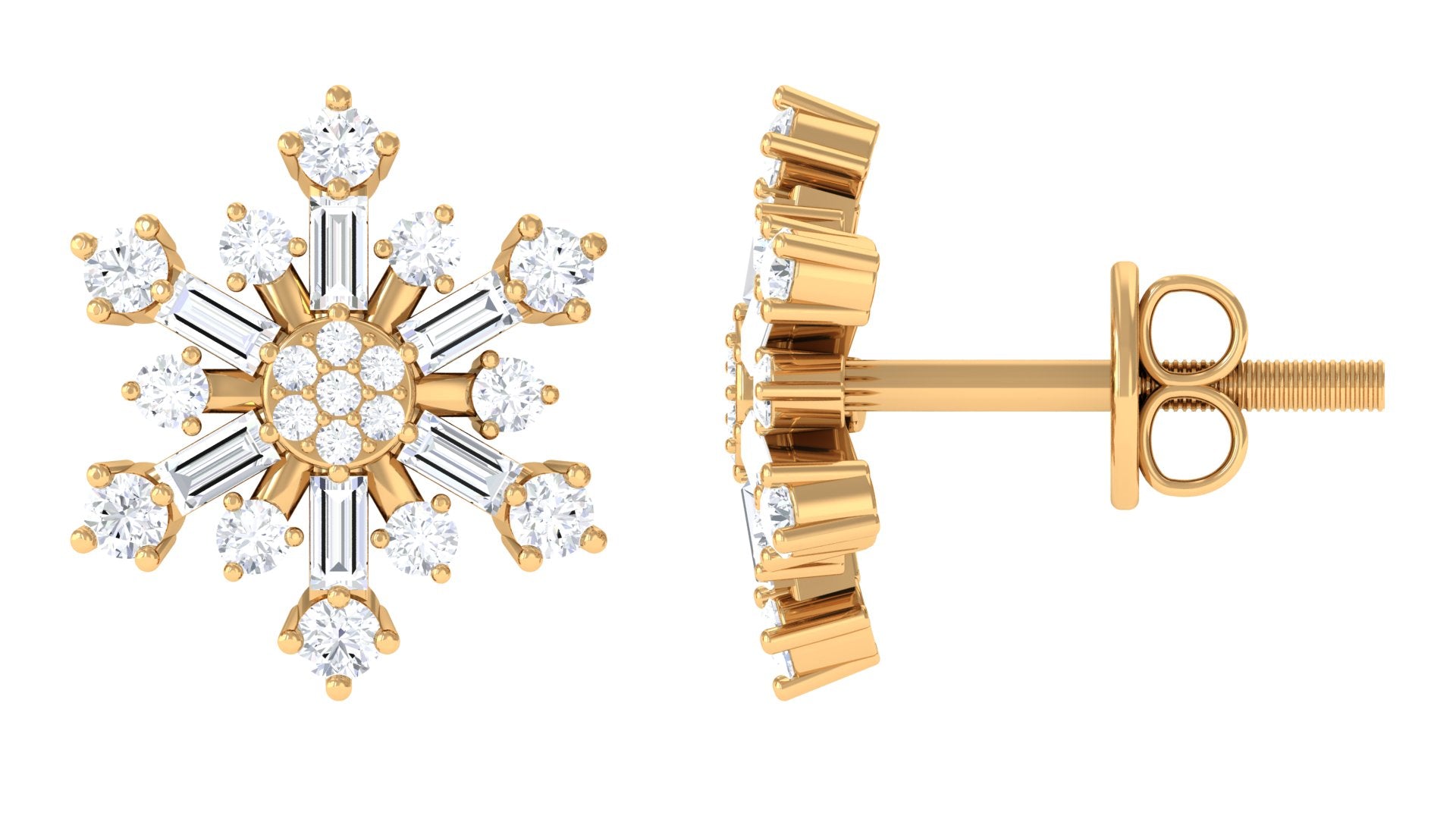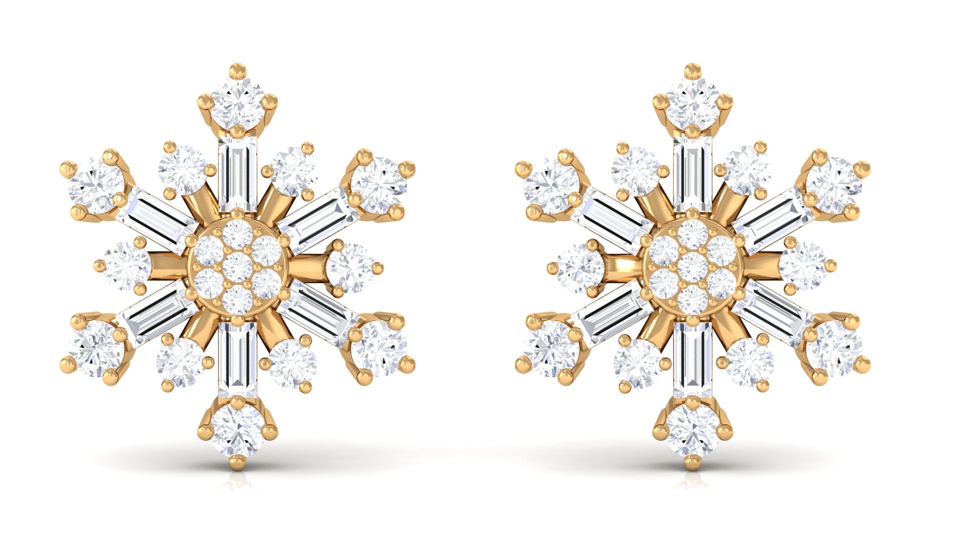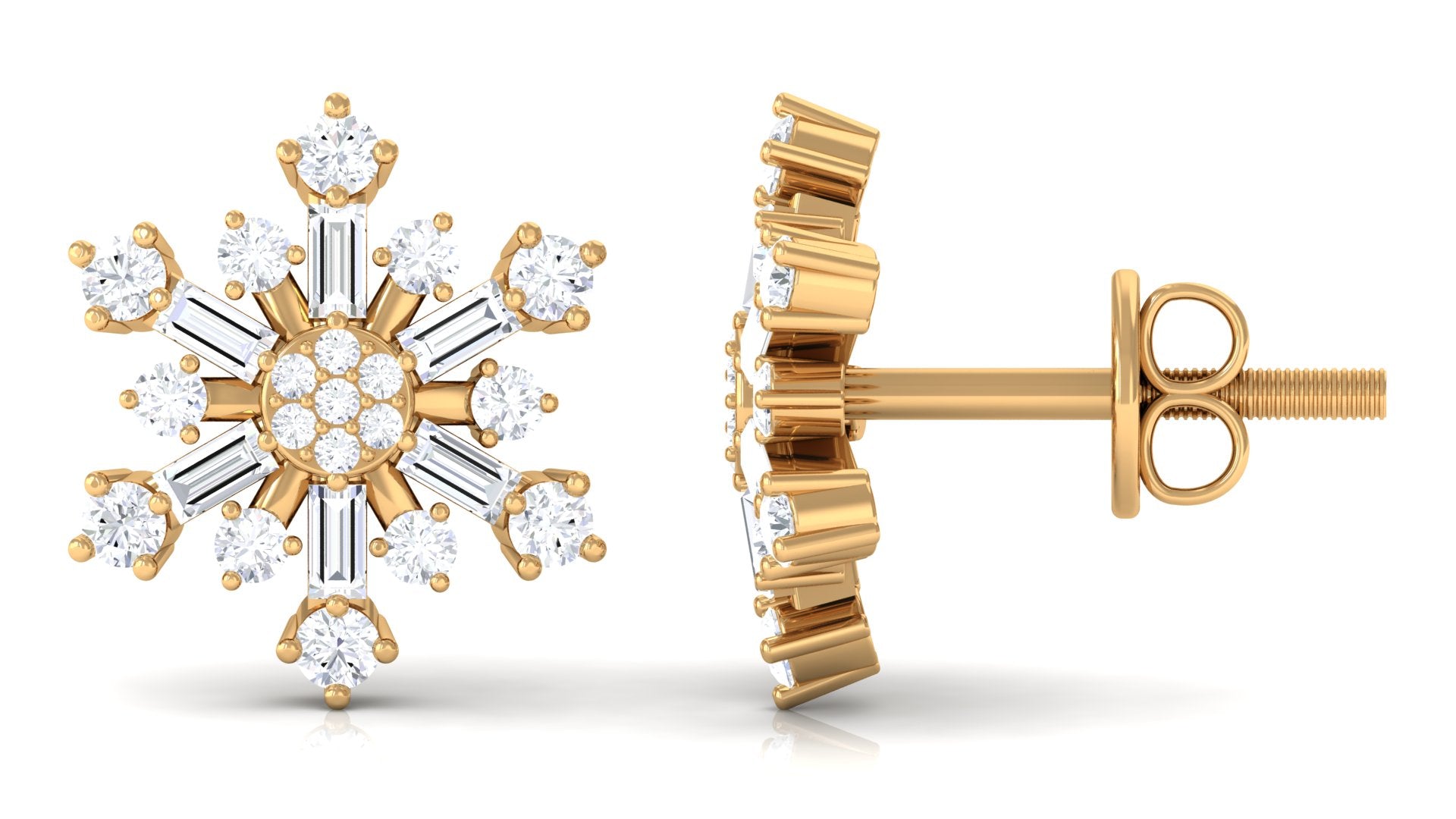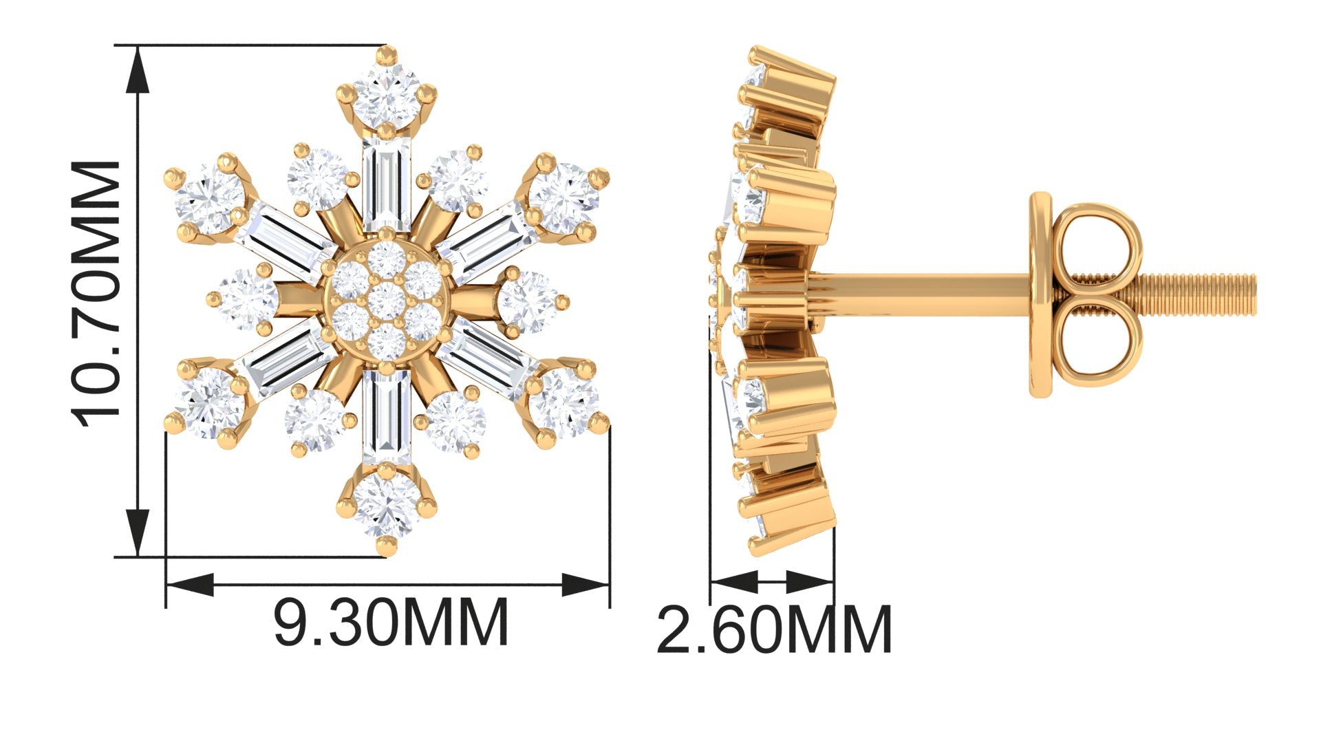 Handcrafted to complement the magic of the holiday season, these Snowflake Earrings bring a touch of winter sparkle to every moment. Designed with delicate snowflake motifs, each earring glimmers with Round and Baguette Shape Diamond stones that catch the light like freshly fallen snow. Their festive charm makes them perfect for adding an elegant shine to your Christmas outfits, whether you are attending a gathering, a holiday party or simply enjoying an evening by the tree. The secure Screw Back Closure ensures they stay comfortably in place, giving you peace of mind as you celebrate and make memories. Beautifully detailed, these Diamond Snowflake Earrings offer just the right amount of shimmer without feeling too bold. Presented in a signature jewelry box and ready to gift, these Diamond Stud Earrings make a thoughtful surprise for someone who loves the sparkle of the season. These Diamond Earrings for Women capture the warmth, wonder and enchantment that make Christmas truly unforgettable.