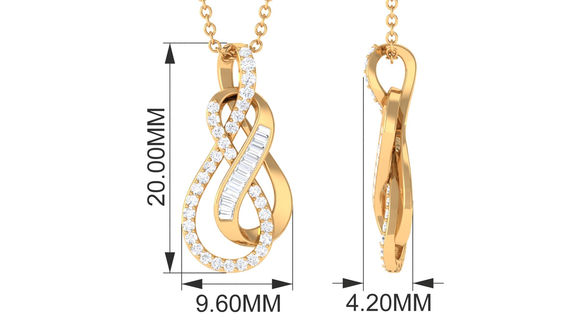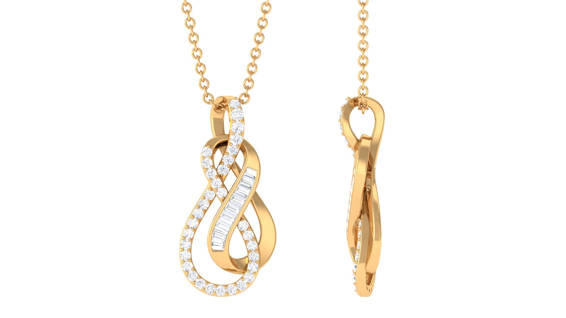 Make your special evening even more unforgettable with this exquisite Infinity Pendant, designed with interlocking loops of lustrous gold. Adorned with a stunning combination of round and baguette-cut Diamond, this Infinity Necklace shimmers and sparkles with captivating beauty. Whether worn alone or paired with other jewelry, this pendant is the perfect accessory to add a touch of sophistication and glamour to any outfit. So get ready to shine and make a statement with this lovely Infinity Pendant, and create memories that will last a lifetime.