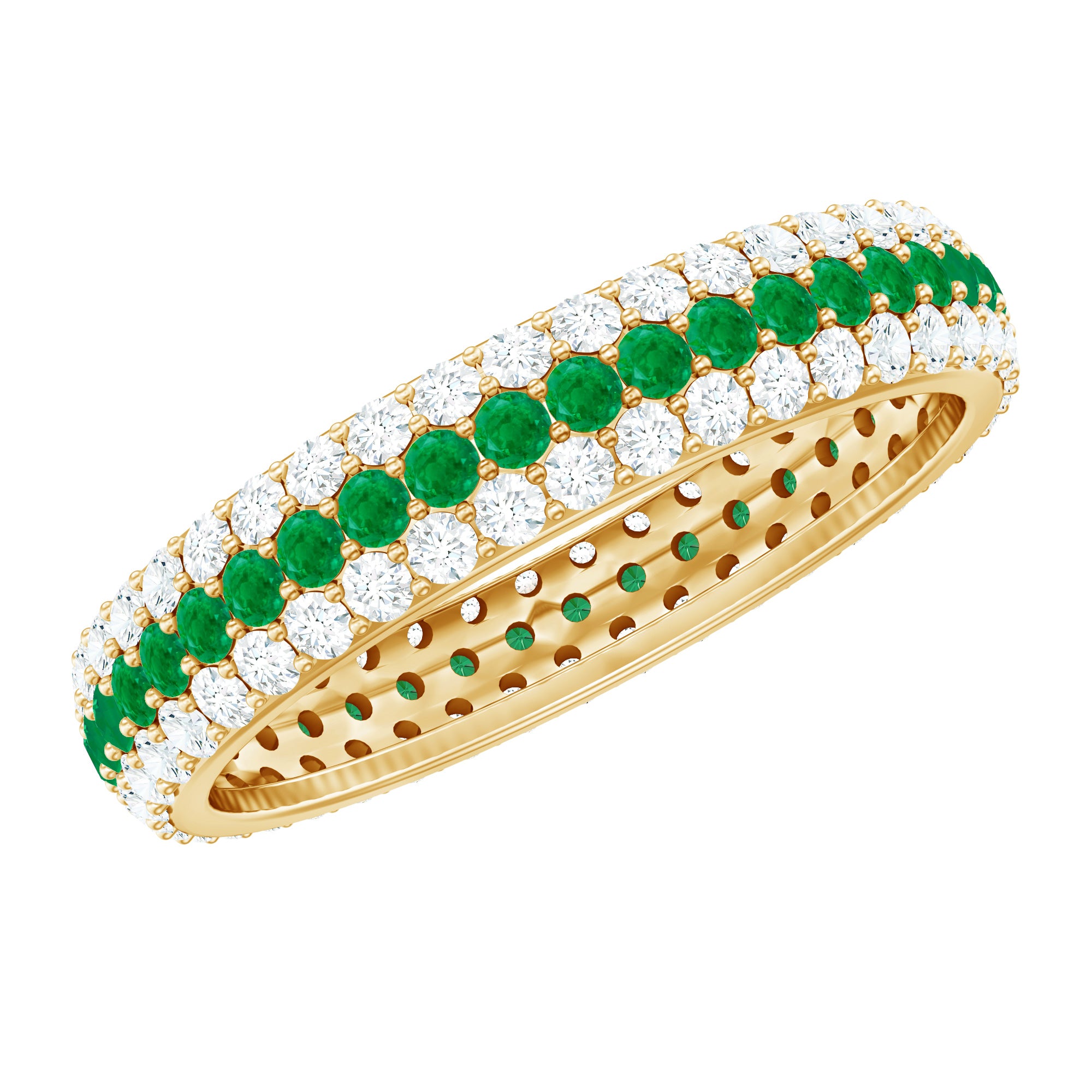 Looking for a ring that truly shows the strength and beauty of love? This Emerald and Diamond Band Ring is a perfect choice. It features a unique design with three rows that catch the eye. The middle row is filled with round cut emerald stones, shining bright with a rich green color. On each side of the emeralds, there are rows of sparkling diamonds that add extra shine and elegance. Together, these stones create a full eternity band that looks stunning from every angle. This Pave Wedding Band is not just beautiful but also full of meaning. It stands for a love that lasts forever and a bond that grows stronger with time. The combination of AAA quality emeralds and HI-SI quality diamonds gives the Three Row Eternity Band a magical touch, making it a special piece for any woman who wants to add color and sophistication to her style. The design is elegant yet classic, making it suitable for everyday wear or special occasions. It is a great choice as a wedding band or an anniversary gift, something that will always remind you of your cherished moments together. Made with care to last, this Emerald Wedding Band is a symbol of commitment and beauty. Its sparkling stones and timeless design make it a lovely heirloom to pass down and treasure for years to come.