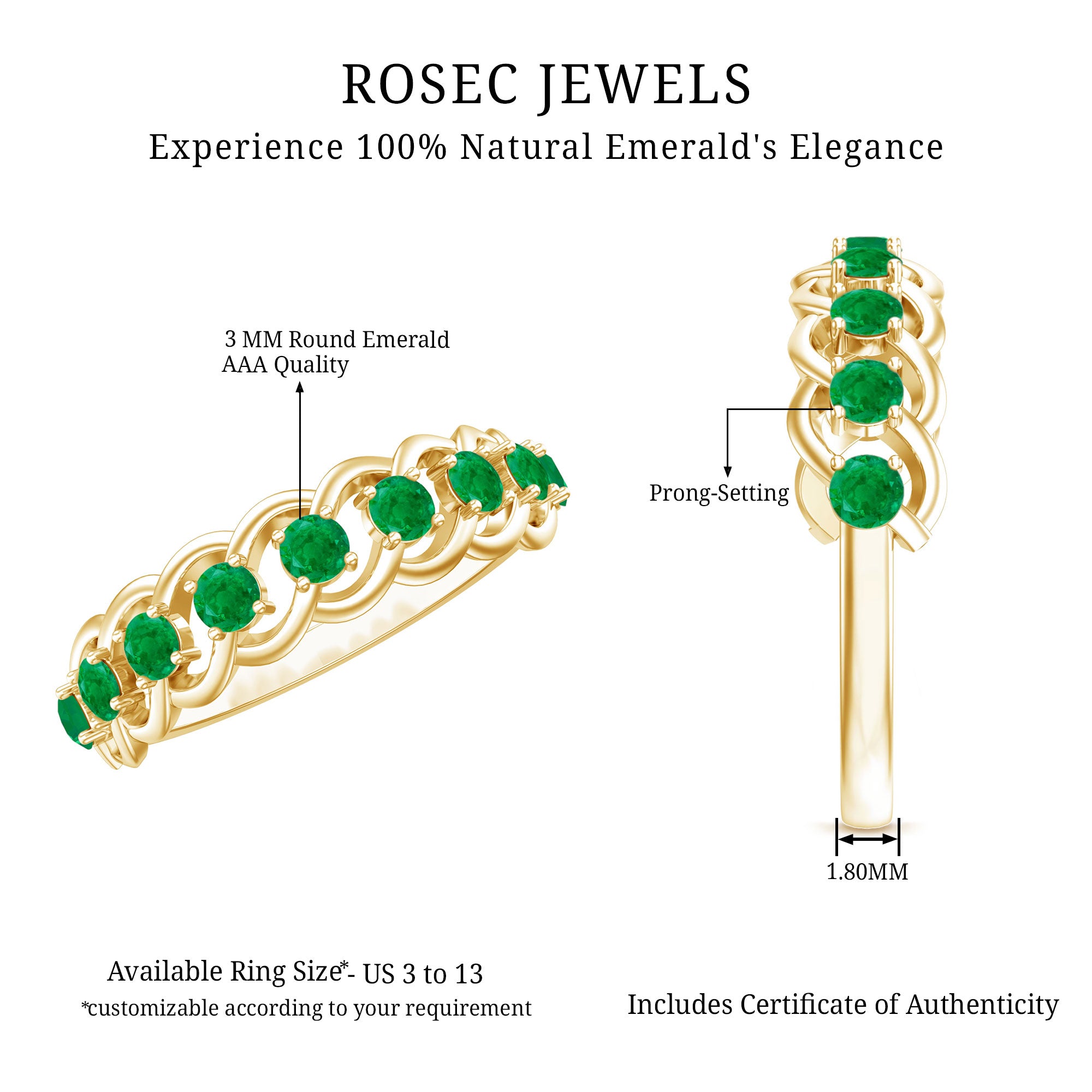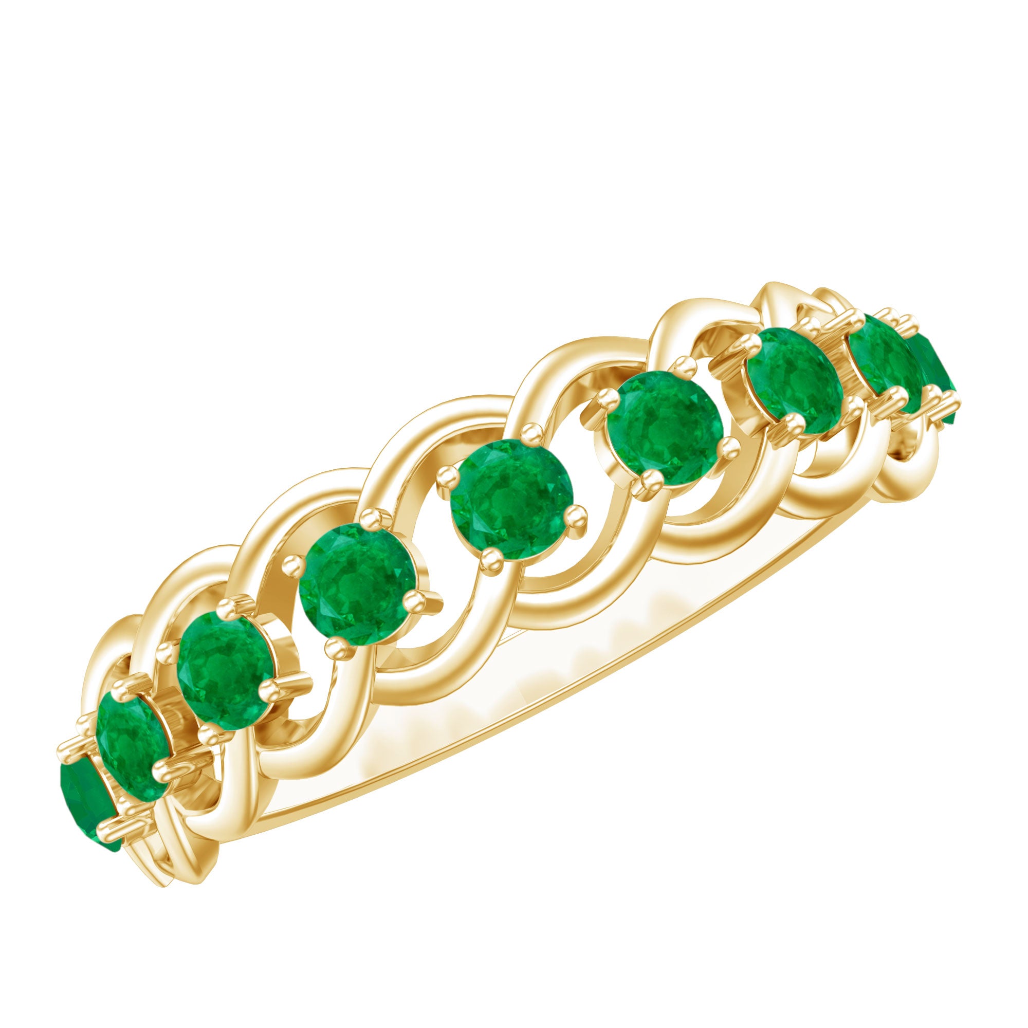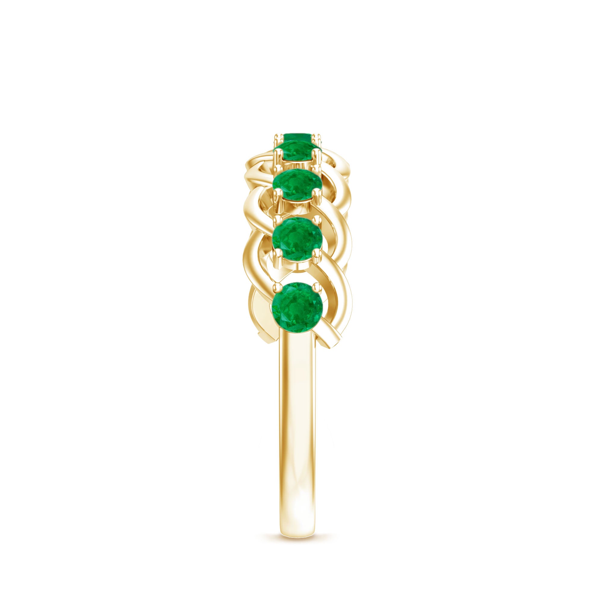 Weave your love into something extraordinary with this Half Eternity Band, a ring that beautifully blends timeless elegance with intricate design. The enchanting Braided pattern, crafted with perfection, creates a unique sense of movement and depth, symbolizing the twists and turns of a love that only grows stronger. The vibrant Emerald stones are carefully placed over the braided band, their rich green hue a perfect reflection of enduring strength of your bond. This Braided Ring captures the essence of love that is constantly evolving while remaining deeply rooted in tradition. Its elegant design adds just the right touch of sophistication, making this Emerald Band Ring the perfect choice for an anniversary, milestone or any occasion that celebrates your unique journey together. Whether worn alone or stacked with other bands, this Emerald Anniversary Ring is a timeless reminder of the love you share, radiant and unbreakable. Presented in a signature jewelry box and available in various sizes, this Fine Band is ready to accompany you on your journey of forever.