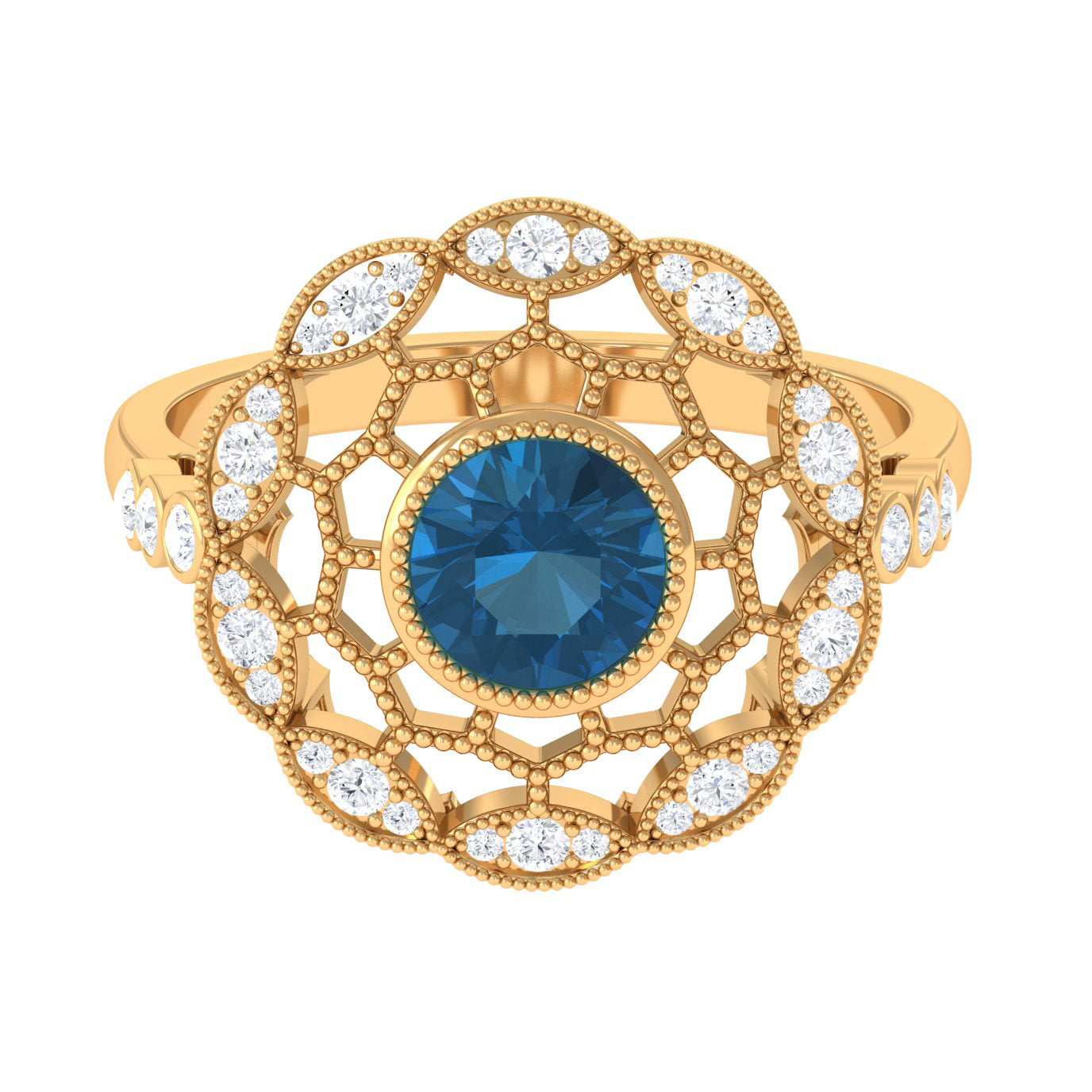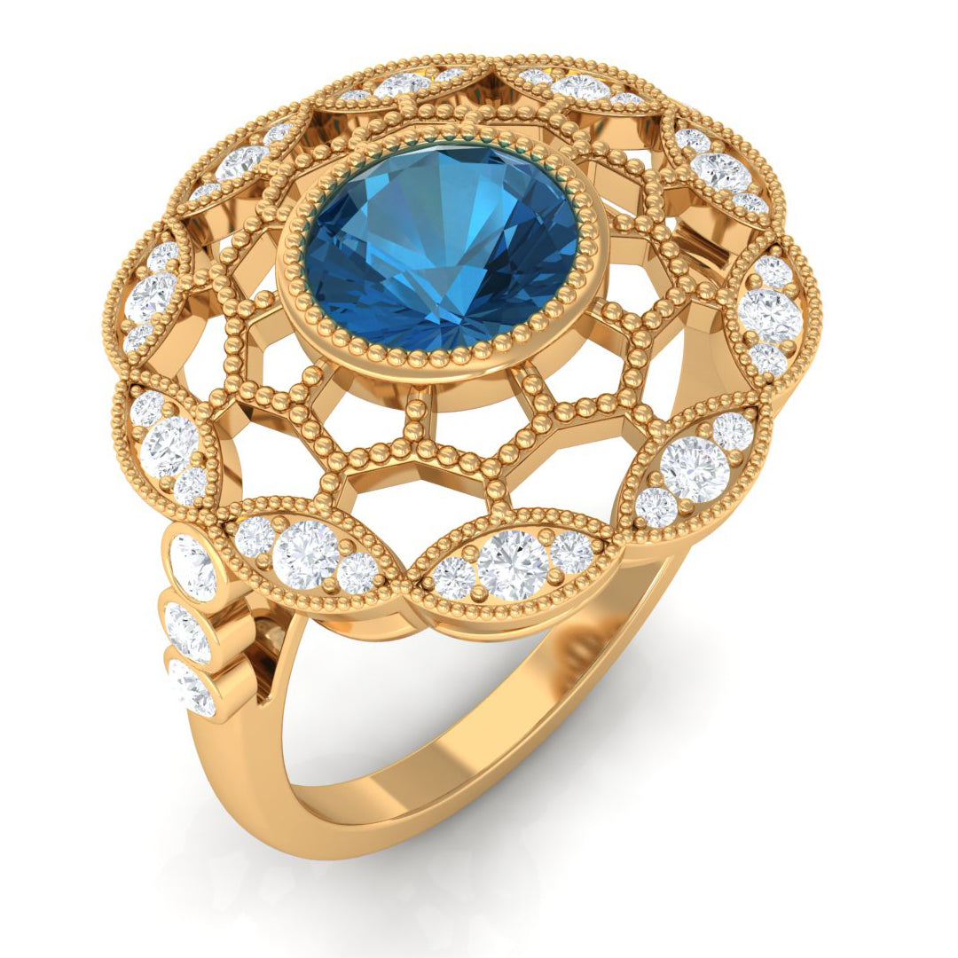 This exquisite Floral Engagement Ring represents a distinctive fusion of craftsmanship and brilliance, intended to elevate every occasion. At its core lies a stunning 7 MM round cut london blue topaz, securely fastened by a bezel setting. Encircling the central stone is a floral halo, artfully designed with small round diamond stones arranged to resemble delicate in a marquise shape metal design and beaded details. This design imparts the Cocktail Engagement Ring with a sophisticated yet striking character that exudes elegance and freshness. The overall appearance combines modern structure with floral delicacy, making it perfect for those who value exquisite design with a personal touch. Whether selected as an engagement ring or worn as a bold cocktail piece, this London Blue Topaz Engagement Ring effortlessly captures attention. The flower motif introduces a romantic essence, while the split band and meticulous stone arrangement provide a unique, contemporary flair. The AAA quality london blue topaz and HI-SI Diamond stone delivers exceptional brilliance and is recognized for its durability, rendering this Dinner Ring ideal for both daily wear and special events. It serves as a wonderful means to convey individuality and style through a piece that is both meaningful and beautifully crafted.