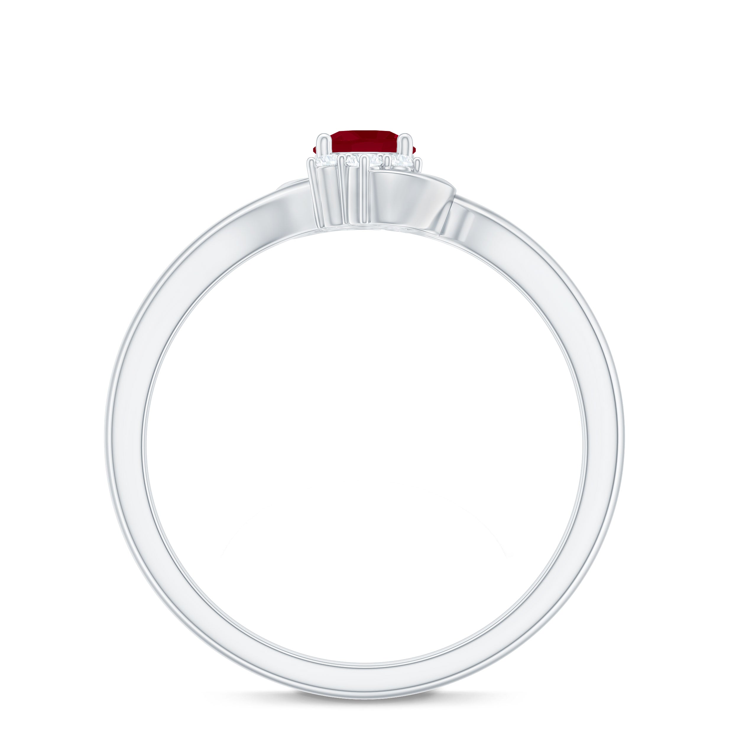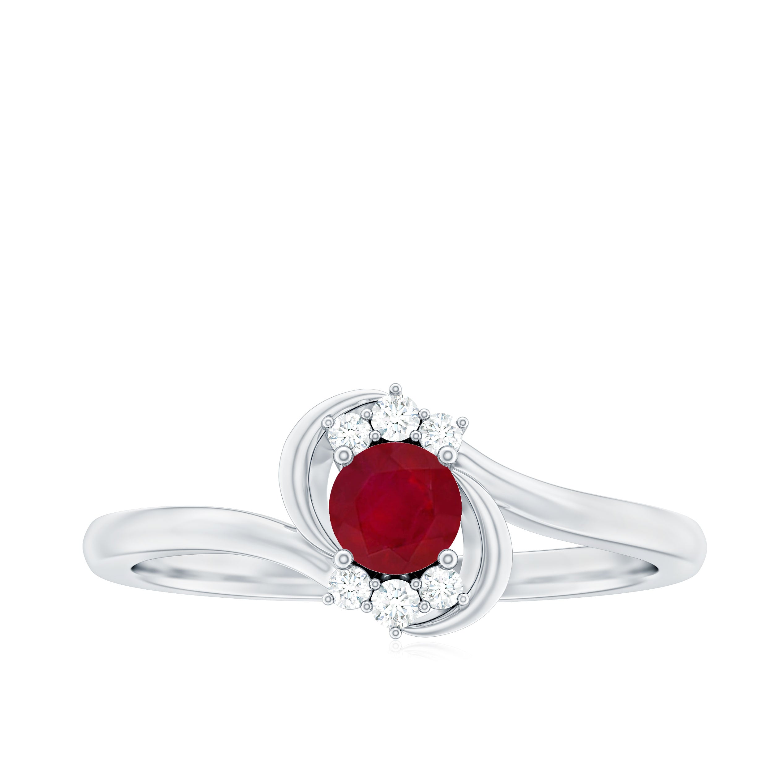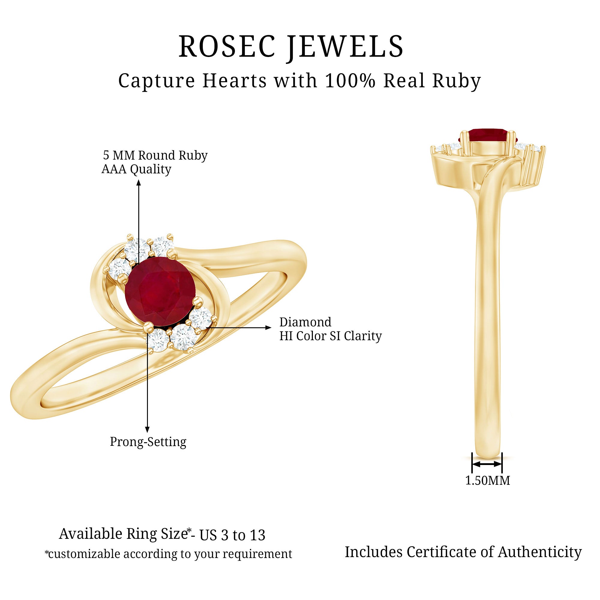 This Ruby Promise Ring awaits to celebrate your modern day love in style! Serving as the center point of all our attention, the Centerpiece of 5 MM Round Shape Ruby allures with its romantic pop of red, accentuated by sparkling three stones of Round Shape Diamond on either sides. All the stones rest on a Bypass Shank that lends a contemporary touch to the design of this Certified Ruby Ring.