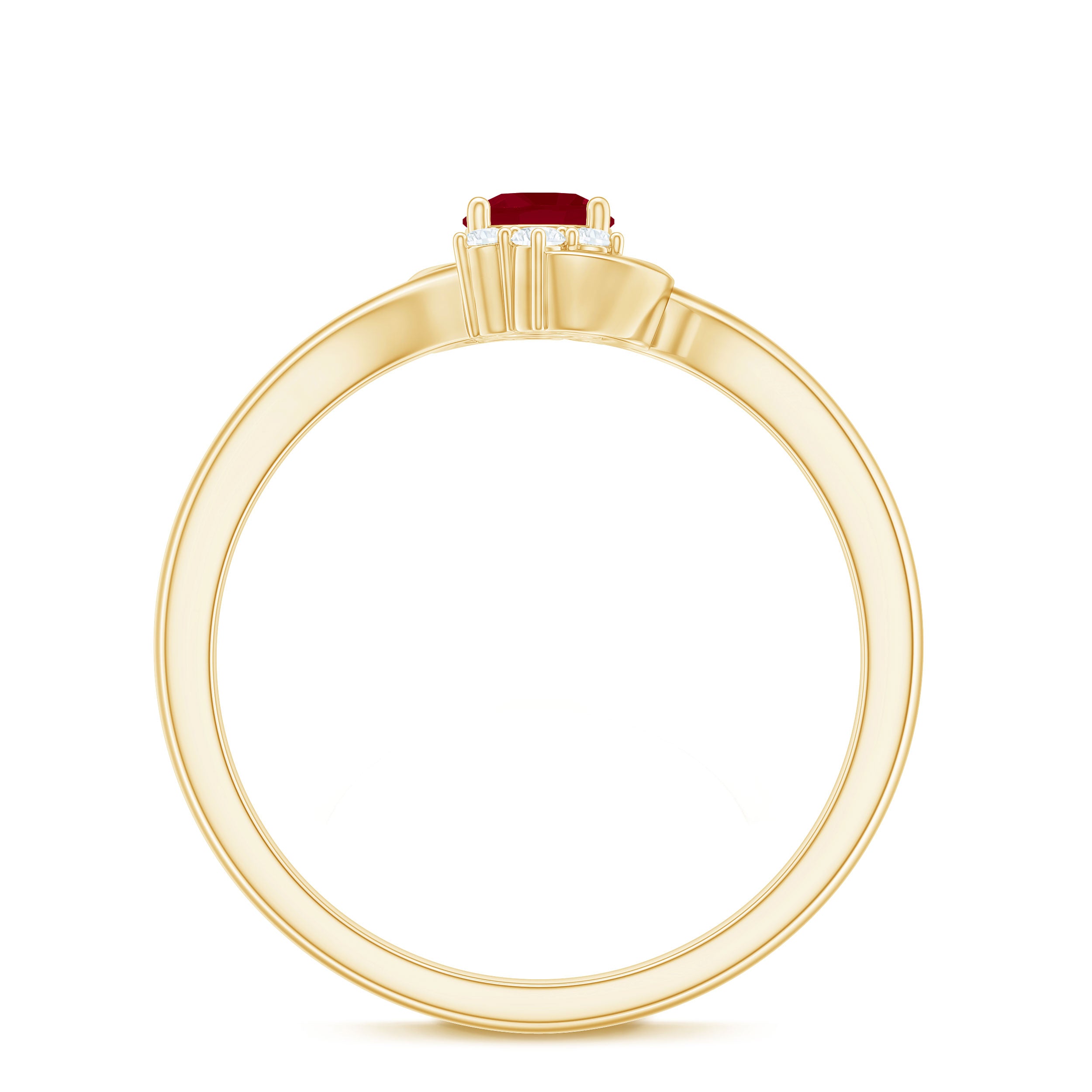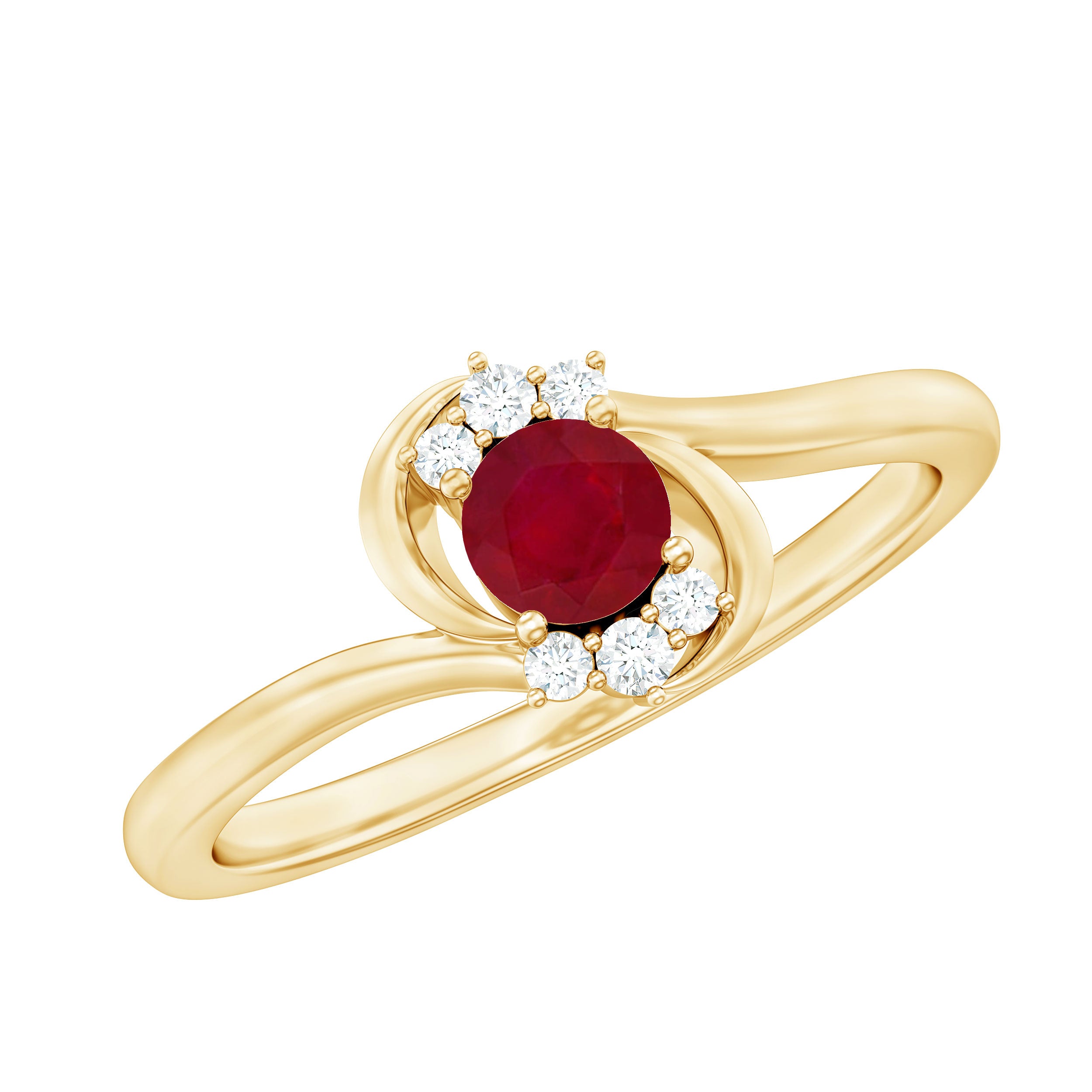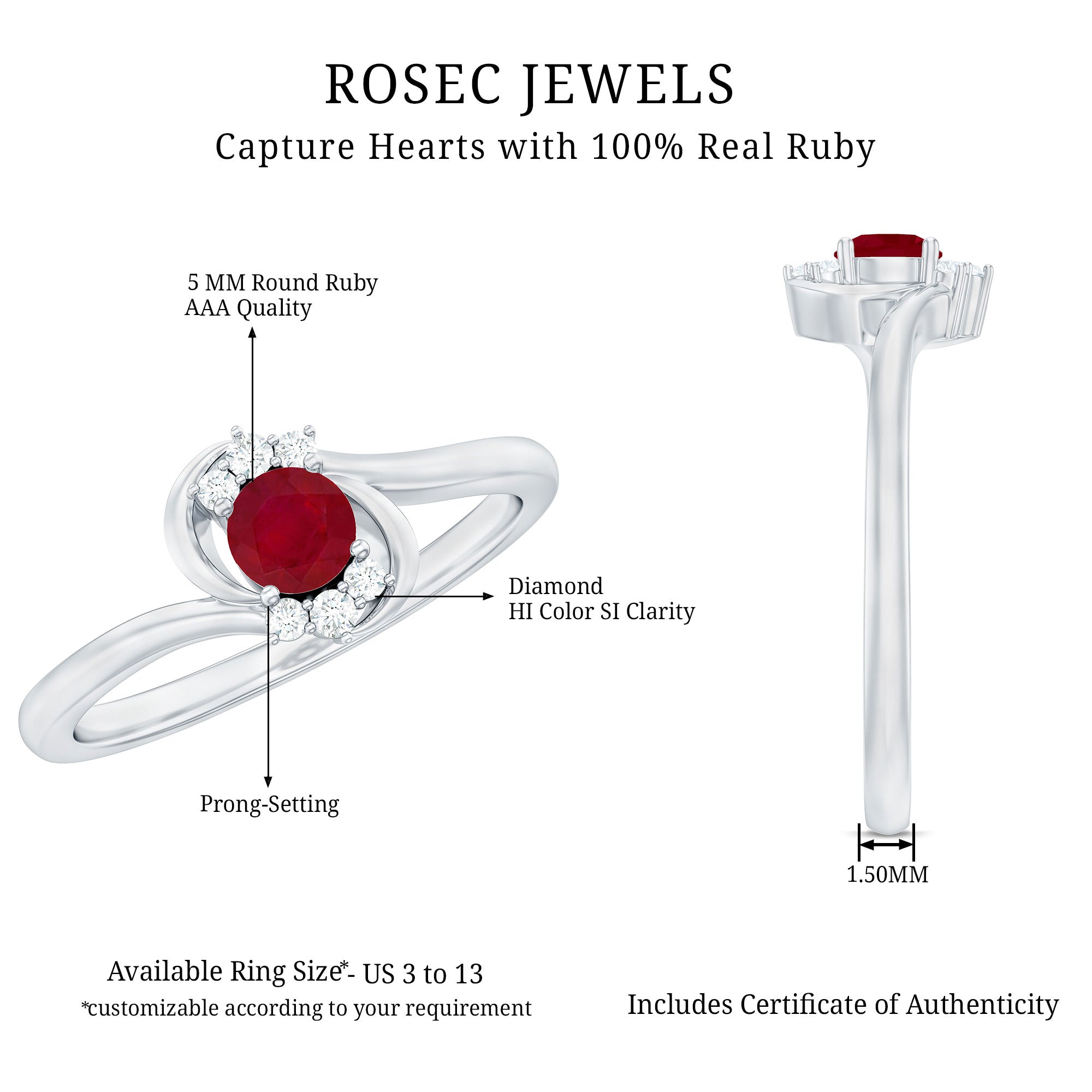 This Ruby Promise Ring awaits to celebrate your modern day love in style! Serving as the center point of all our attention, the Centerpiece of 5 MM Round Shape Ruby allures with its romantic pop of red, accentuated by sparkling three stones of Round Shape Diamond on either sides. All the stones rest on a Bypass Shank that lends a contemporary touch to the design of this Certified Ruby Ring.