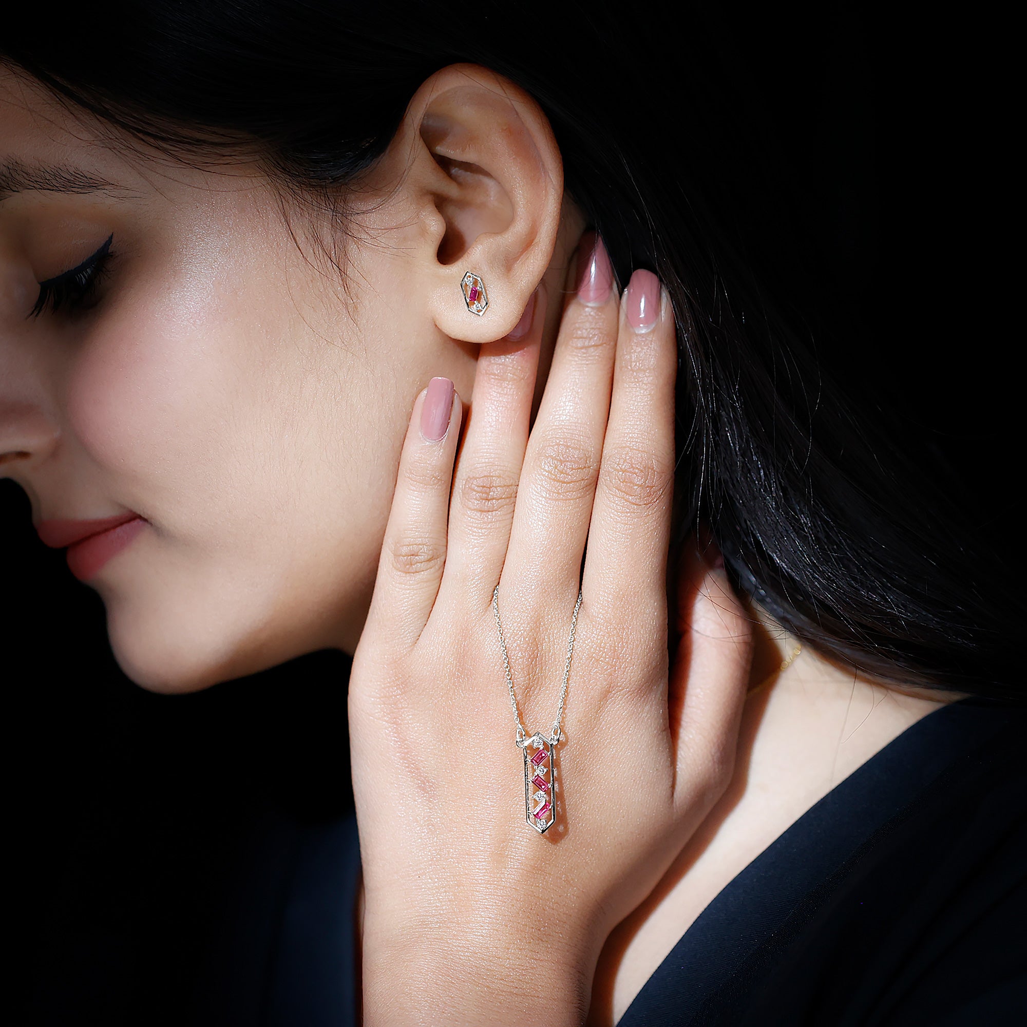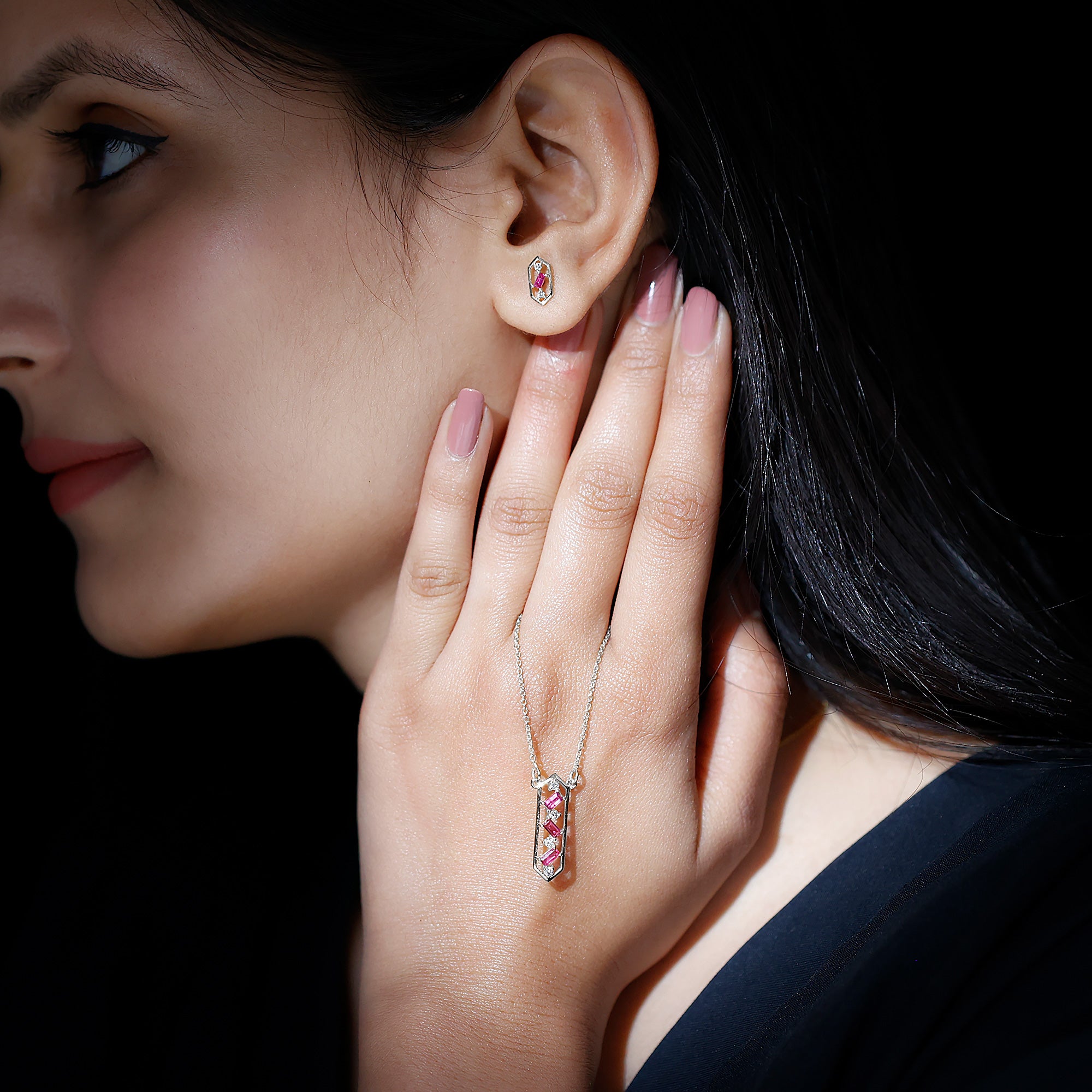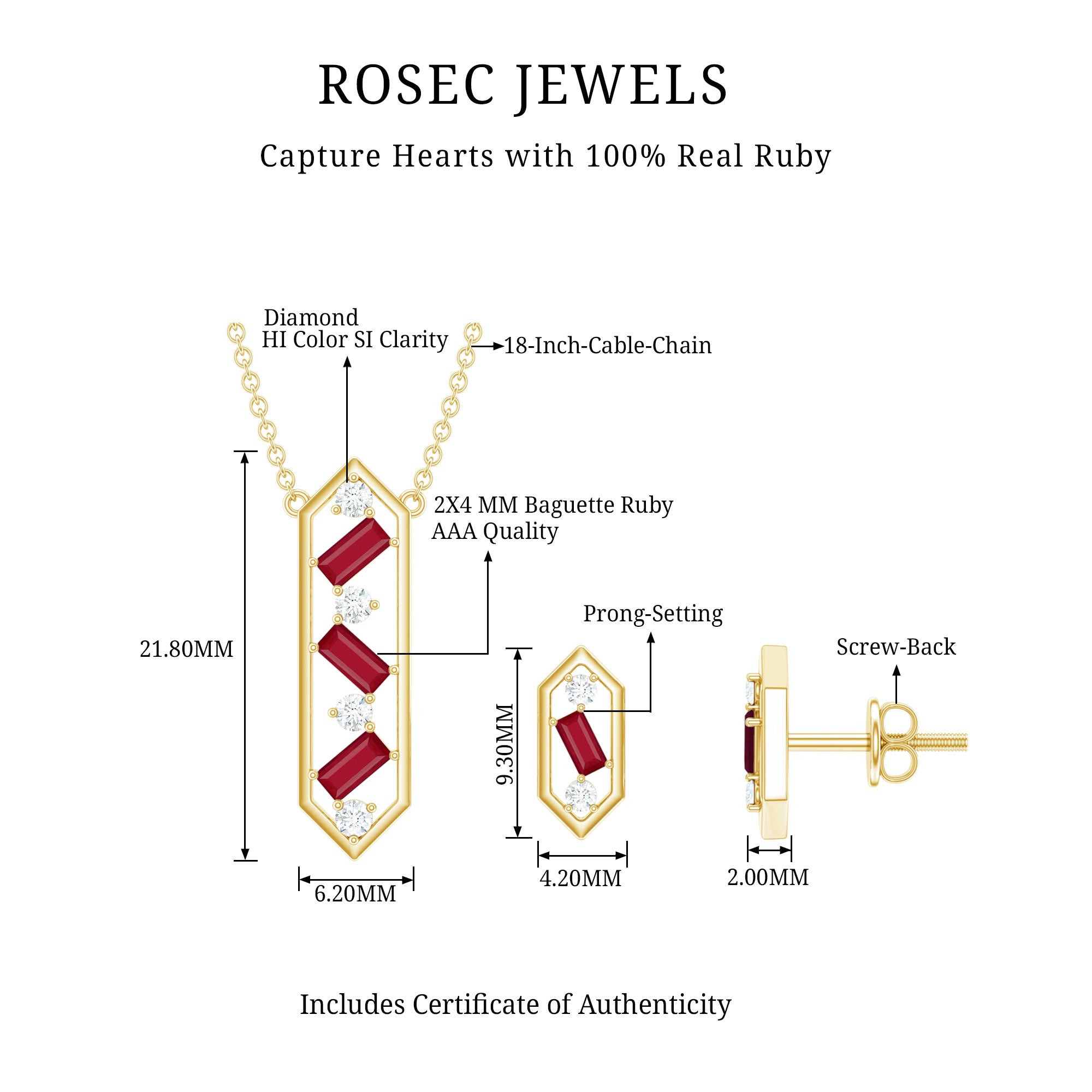 Make a stylish statement with this Contemporary Jewelry Set. Featuring stunning baguette cut Ruby stones paired with round Diamond stones set in prong setting in the center of an open hexagon shaped bar, this Necklace and Earrings Set offers a modern take on classic jewelry styles. The elongated design adds movement and elegance to the pieces, making them the most suitable choice for any special occasion. Add this Ruby and Diamond Necklace Set to your jewelry collection for sophistication and luxury. The necklace hangs from a delicate cable chain that is both strong and stylish, while the earrings come with secure screw back closures, so you can wear them comfortably all day long. This Geometric Pendant and Earrings is perfect for women who love simple yet striking pieces of jewelry. Presented in a signature jewelry box, making it a thoughtful and personal surprise that is ready to gift.