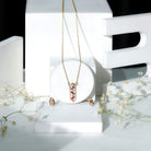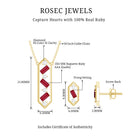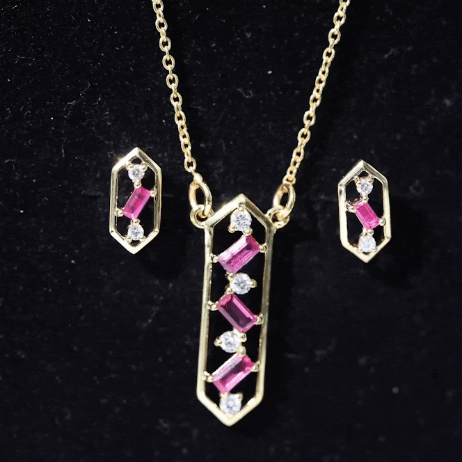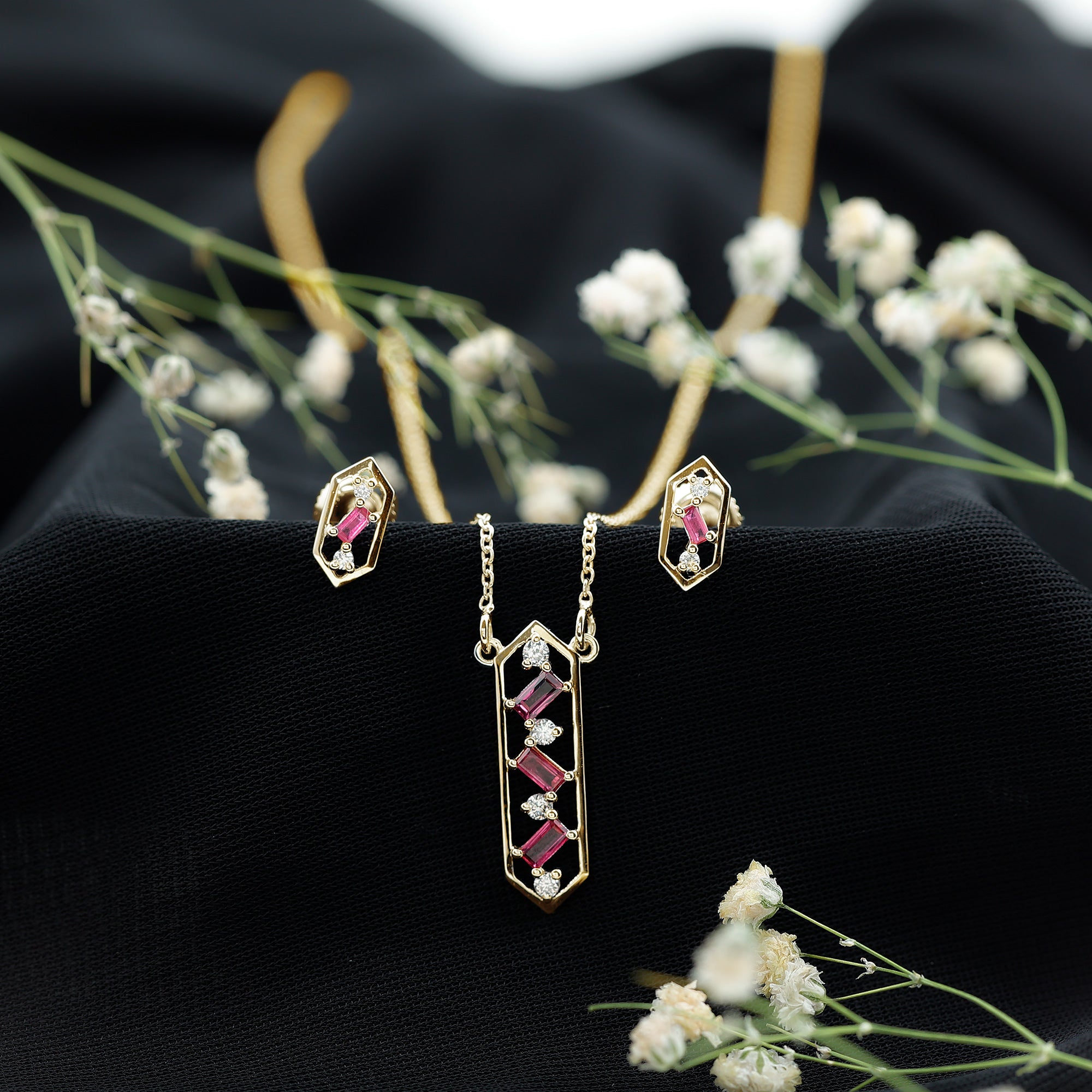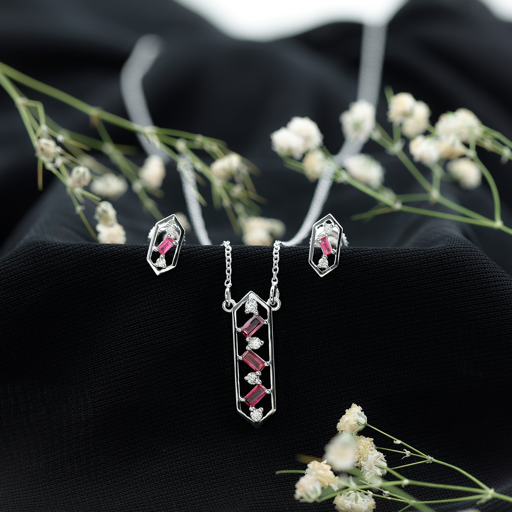 Make a stylish statement with this Contemporary Jewelry Set. Featuring stunning baguette cut Ruby stones paired with round Diamond stones set in prong setting in the center of an open hexagon shaped bar, this Necklace and Earrings Set offers a modern take on classic jewelry styles. The elongated design adds movement and elegance to the pieces, making them the most suitable choice for any special occasion. Add this Ruby and Diamond Necklace Set to your jewelry collection for sophistication and luxury. The necklace hangs from a delicate cable chain that is both strong and stylish, while the earrings come with secure screw back closures, so you can wear them comfortably all day long. This Geometric Pendant and Earrings is perfect for women who love simple yet striking pieces of jewelry. Presented in a signature jewelry box, making it a thoughtful and personal surprise that is ready to gift.