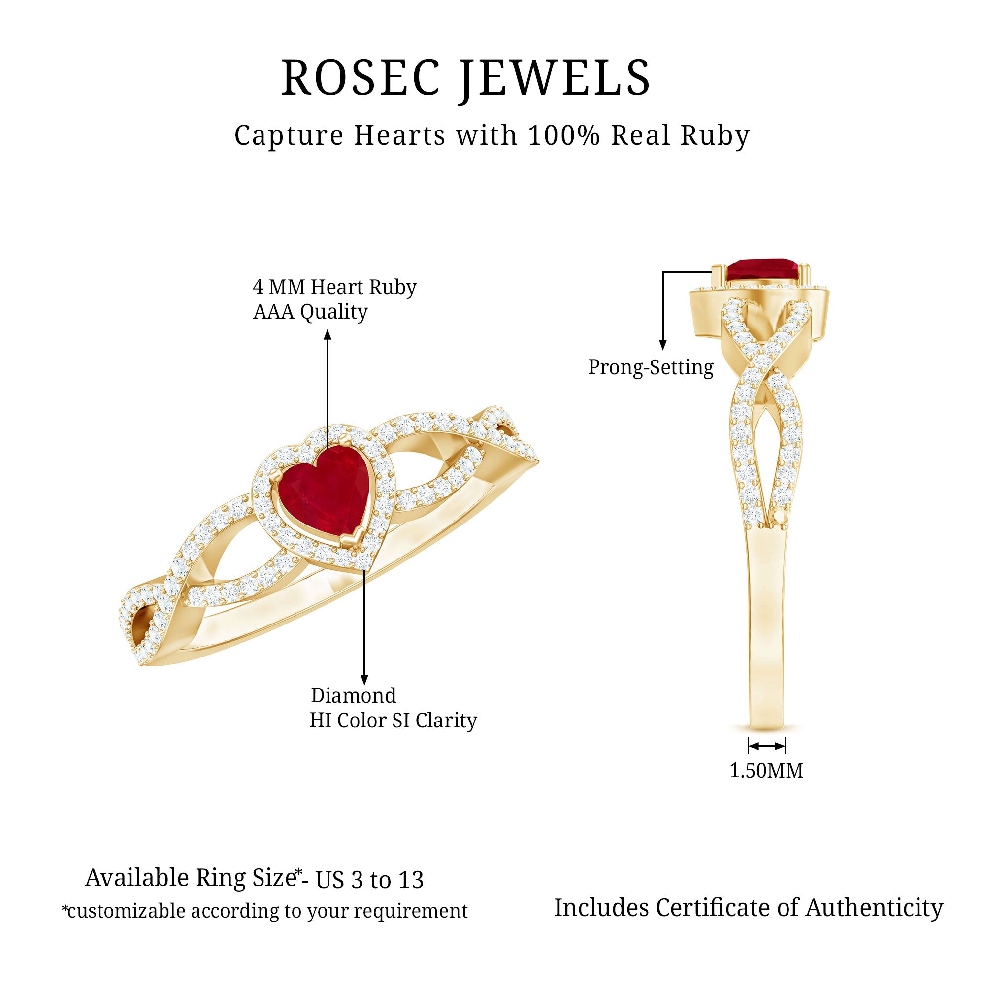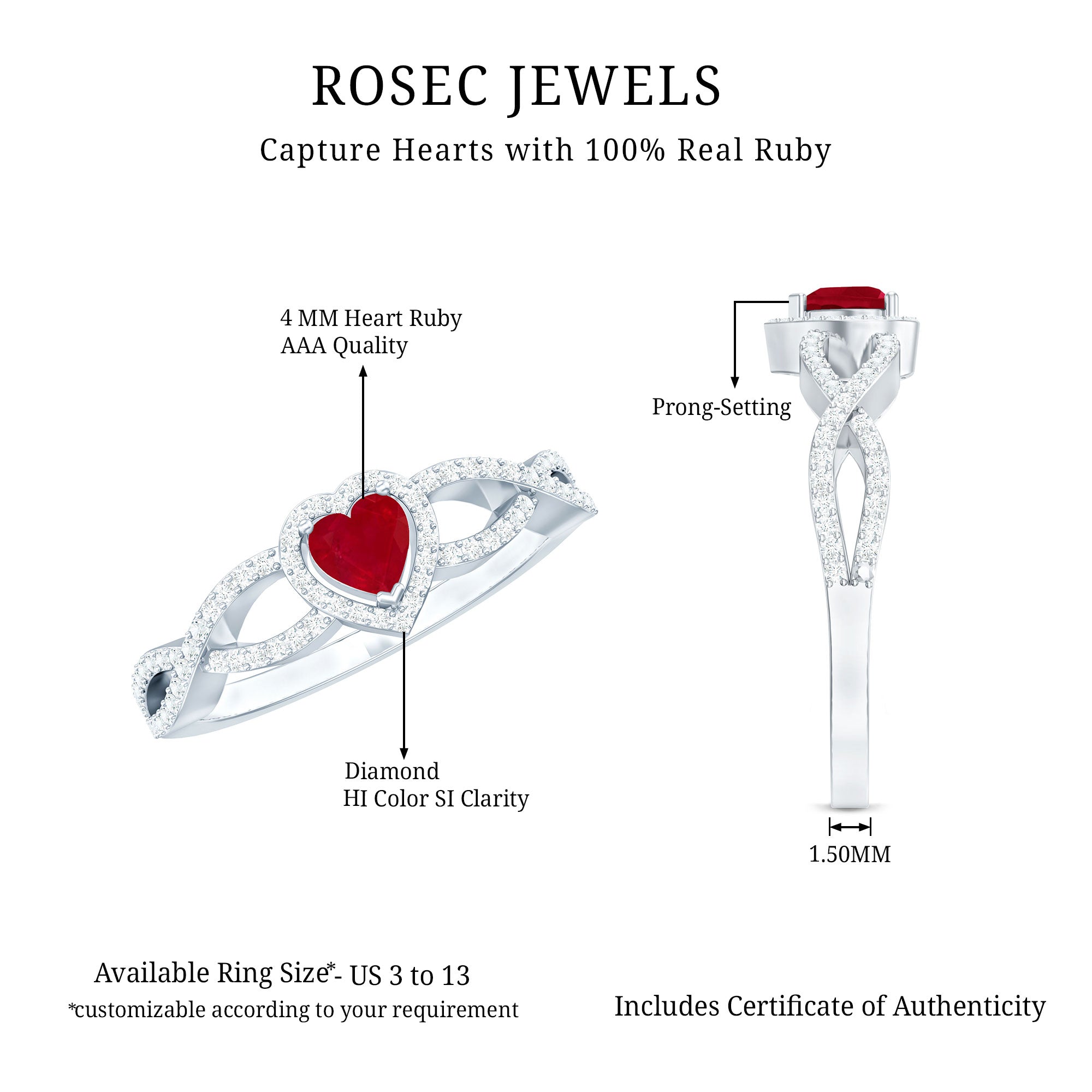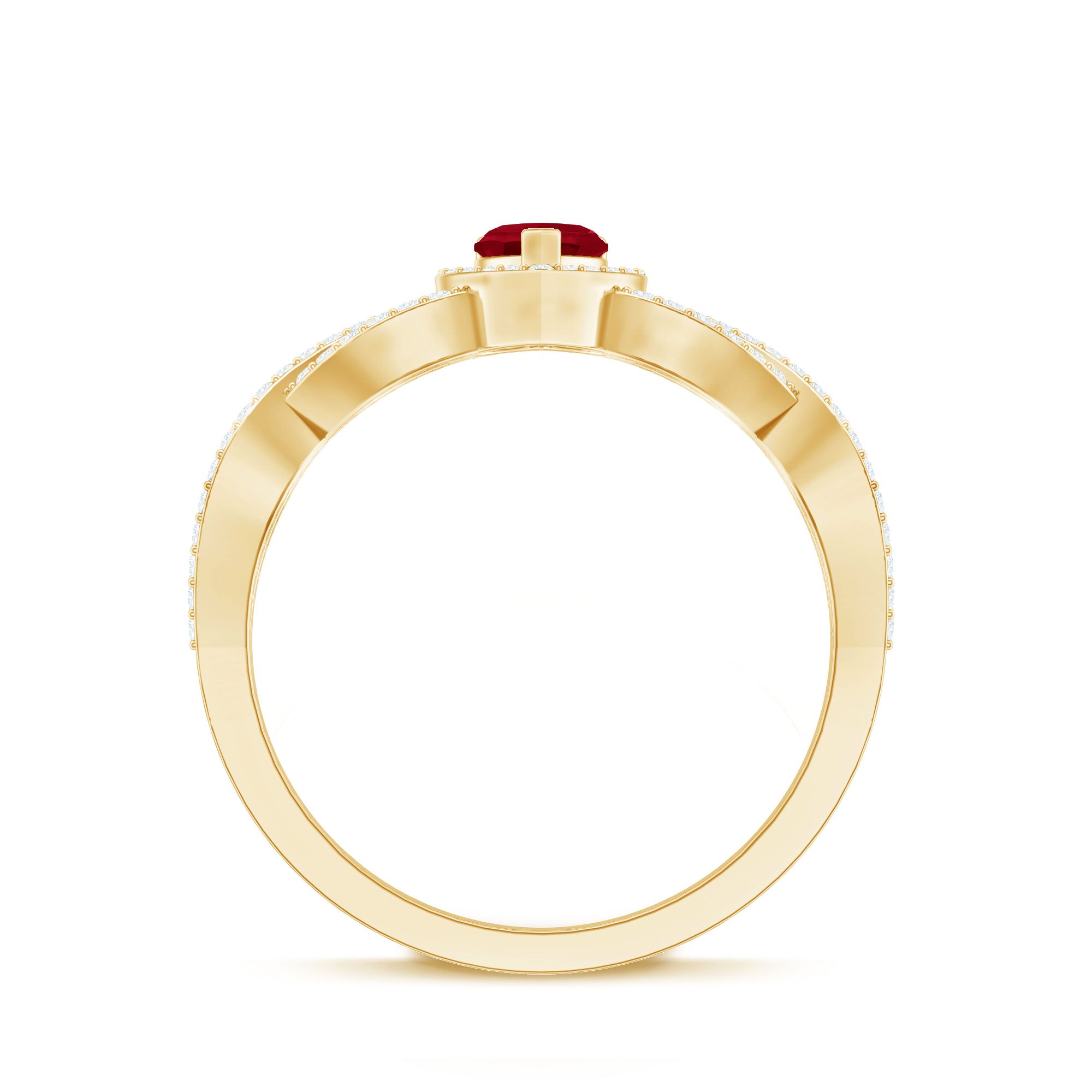 Add more sparkle to your big day with a symbol of love, this Heart Ring is a beautiful connotation of love. Ruby Diamond Engagement Ring is adorned with Crossover Shank, gives an enchanting appeal to the wearer. Get this Ruby Heart Engagement Ring for your partner and make her feel elated.