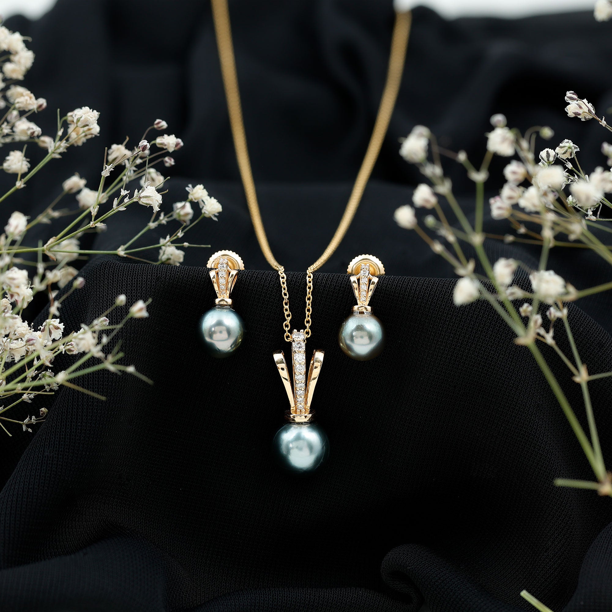 This Designer Necklace and Earrings Set is a stunning choice for any special event where elegance matters. The necklace features a radiant 10 MM round Tahitian pearl, which is accented by three metal bars at the top, the center one is beautifully studded with sparkling diamonds, adding a touch of brilliance and luxury to the design. The matching earrings showcase slightly smaller 9 MM round Tahitian pearls that complement the necklace perfectly. The screw back closures ensure the earrings stay secure and comfortable and the cable chain gives a dangling charm to the pendant, ideal for long hours during celebrations or ceremonies. This Tahitian Pearl Necklace Set balances classic beauty with modern details, making it a versatile choice for brides seeking timeless grace or anyone wanting a bold look. The deep hues of the pearls combined with the diamond sparkle create a captivating harmony that stands out with subtle sophistication. This Pearl and Diamond Jewelry Set is perfect for adding luxury and charm to your special day or gifting to someone dear.