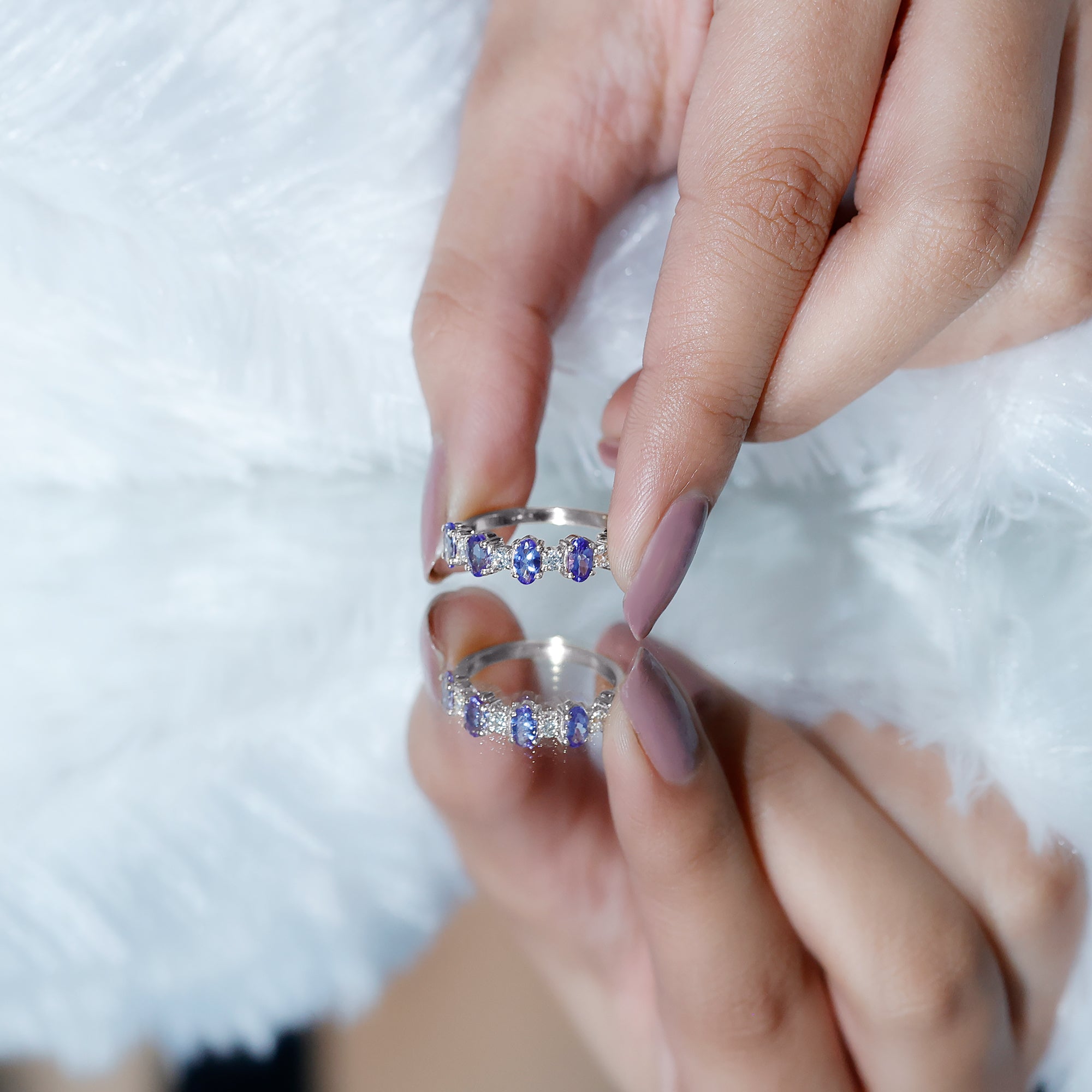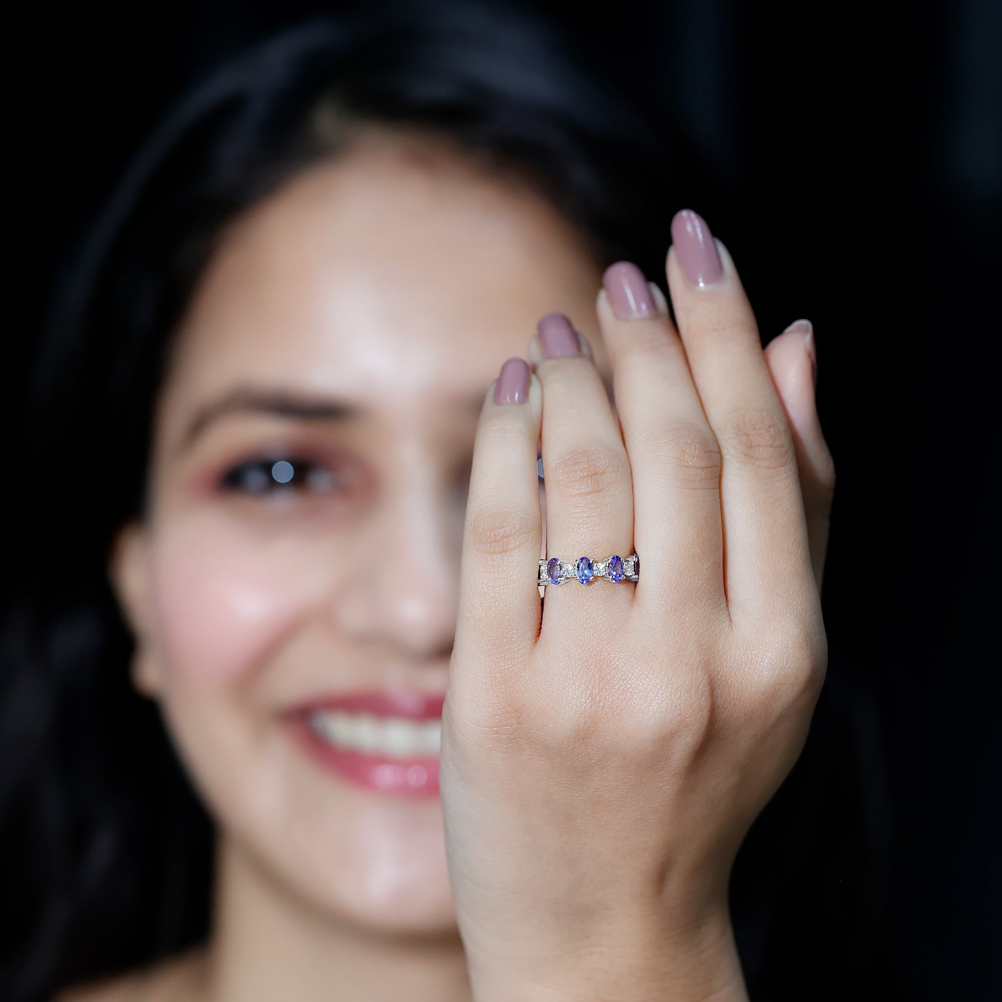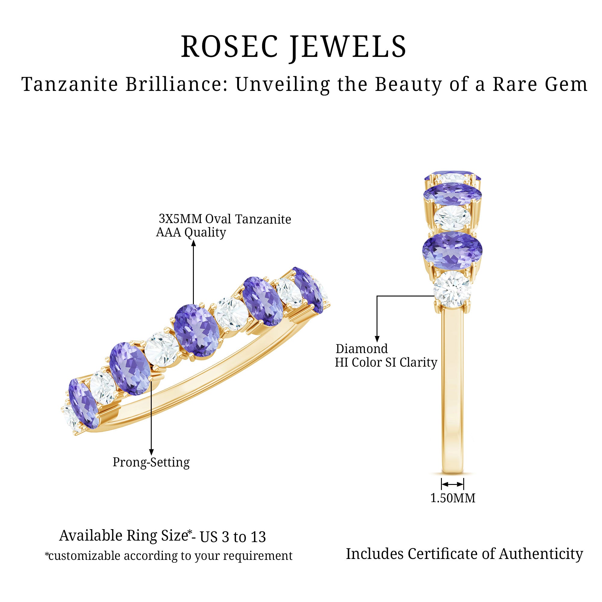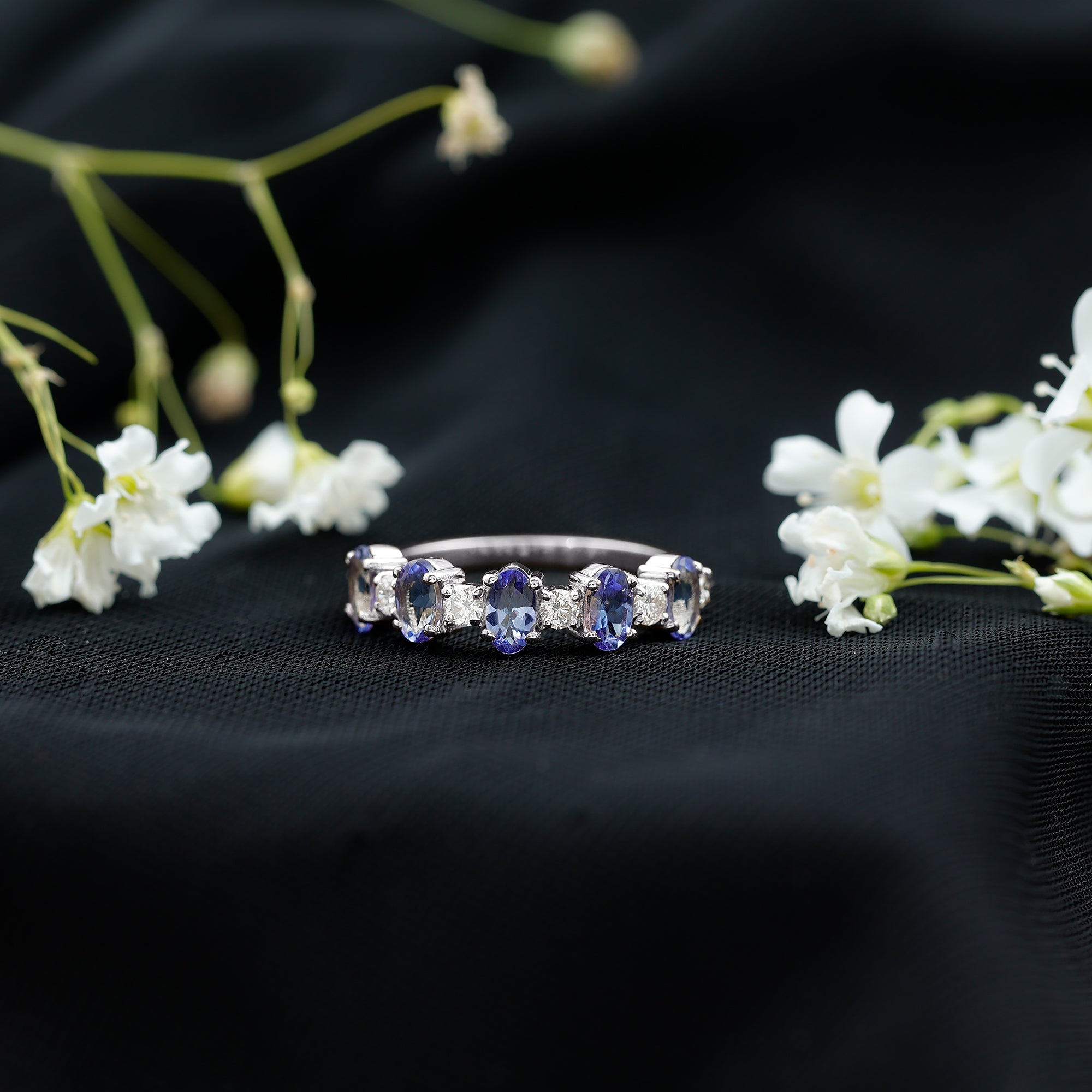 This glittering Half Eternity Ring features with Oval Cut Tanzanite in Prong Setting with Diamond sure to give you lots of compliments.