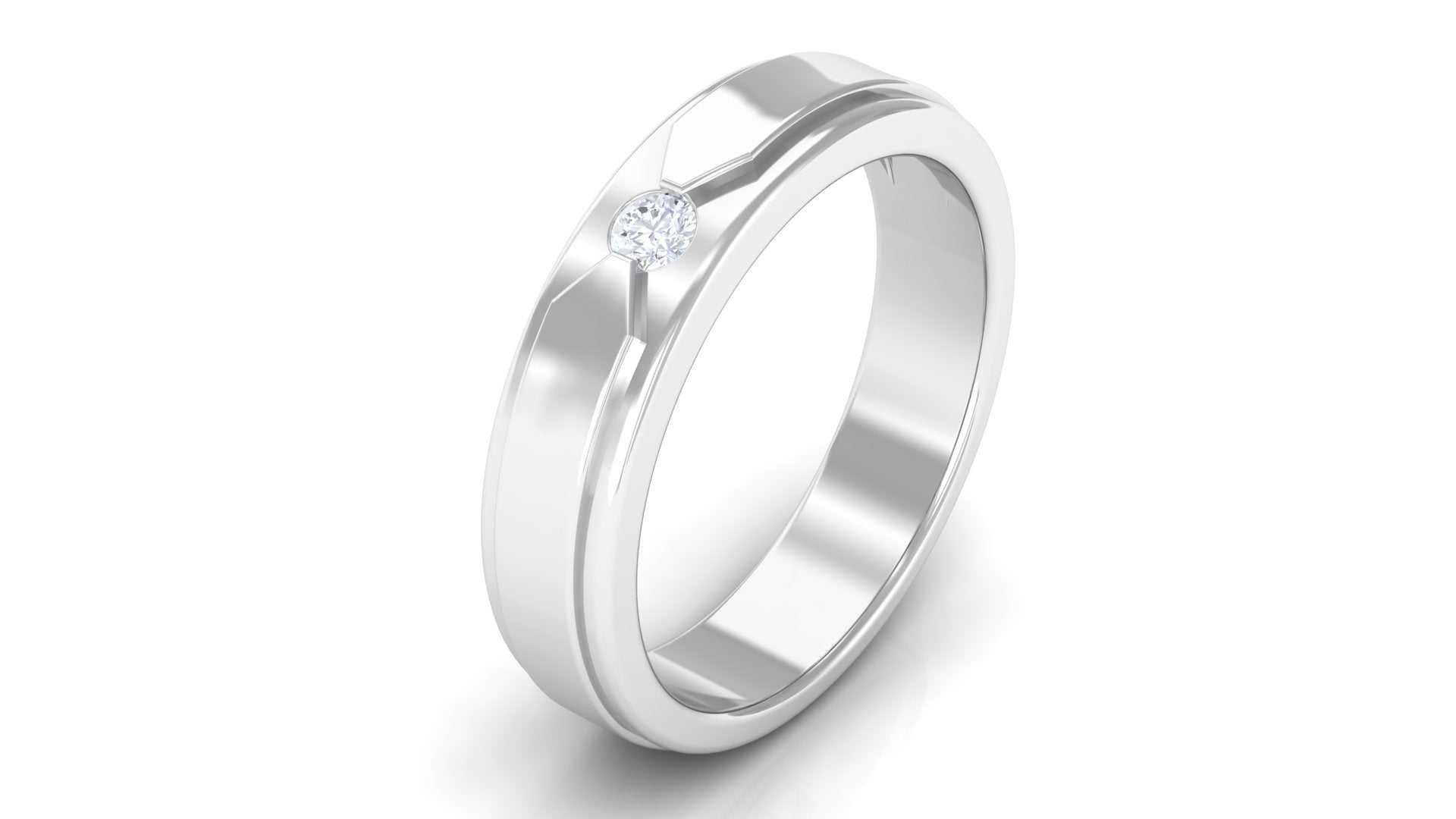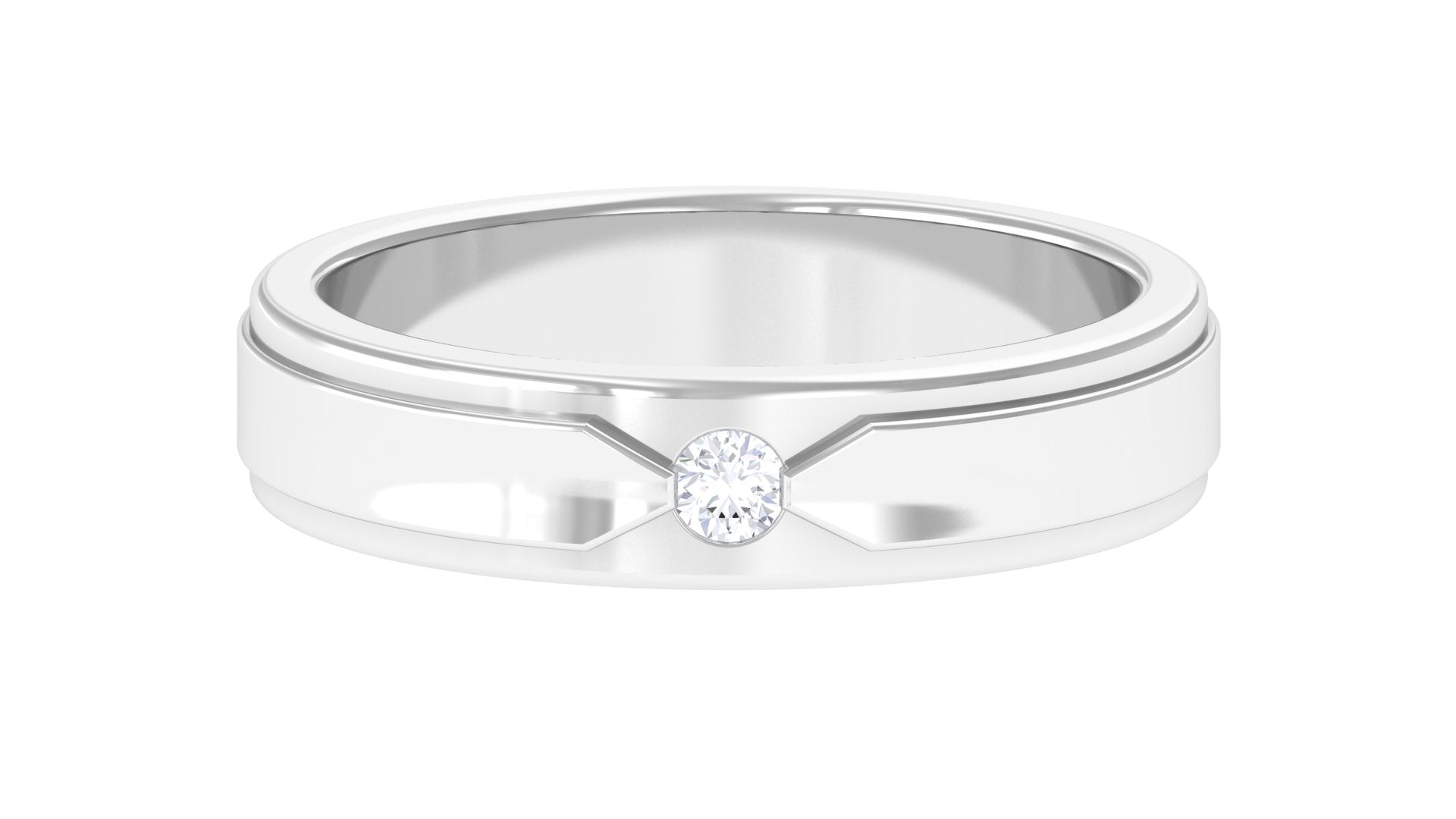 Surprise your man with this stunning Diamond Band Ring and show him how much you appreciate him. The Wedding Band Ring is composed in shining Gold and features a Round Shape Diamond set in flush setting in the center of unique arrow like design making it an exquisite choice for your partner.