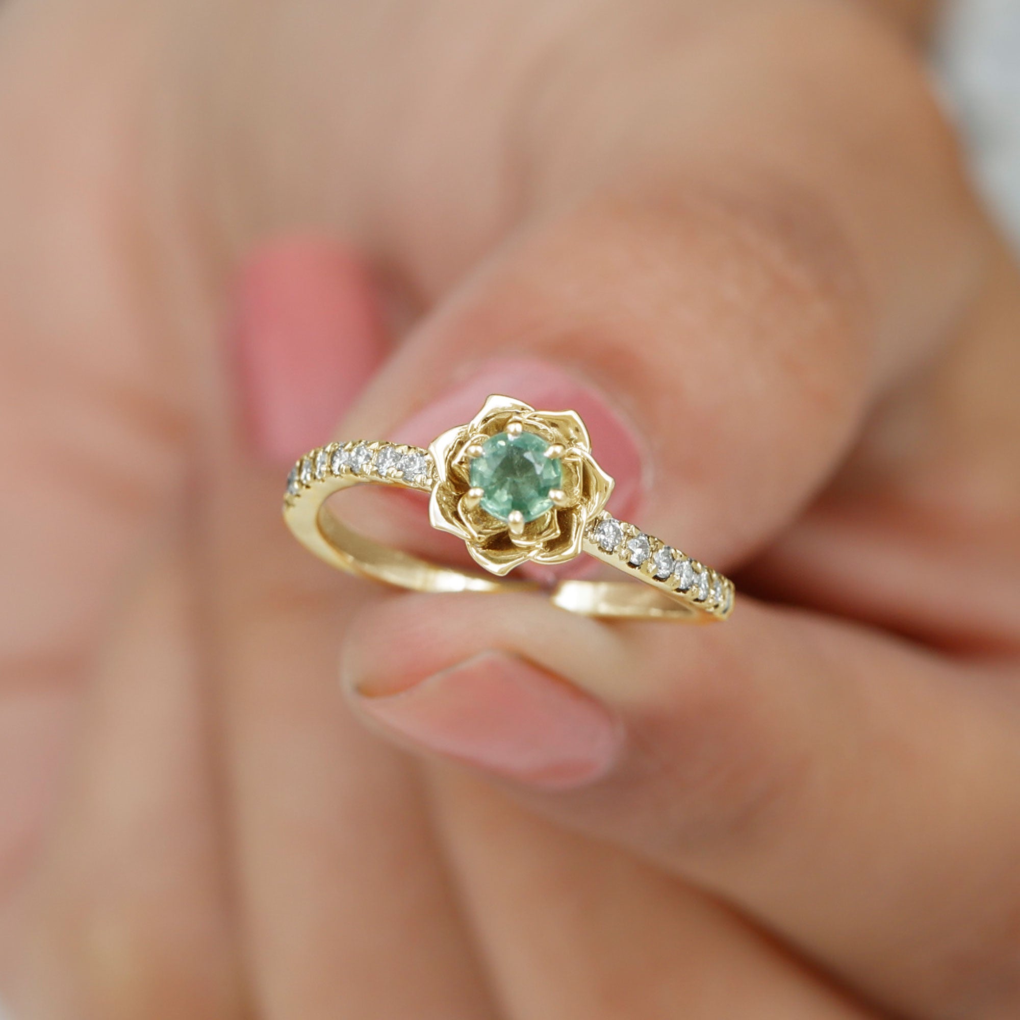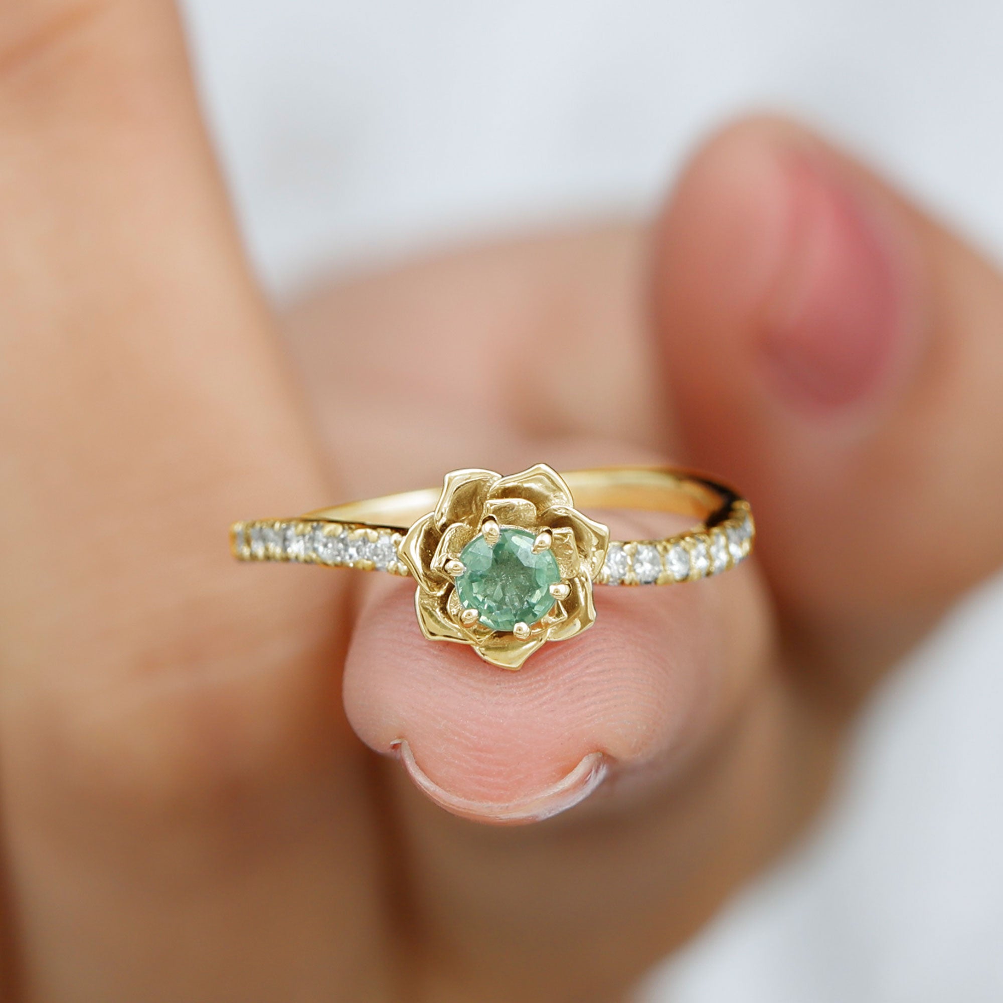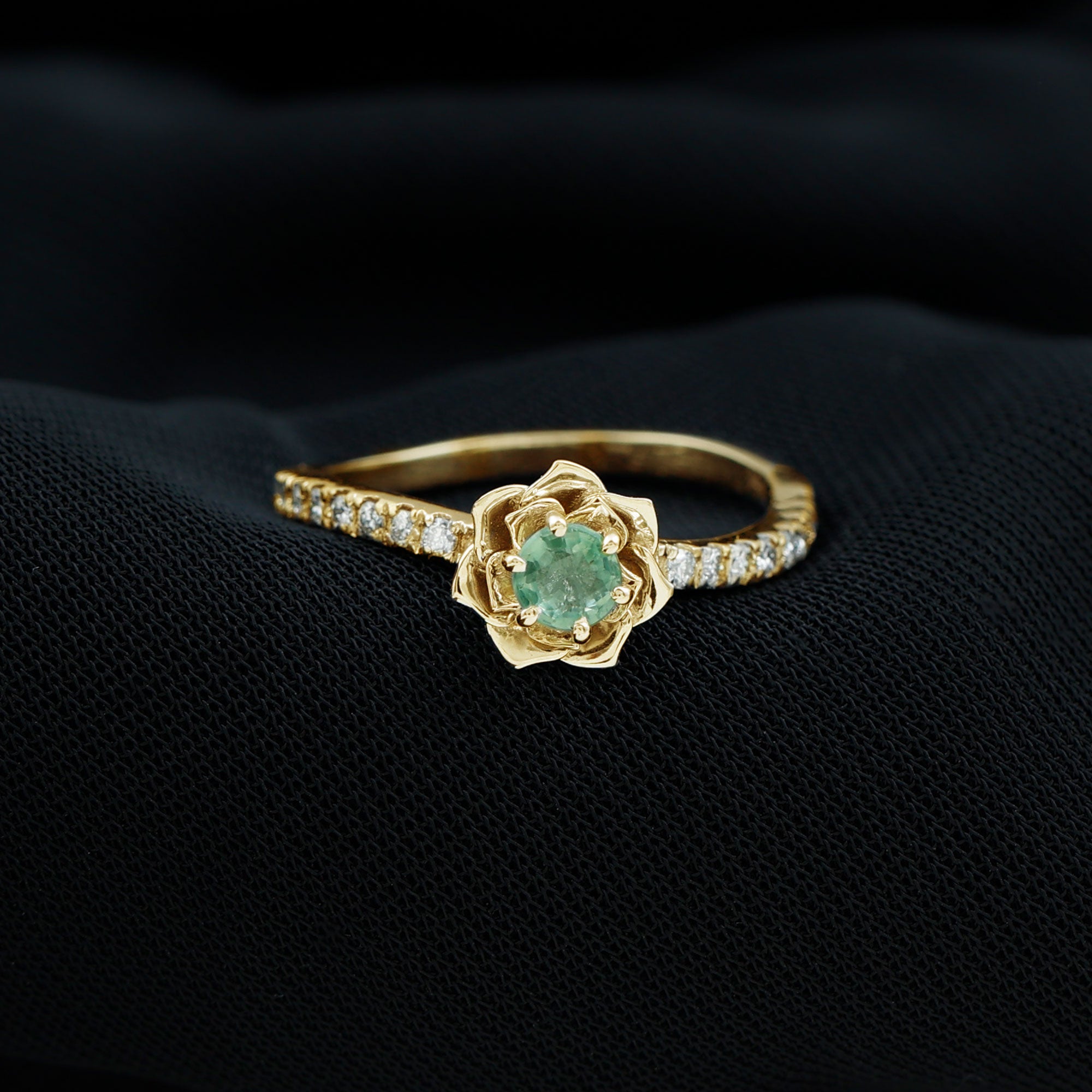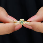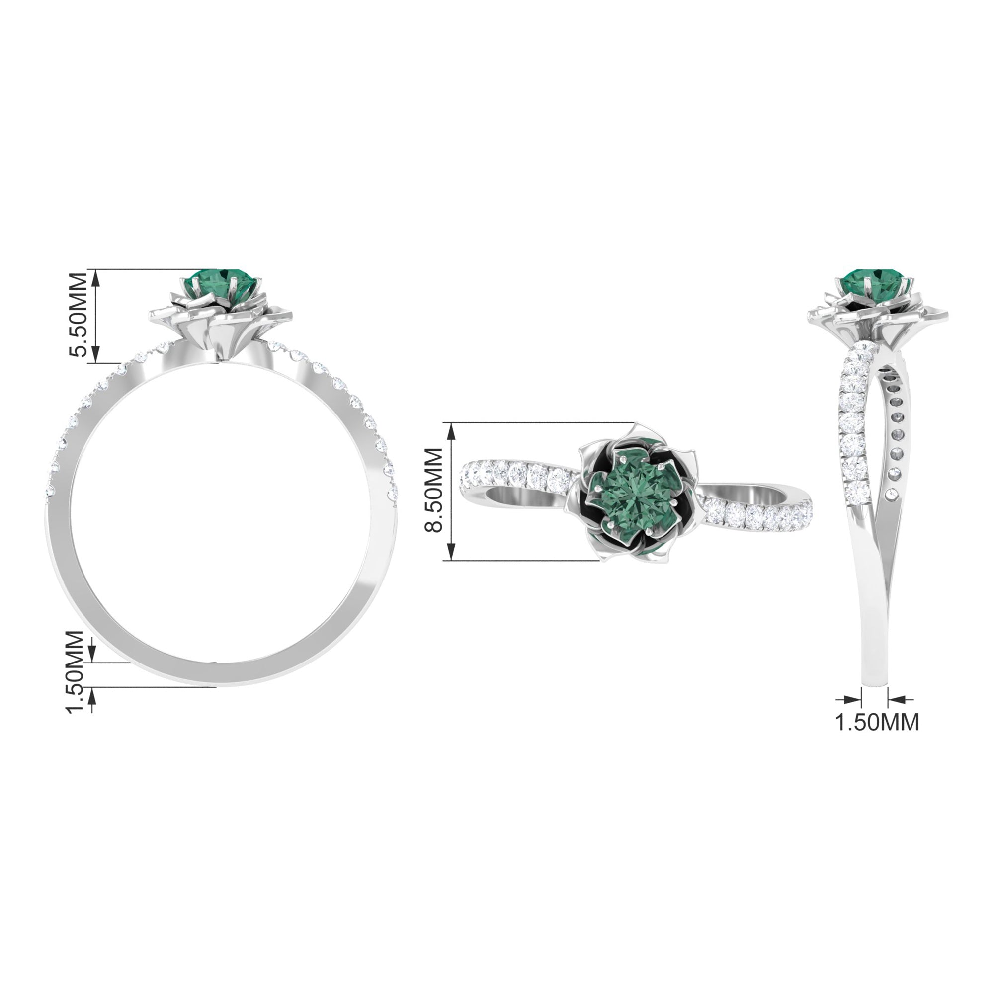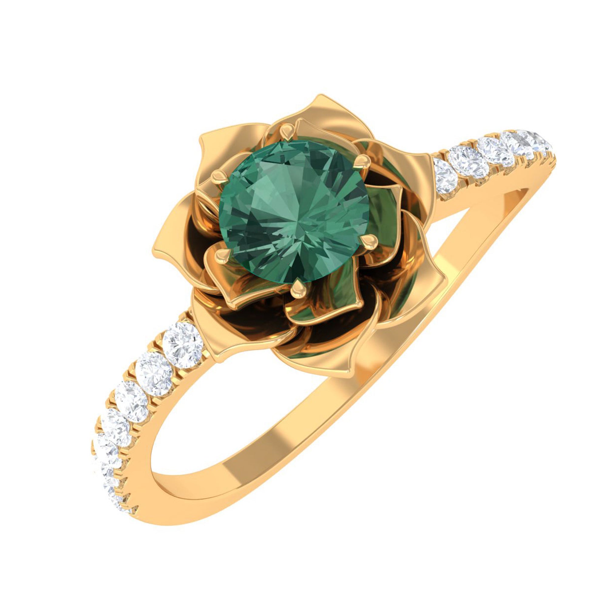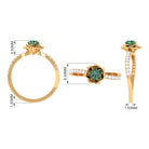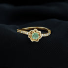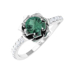 This Floral Engagement Ring exudes an aura of elegance and sophistication, perfect for a bride who desires a piece of jewelry that will stand the test of time. This ring is embellished with a Round Shape green sapphire, held captivatingly in flower design and is accentuated with Diamond on the shank. This green sapphire ring is a beautiful piece to present to your lady.