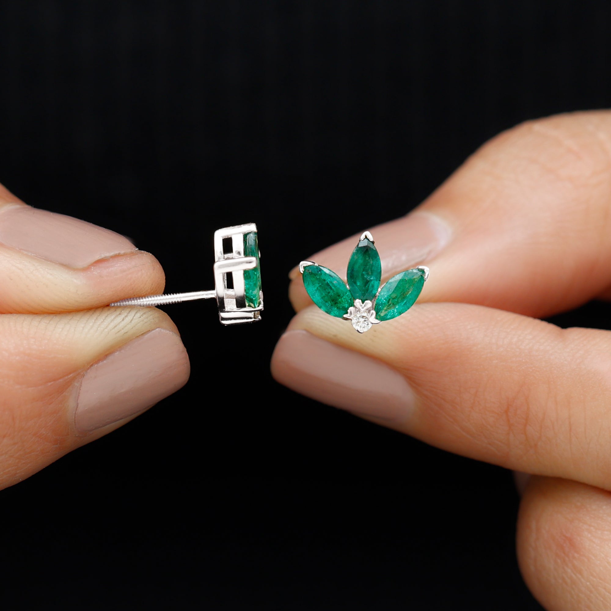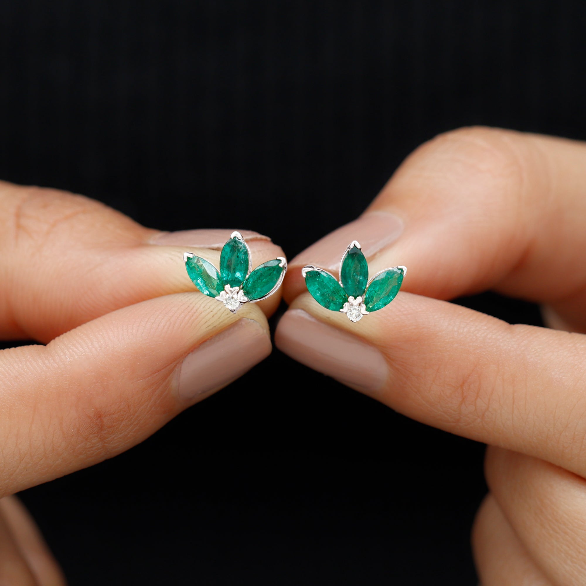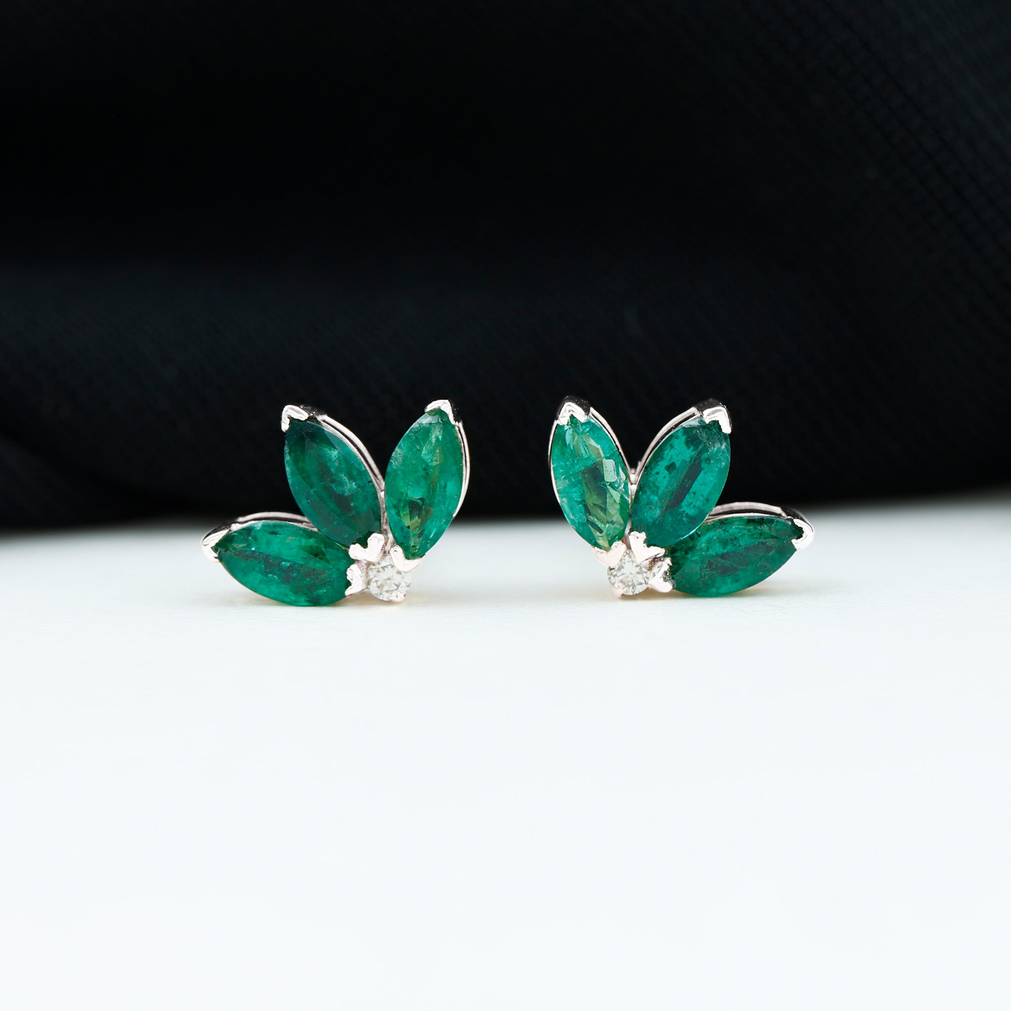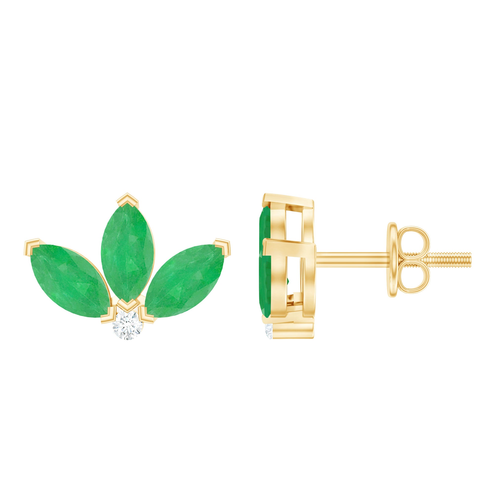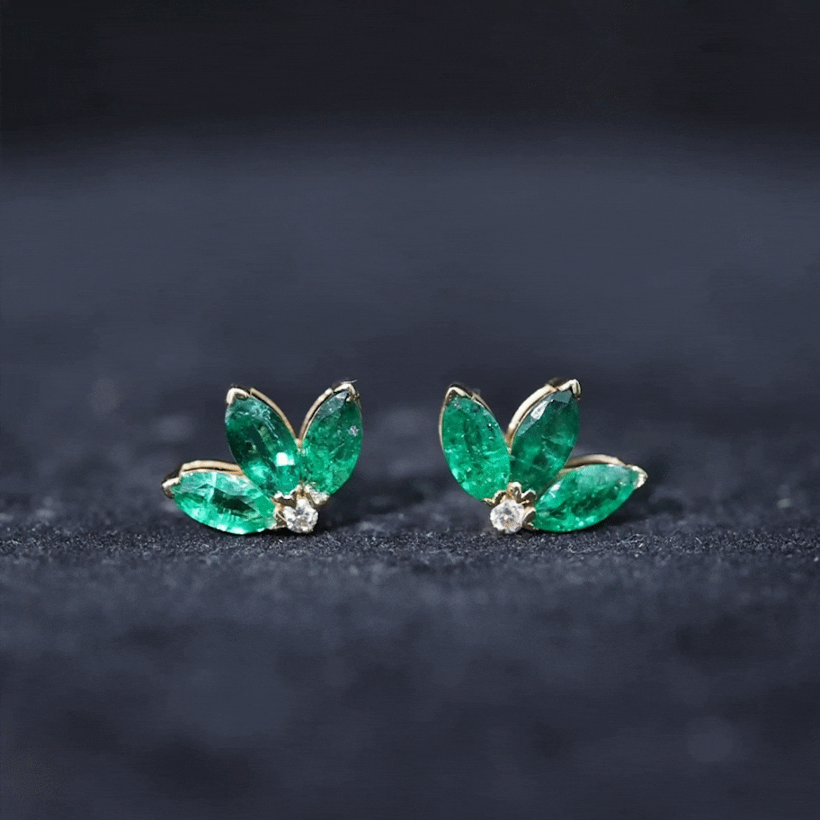 An exceptionally wonderful design with the Half Flower Stud Earrings features Three Marquise Shape Emerald gemstones beautifully set in V Prong Setting as petals of the flower with a Diamond gemstone. A cute and adorable gift for your daughter or mom.