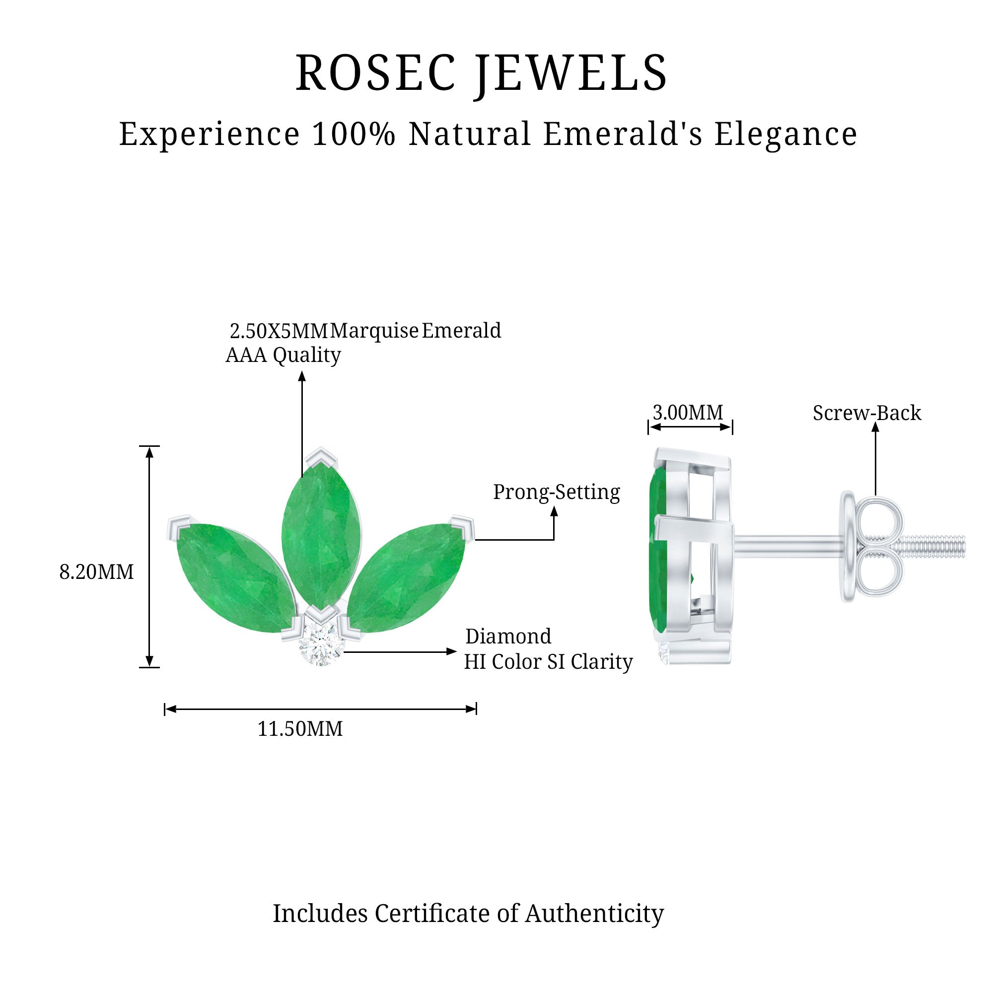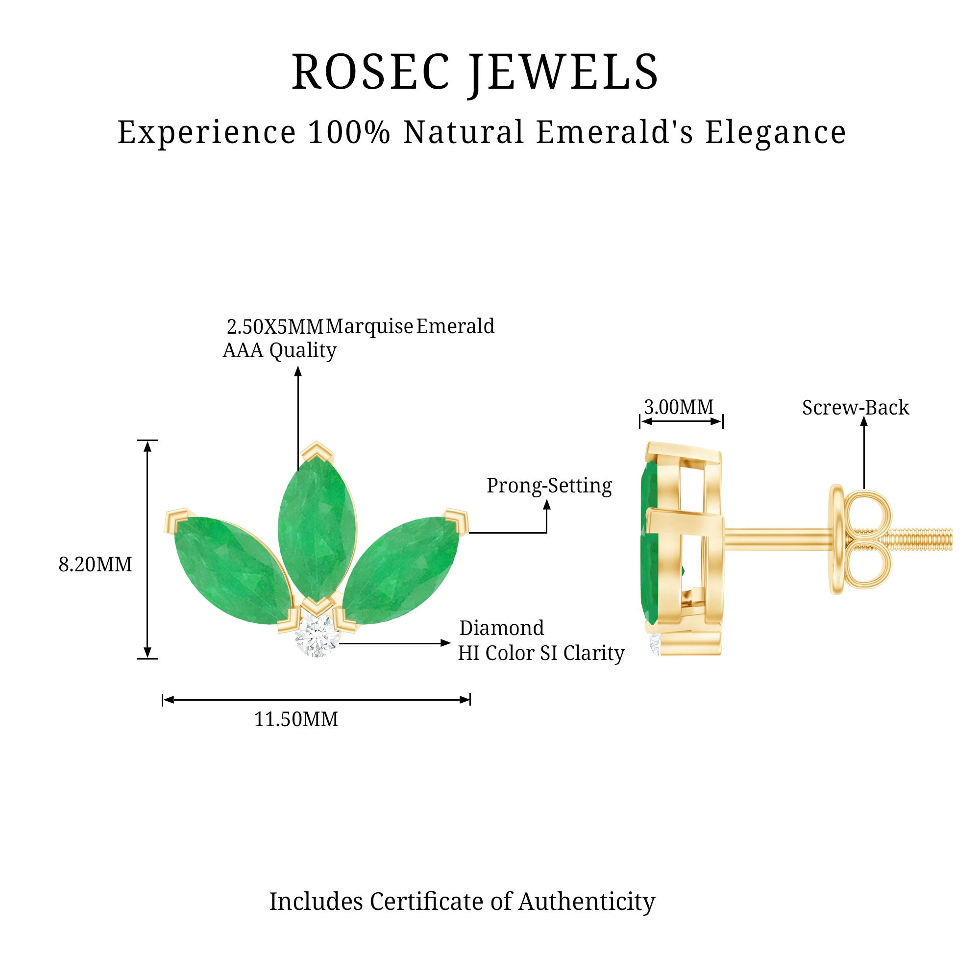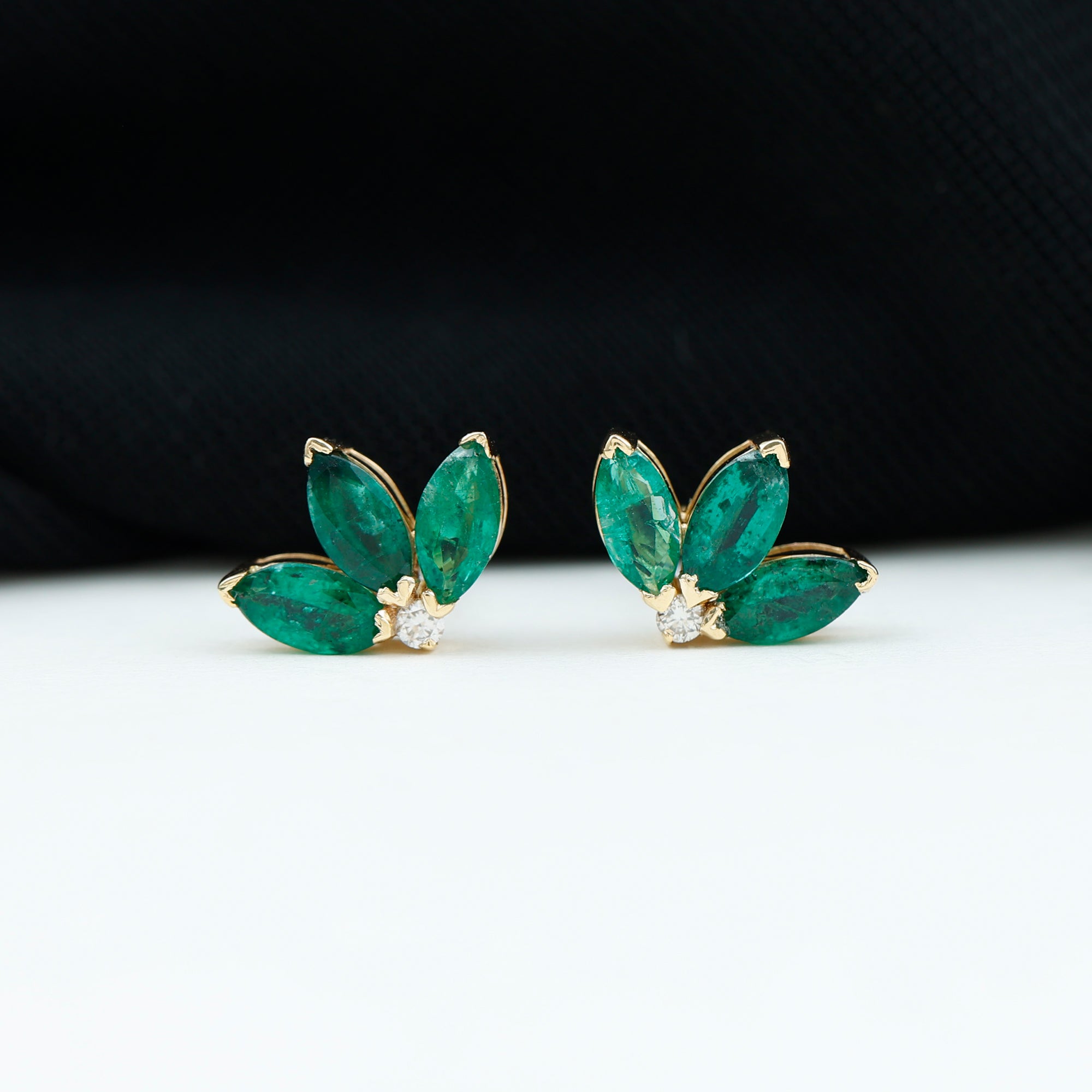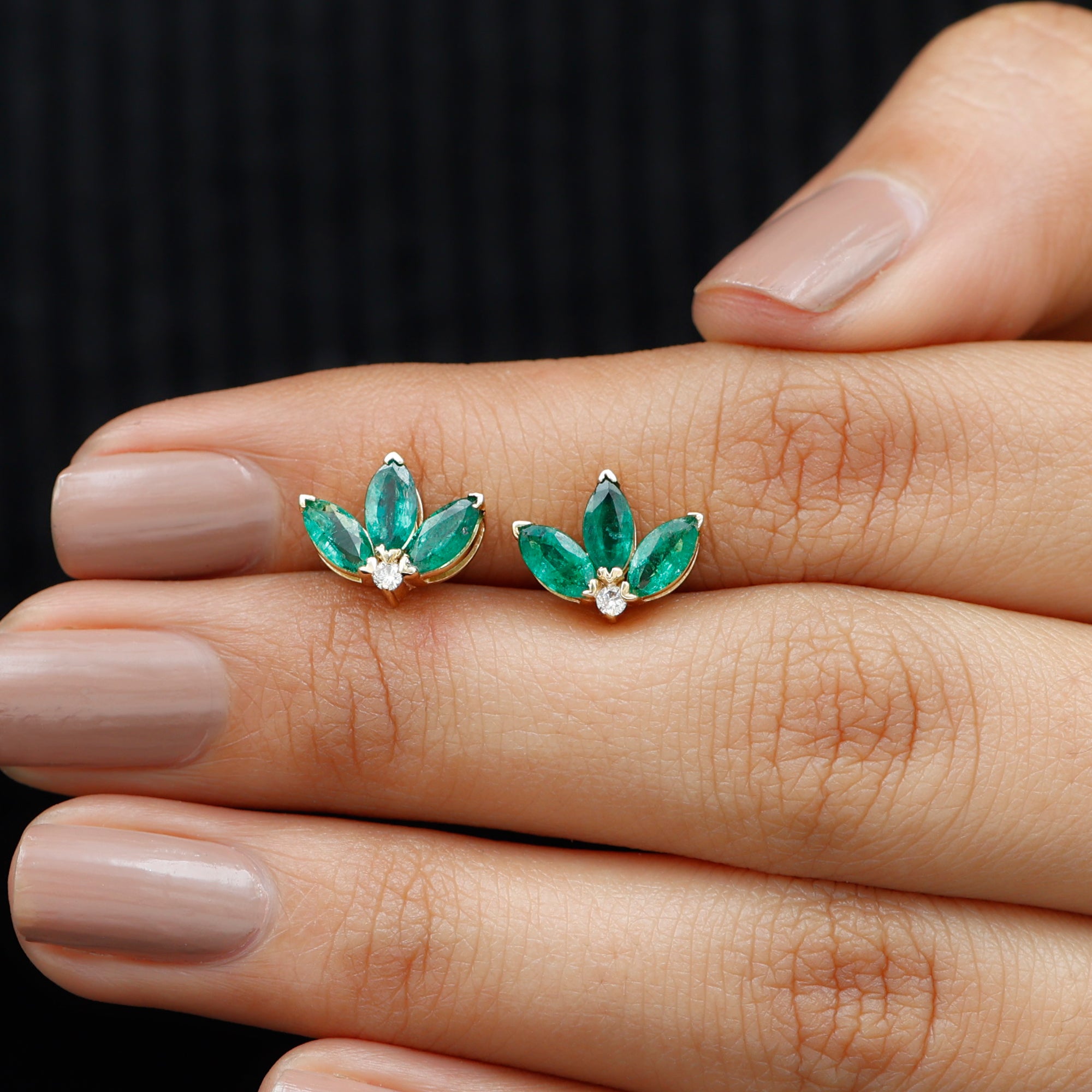 An exceptionally wonderful design with the Half Flower Stud Earrings features Three Marquise Shape Emerald gemstones beautifully set in V Prong Setting as petals of the flower with a Diamond gemstone. A cute and adorable gift for your daughter or mom.
