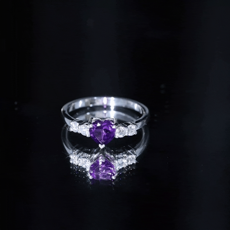 The brilliant sparkle of the Amethyst Promise Ring sweeps across the style adding brilliant Moissanite which is sure to take her breath away. Flanked by the striking Round brilliant cut Moissanite on the sides with the Amethyst as the centerpiece of the attraction. Complement your style that celebrates the perfect romance with a Heart Promise Ring. The center is the 6 MM Heart Shape Amethyst in Prong Setting. Radiate elegance with this Heart Amethyst Ring that represents unconditional love and devotion with timeless beauty and charm. The Heart Shape Amethyst Ring is an eye-catching piece that has an endless meaning and can be worn as promise jewelry, a February birthstone or an engagement ring.