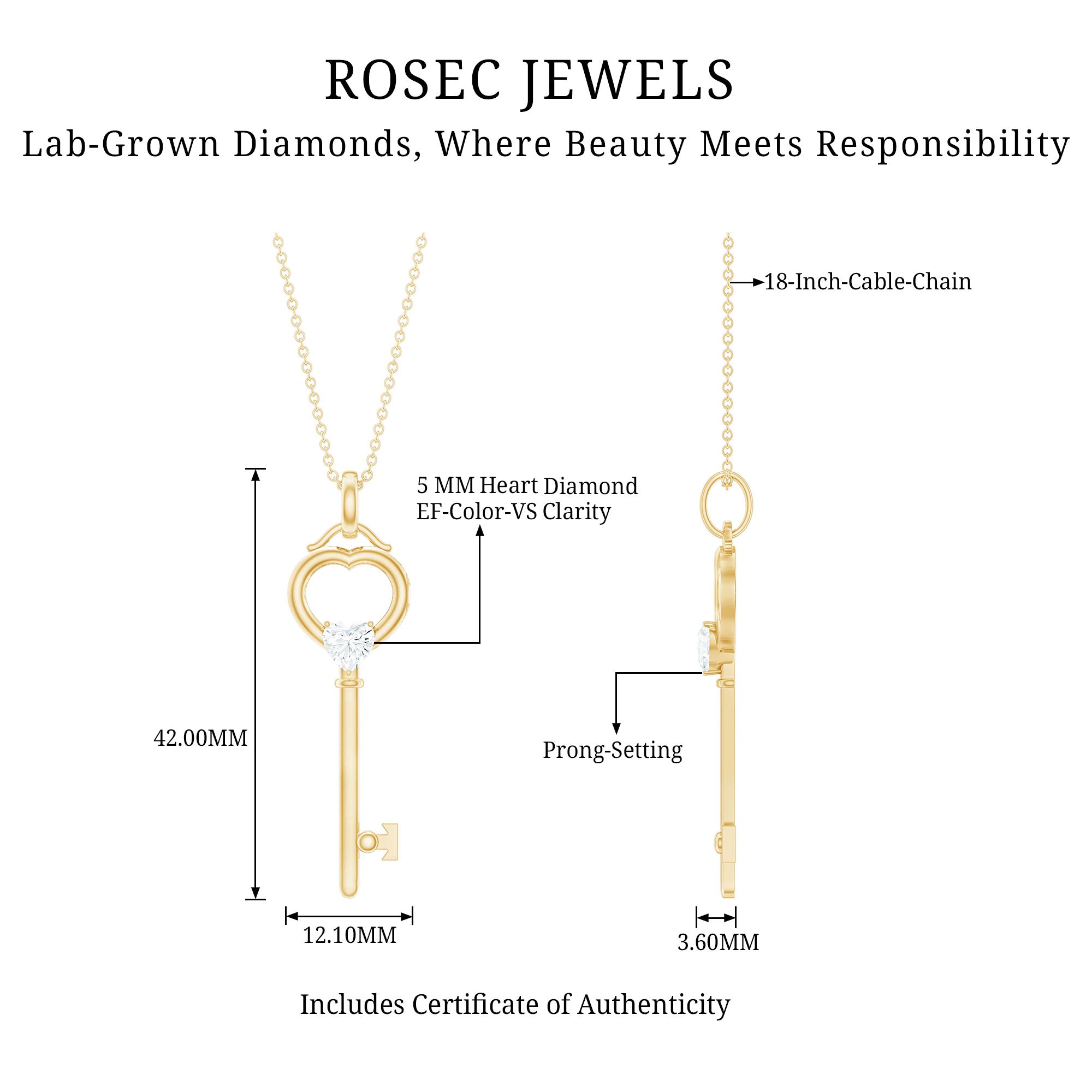 Unlock a world of love and style with this Key Pendant Necklace with Heart Design. Crafted with a 5 MM Heart Shape Lab Grown Diamond gemstone set in 3 Prong Setting, this Pendant Necklace exudes elegance and sentiment. The heart motif speaks of affection and emotion, while the key represents the power to unlock hearts. Whether youre gifting it to a loved one or wearing it as a personal statement, our Simulated Diamond Pendant Necklace adds a touch of romance and individuality to any outfit.