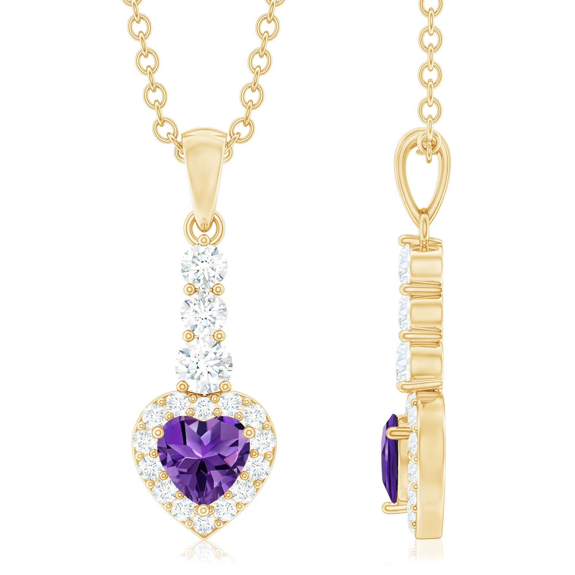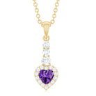 This stunning drop pendant features a brilliant heart shape Amethyst gemstone surrounded by a Diamond halo, elegantly suspended from a delicate Diamond-studded bail. The vibrant hue of the Amethyst contrasts beautifully with the sparkling Diamond stones, creating a piece that exudes sophistication and charm. Perfect for any occasion, this Amethyst heart pendant is sure to become a cherished addition to any jewelry collection.
