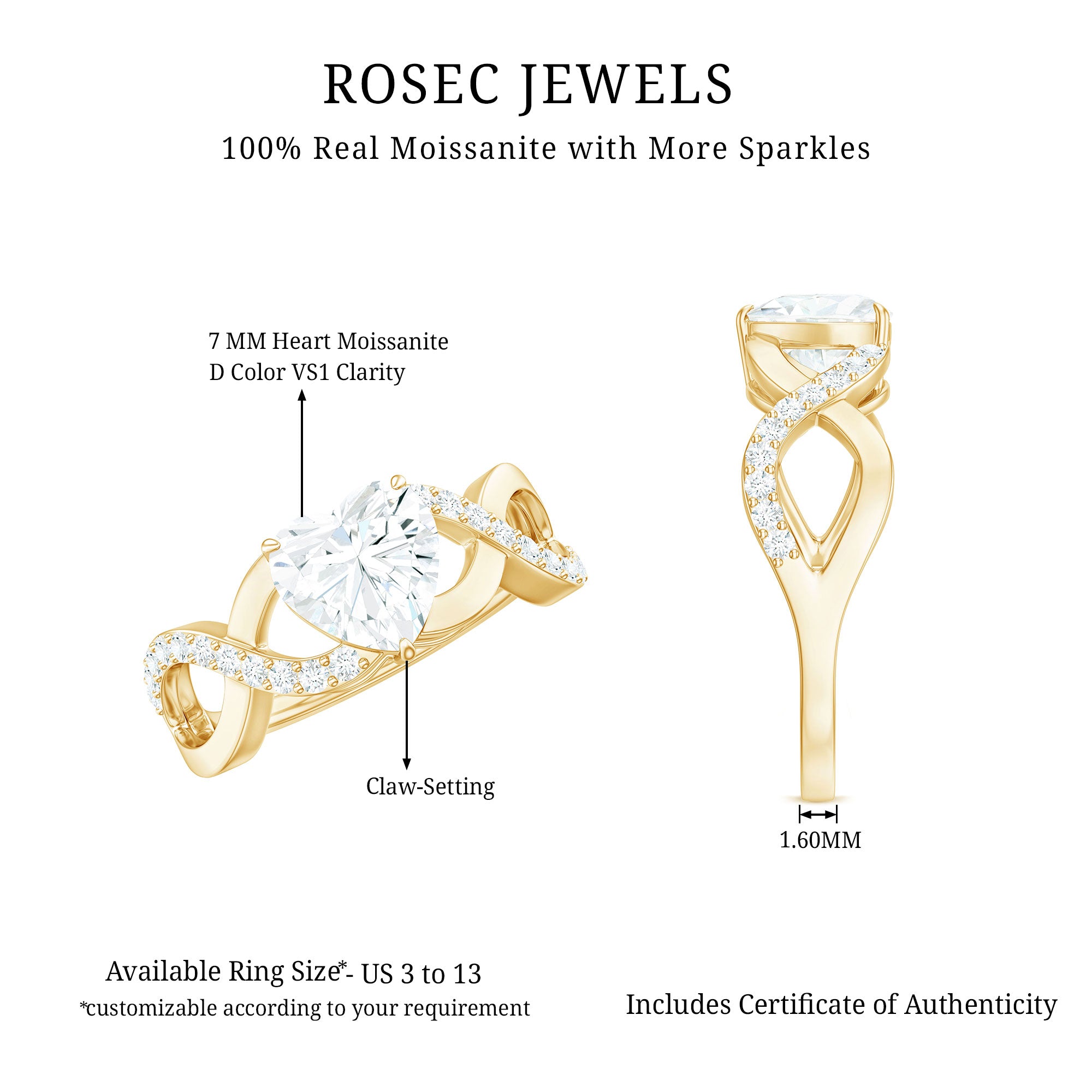 Celebrate your love with this timeless Heart Moissanite Engagement Ring. The ring features a stunning Heart-shaped Solitaire Moissanite held securely in a claw setting at the center of a vintage-inspired crossover metal band. The band is further enhanced with the addition of sparkling side stones, adding extra shine to this beautiful piece. The ring has a total weight of 2 Carats and is certified with a quality of D Color VS1 Clarity. All of our gemstones undergo a strict quality check.