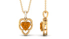 A heart shape citrine is set in a classic prong setting and is placed against a modish heart frame in this solitaire pendant for a luxe appeal. The eye-pleasing heart frame is connected to a lustrous bail adorned with sparkling round diamonds of varying sizes. A piece of suitable birthday jewelry for November born ladies.