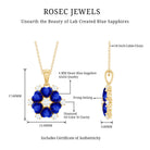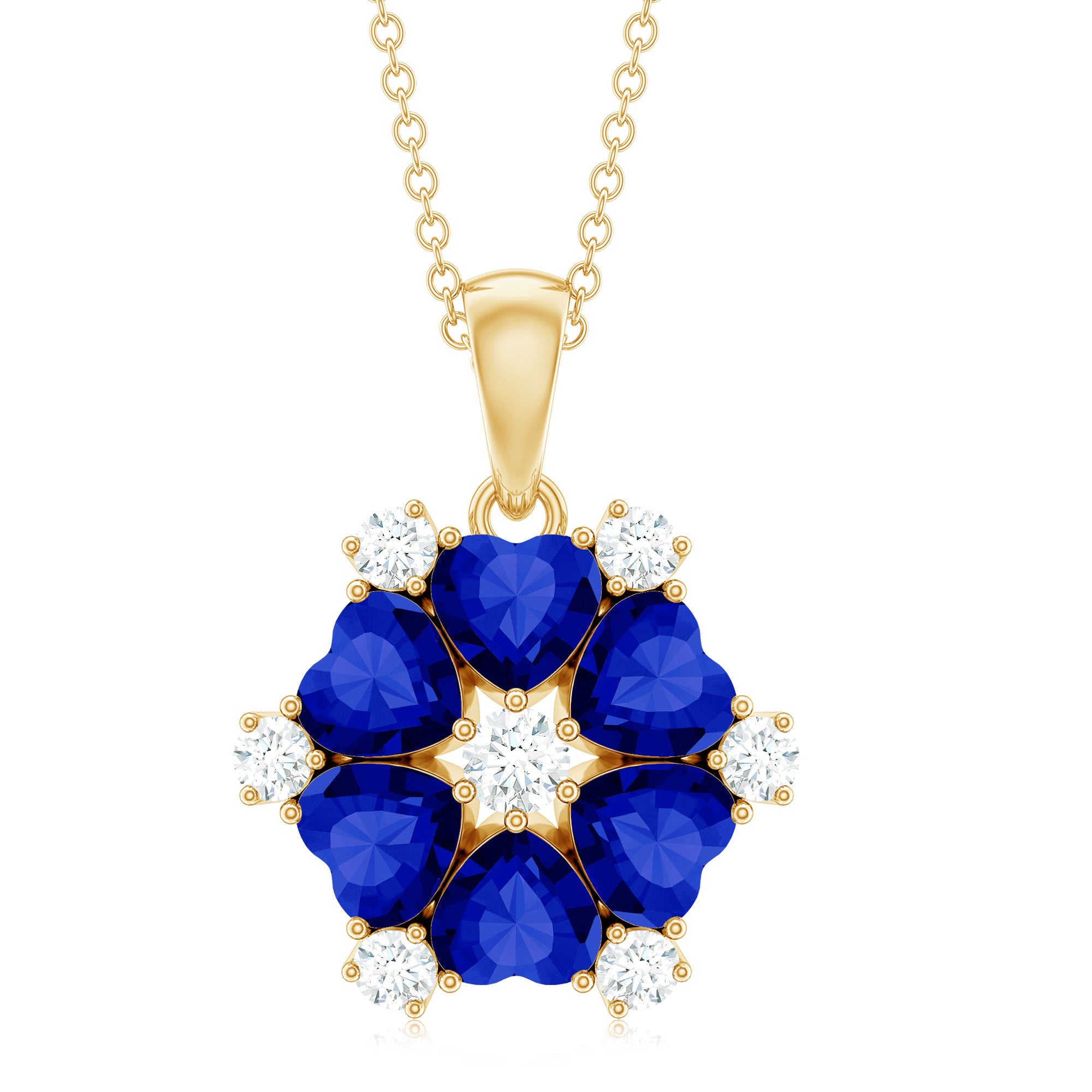 These exquisite Heart-Shaped Created Blue Sapphire Gemstones are set in a Prong Setting and surrounded by a delicate Diamond Flower Pendant that exudes sheer elegance. The Created Blue Sapphire Floral Pendant Necklace is a versatile piece worn as an everyday accessory or as office wear jewelry. With a total weight of 2.50 Carats and AAAA Clarity, this pendant symbolizes refinement and beauty.