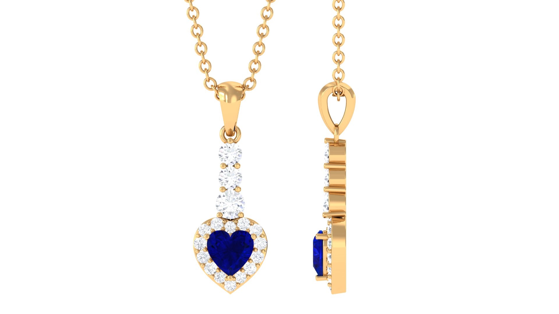 Adorn yourself with the mesmerizing beauty of this exquisite drop pendant, showcasing a brilliant heart-shaped Created Blue Sapphire gemstone embraced by a halo of sparkling Diamond. Delicately suspended from a bail adorned with shimmering diamonds, this pendant exudes timeless elegance and charm. The vibrant hue of the Created Blue Sapphire creates a striking contrast against the glistening diamond stones, making this piece a true standout.