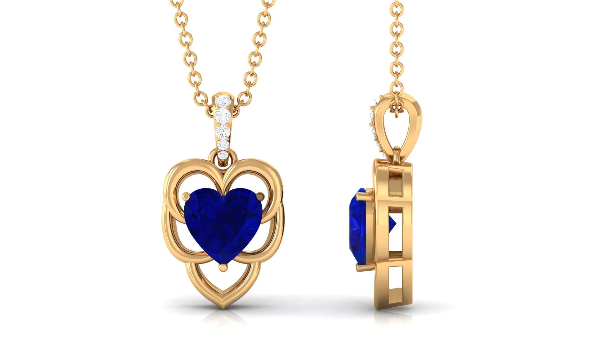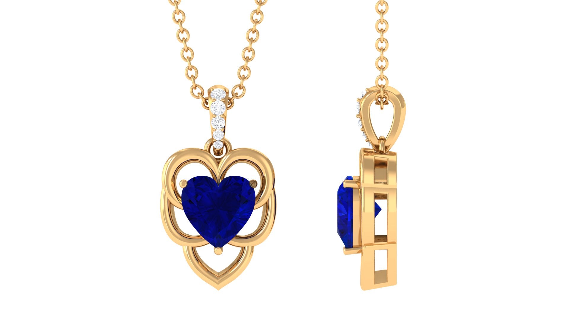 This exquisite leaf pendant is a true statement piece. The centerpiece is a stunning heart shape Lab-Created Blue Sapphire gemstone, expertly cut to showcase its beauty and elegance. The gold leaf design adds a touch of nature and organic beauty, while the Diamond accent bail adds a touch of glamour and refinement. This Created Blue Sapphire heart pendant is perfect for those who love to make a statement with their jewelry, and its a perfect gift for a loved one or a beautiful addition to your jewelry collection.