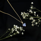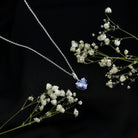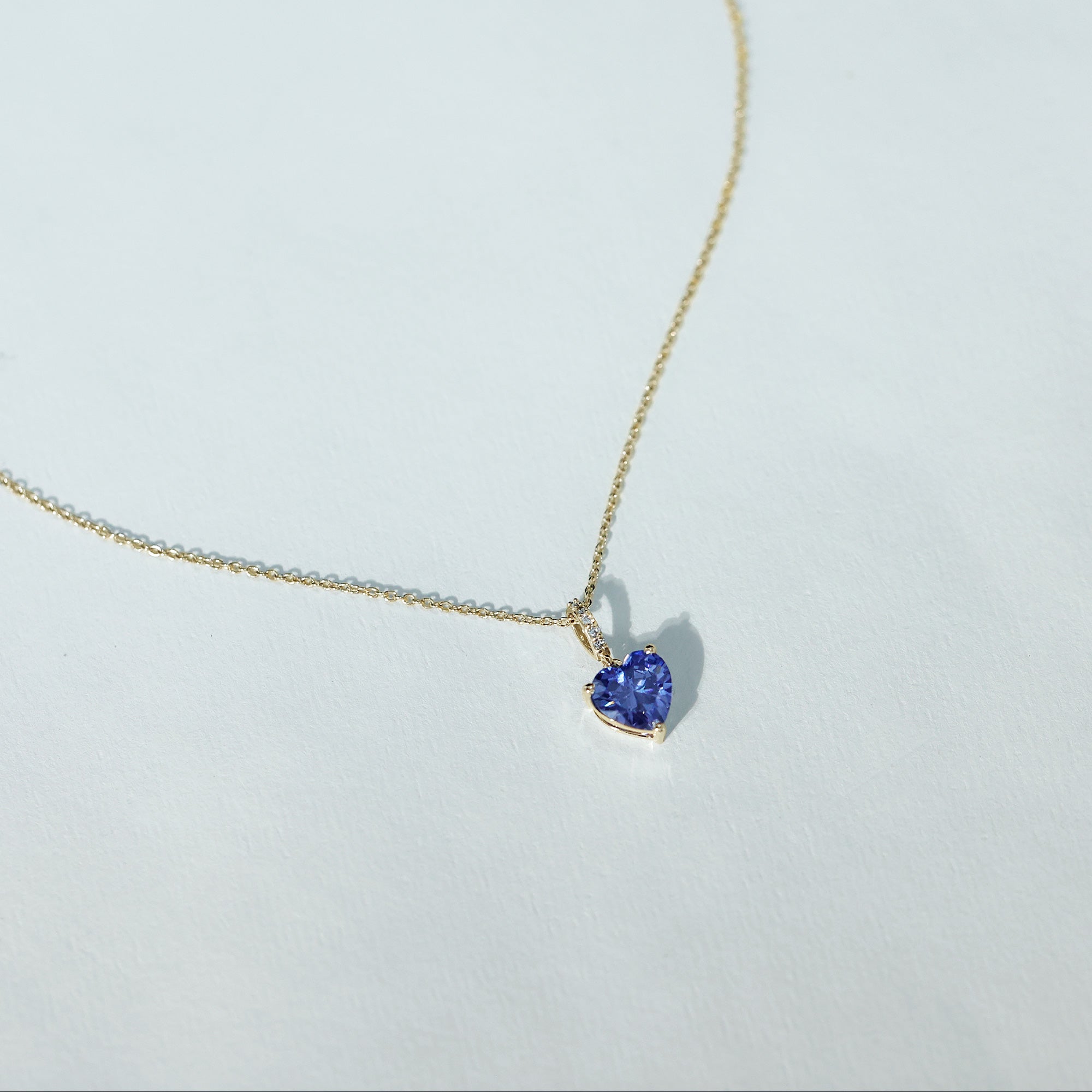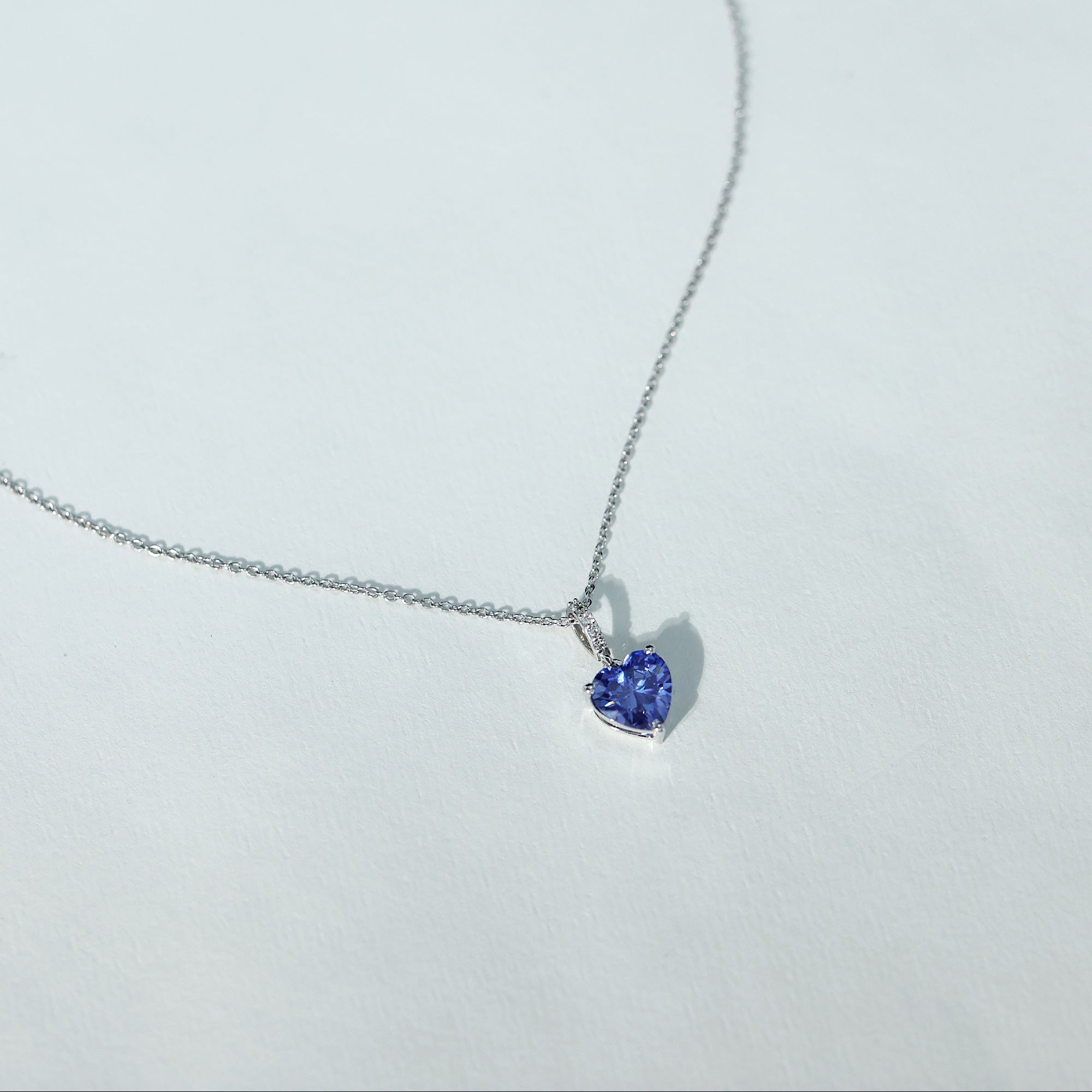 Embrace the breathtaking beauty of this exquisite drop pendant, where a heart-shaped created blue sapphire takes center stage within a dazzling diamond halo. The mesmerizing created blue sapphire captures the spotlight with its magnificence, while graduating round diamonds gracefully enhance its central presence, lending an aura of sophisticated elegance to the design.