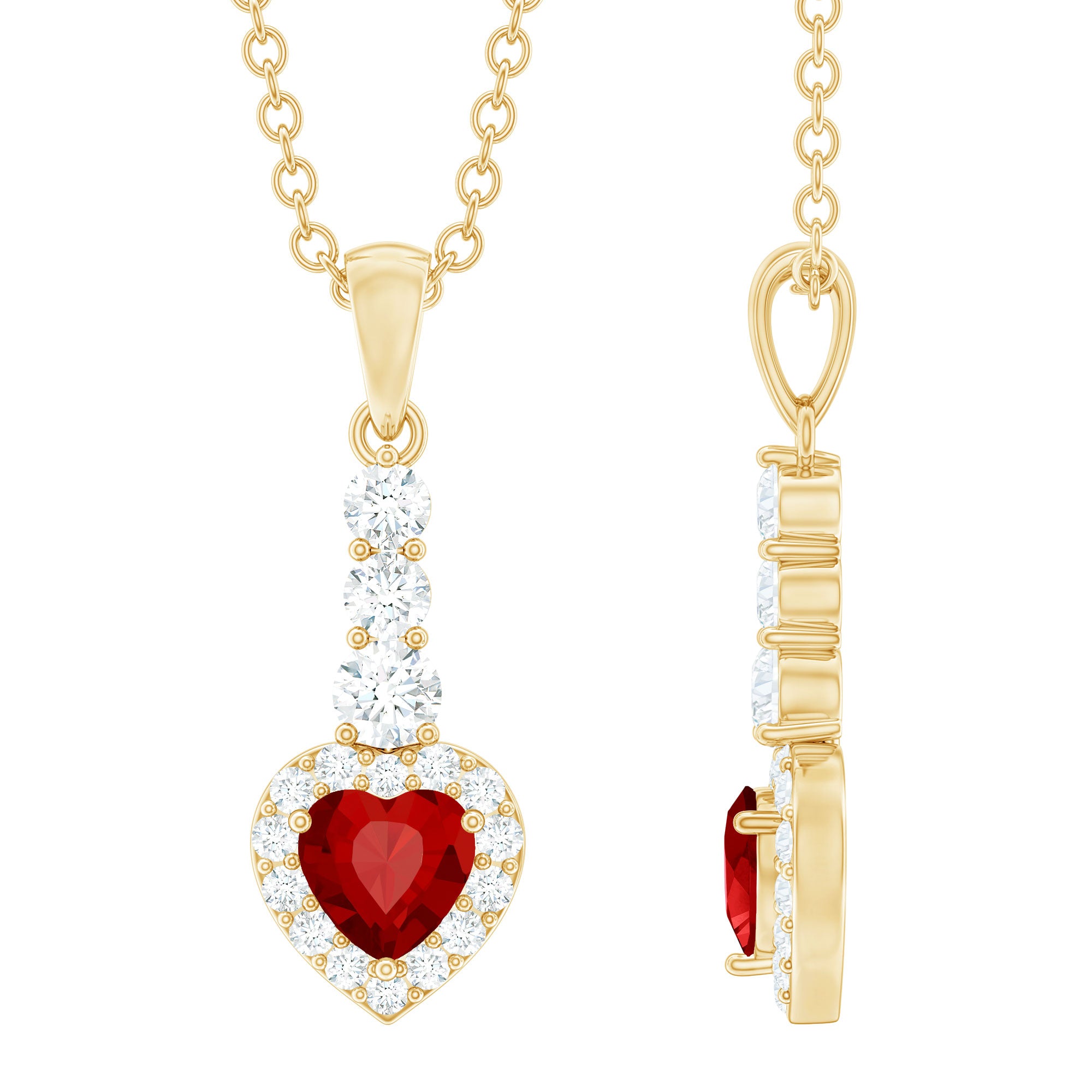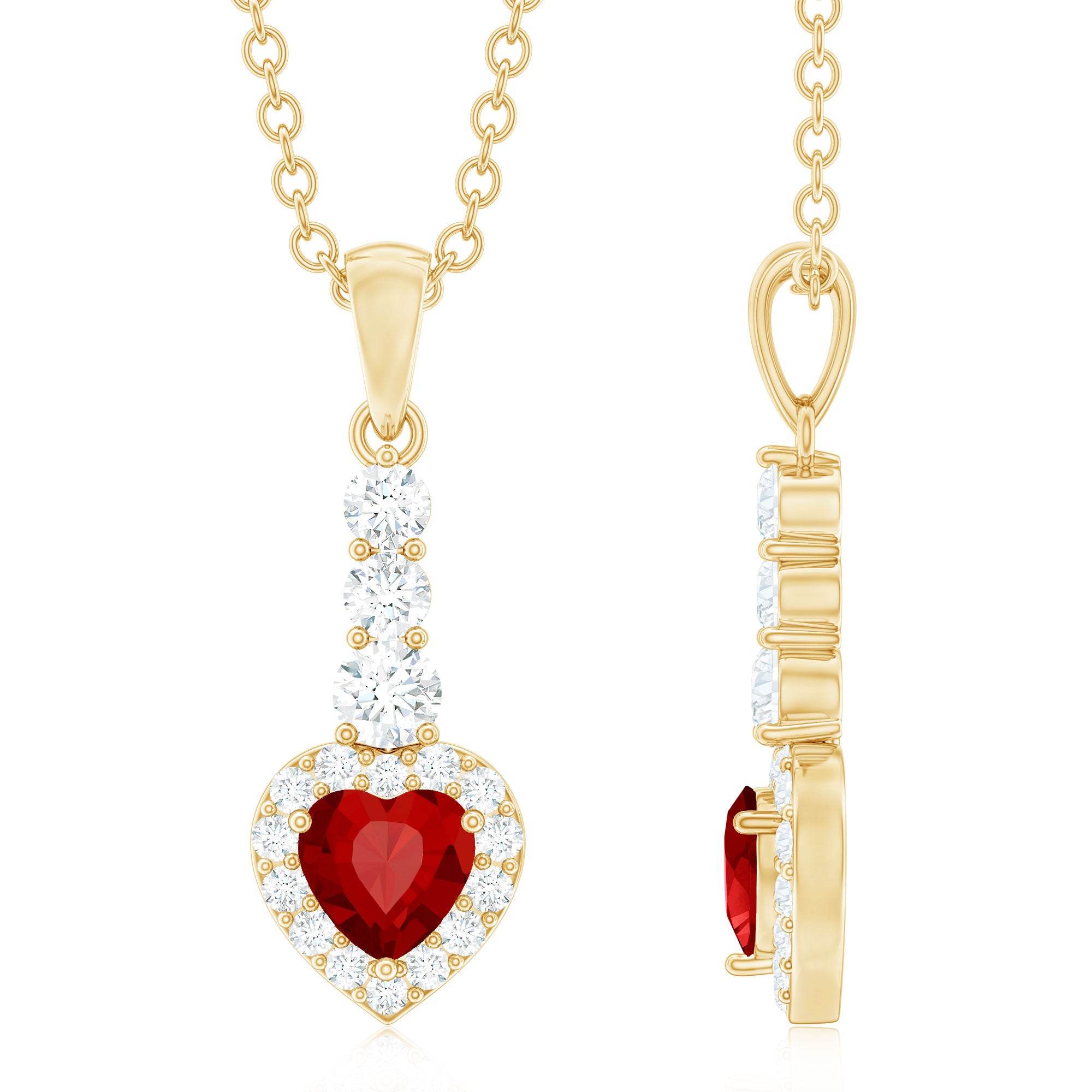 Adorned with a brilliant heart-shaped Created Ruby gemstone at its center, this drop pendant is truly stunning. The Created Ruby is surrounded by a dazzling halo of Diamond stones, adding a touch of sparkle and elegance to the piece. Suspended from a delicate bail studded with Diamond, this pendant exudes sophistication and charm.