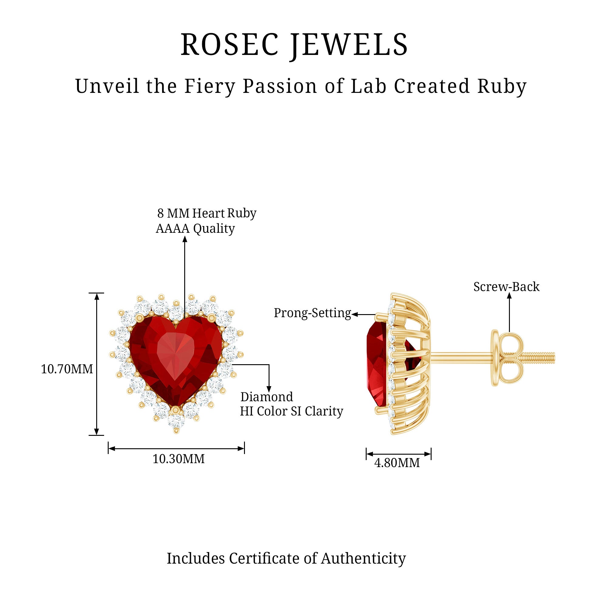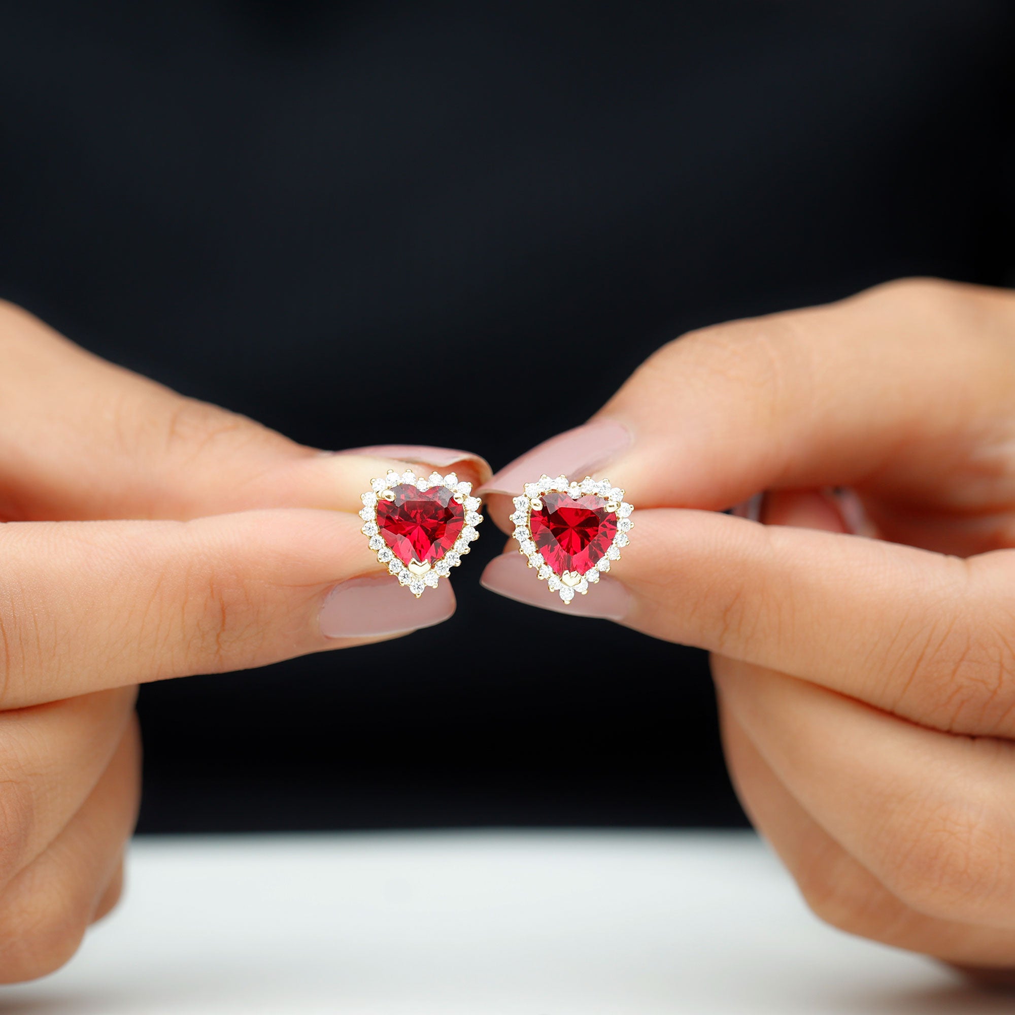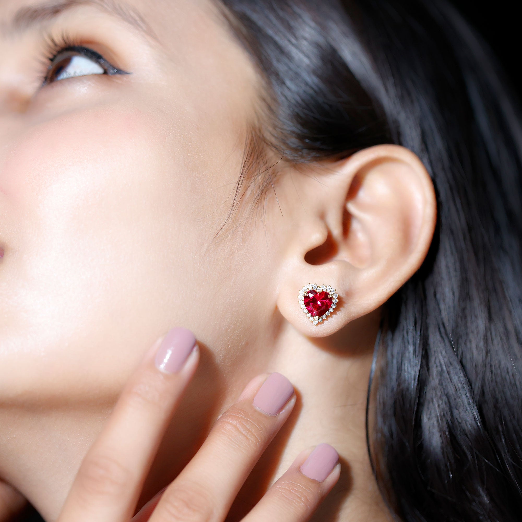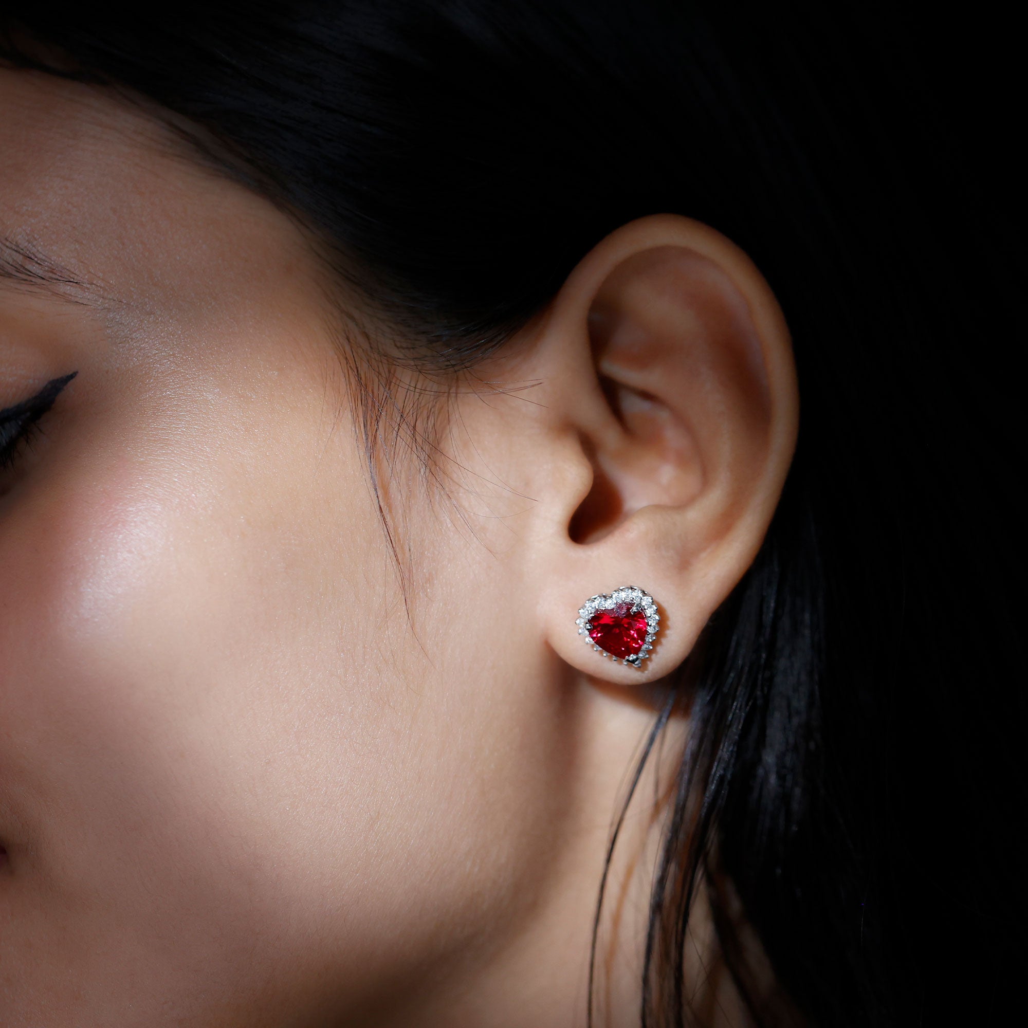 Discover the alluring charm of these Heart Stud Earrings featuring Heart Shaped Lab Created Ruby secured in prong setting encircled by Diamonds which add a touch of glamour to your evening ensemble. The sparkling hues of Ruby and Diamond exhibit a captivating contrast making these earring studs an essential accessory. Whether worn at a special event or worn as an everyday luxury, these Heart Earrings are sure to capture attention.