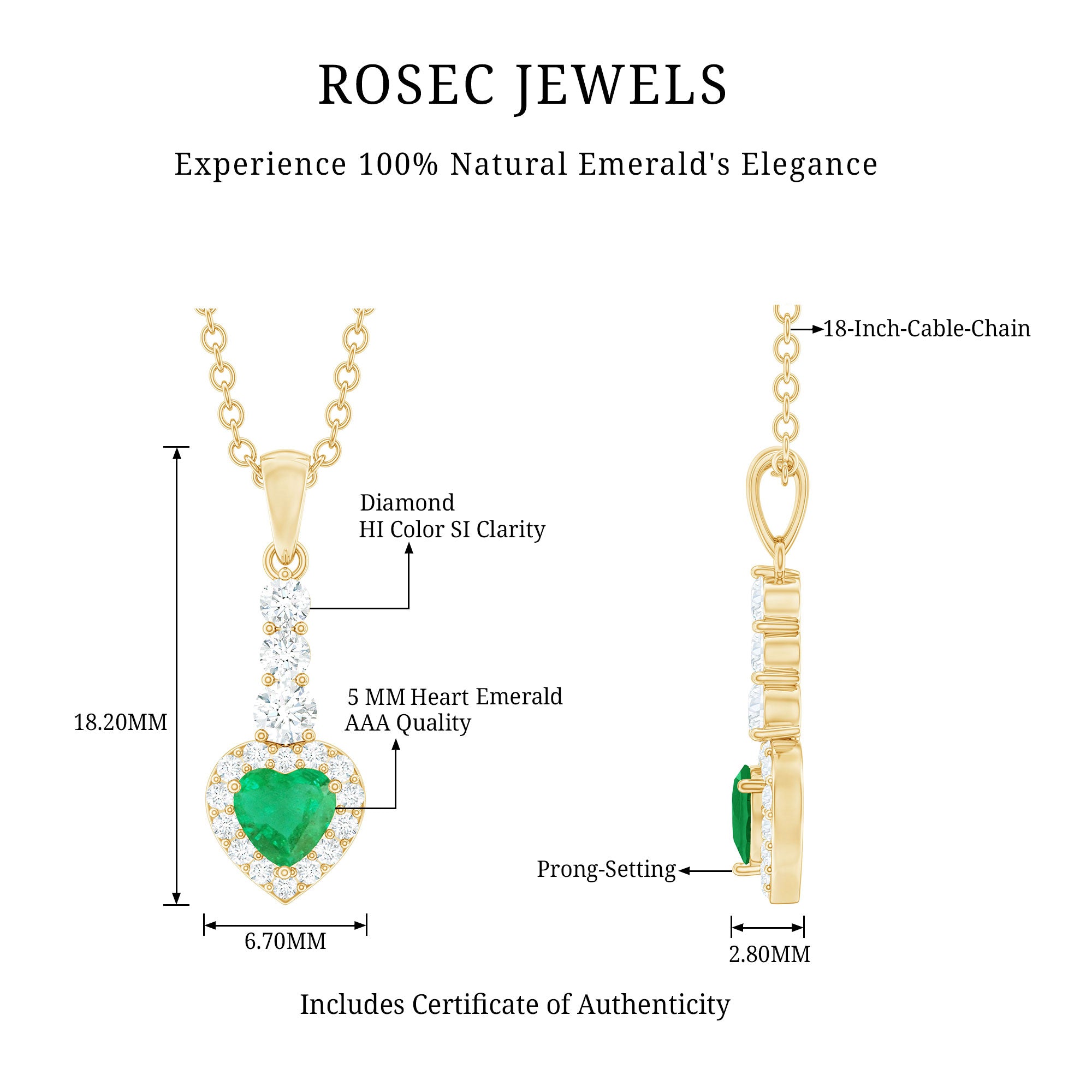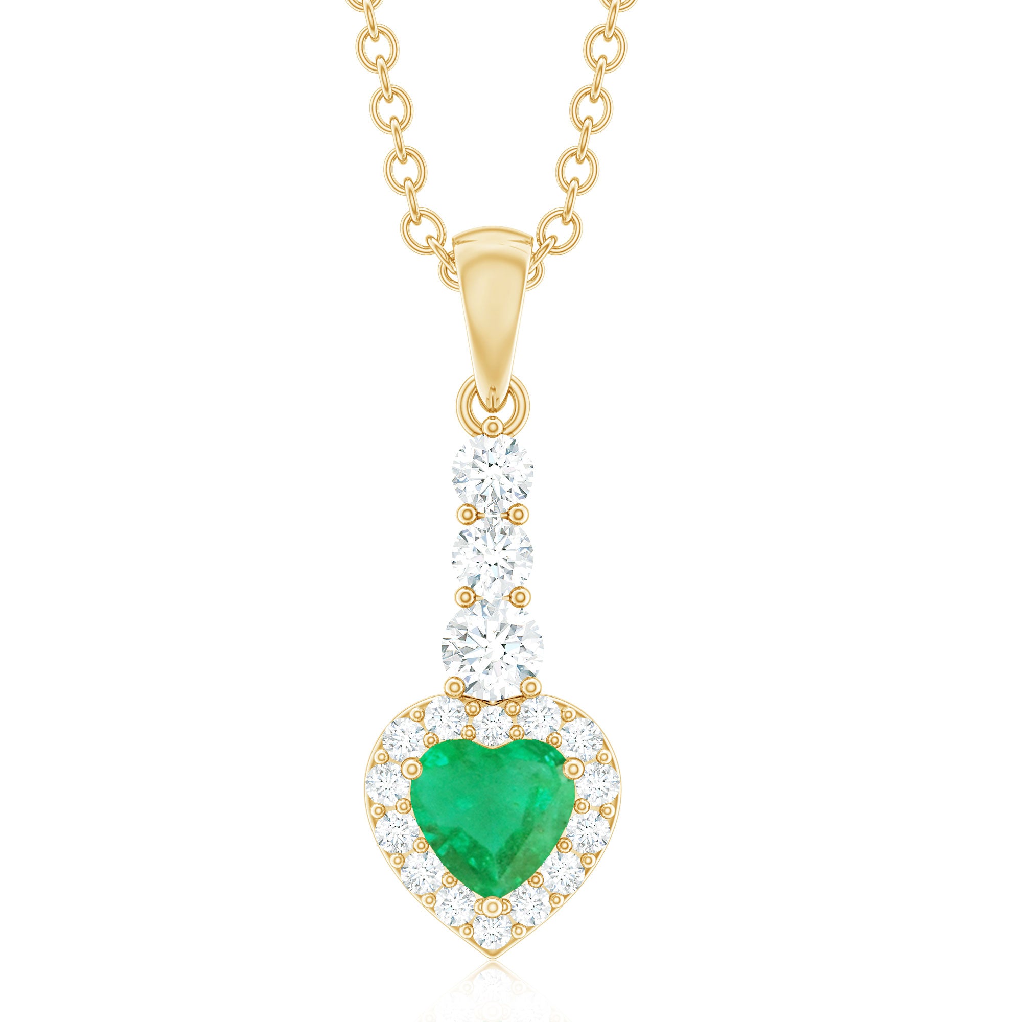 This stunning drop pendant features a brilliant heart shape Emerald gemstone surrounded with a Diamond halo, elegantly suspended from a delicate Diamond-studded bail. The vibrant hue of the emerald contrasts beautifully with the sparkling Diamond stones, creating a piece that exudes sophistication and charm. Perfect for any occasion, this Emerald heart pendant is sure to become a cherished addition to any jewelry collection.