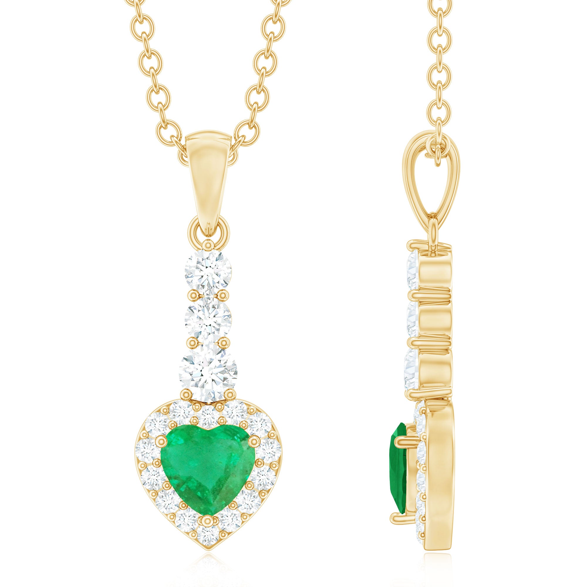 This stunning drop pendant features a brilliant heart shape Emerald gemstone surrounded with a Diamond halo, elegantly suspended from a delicate Diamond-studded bail. The vibrant hue of the emerald contrasts beautifully with the sparkling Diamond stones, creating a piece that exudes sophistication and charm. Perfect for any occasion, this Emerald heart pendant is sure to become a cherished addition to any jewelry collection.