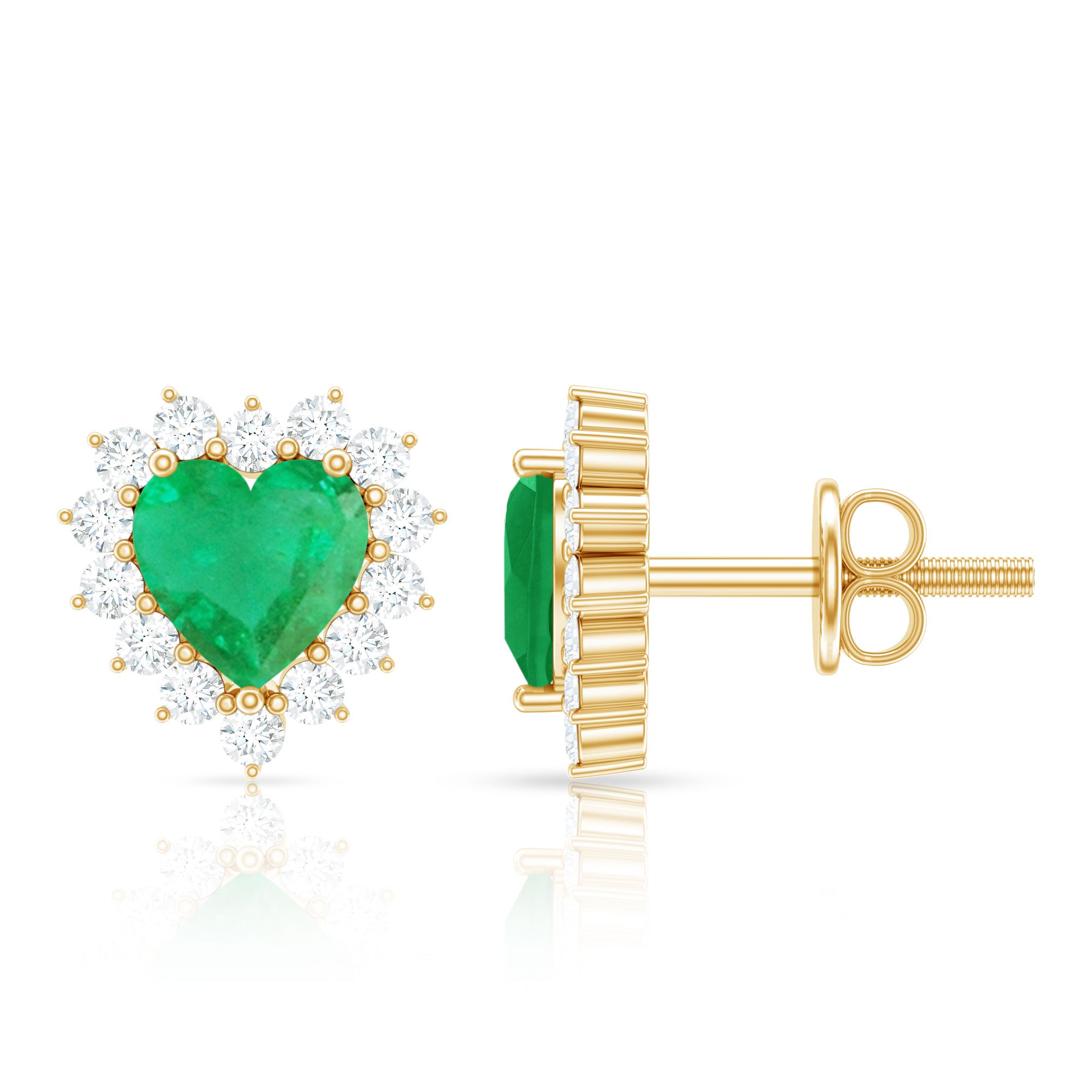 Green hearts brilliance dazzles best with diamonds zest! Witness the magic with our Emerald Heart Stud Earrings adorned with a 4 MM Emerald centerpiece, amplified by a dazzling halo of HI-SI Diamond gemstones. Experience not just beauty, but also safety and comfort with this exquisite piece. Its time to embrace romance and sophistication in every moment.