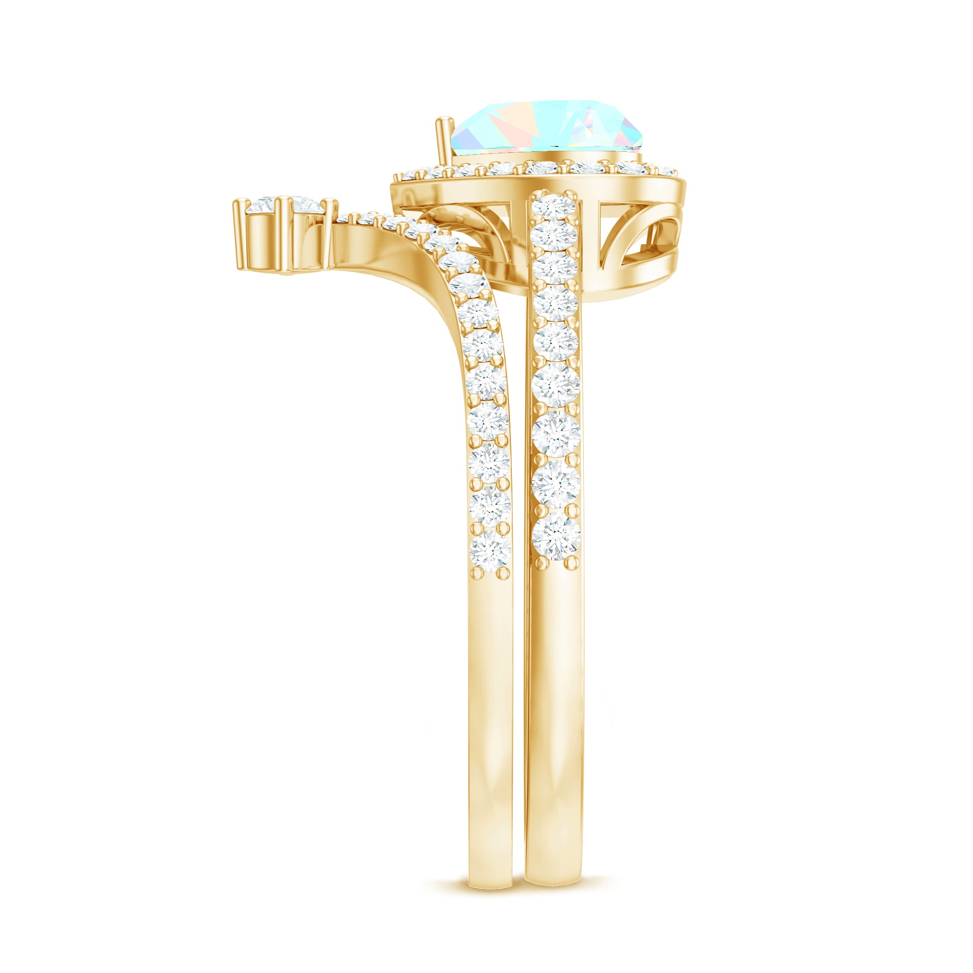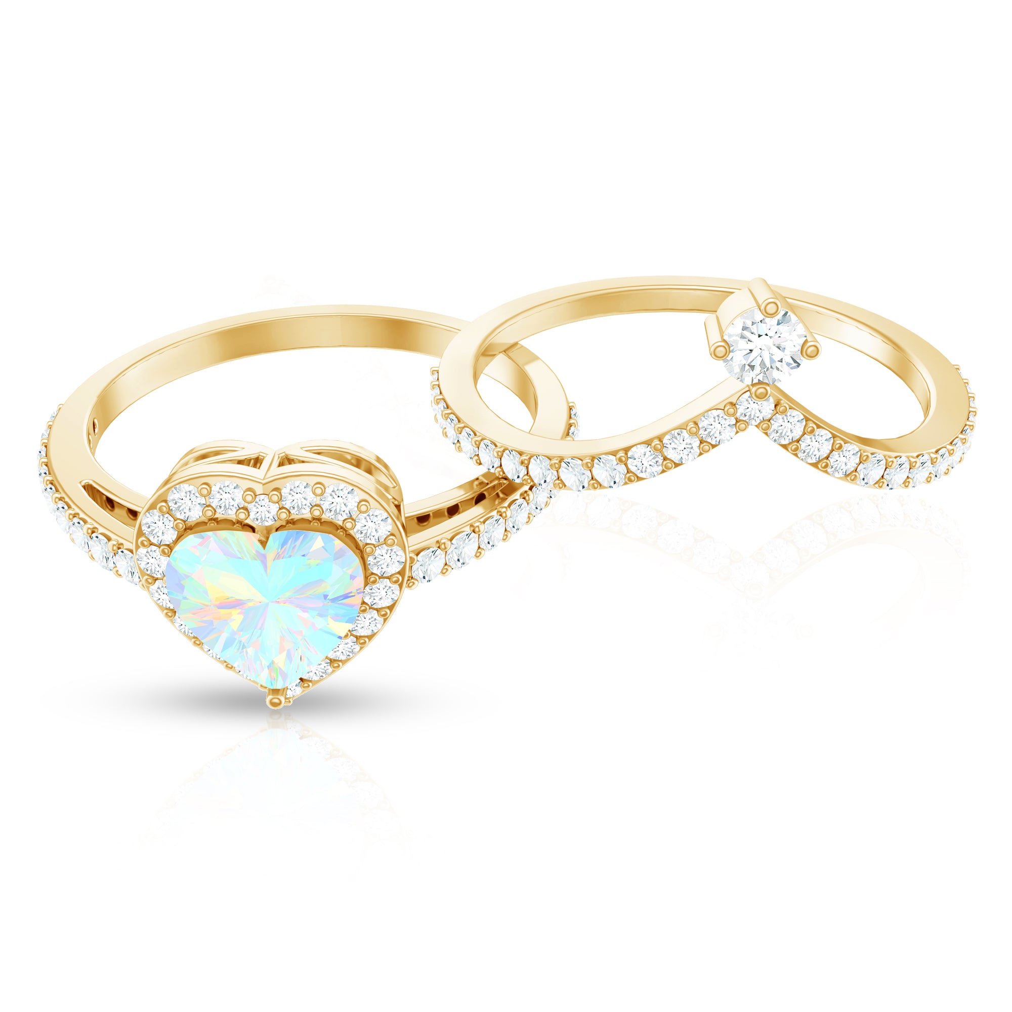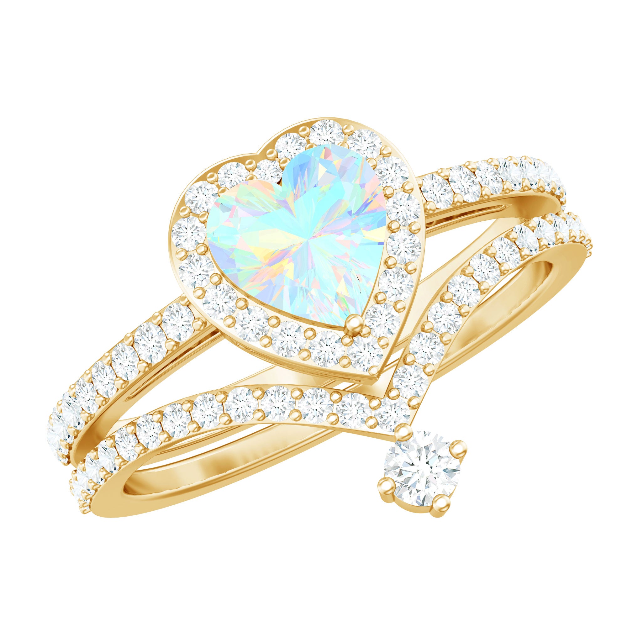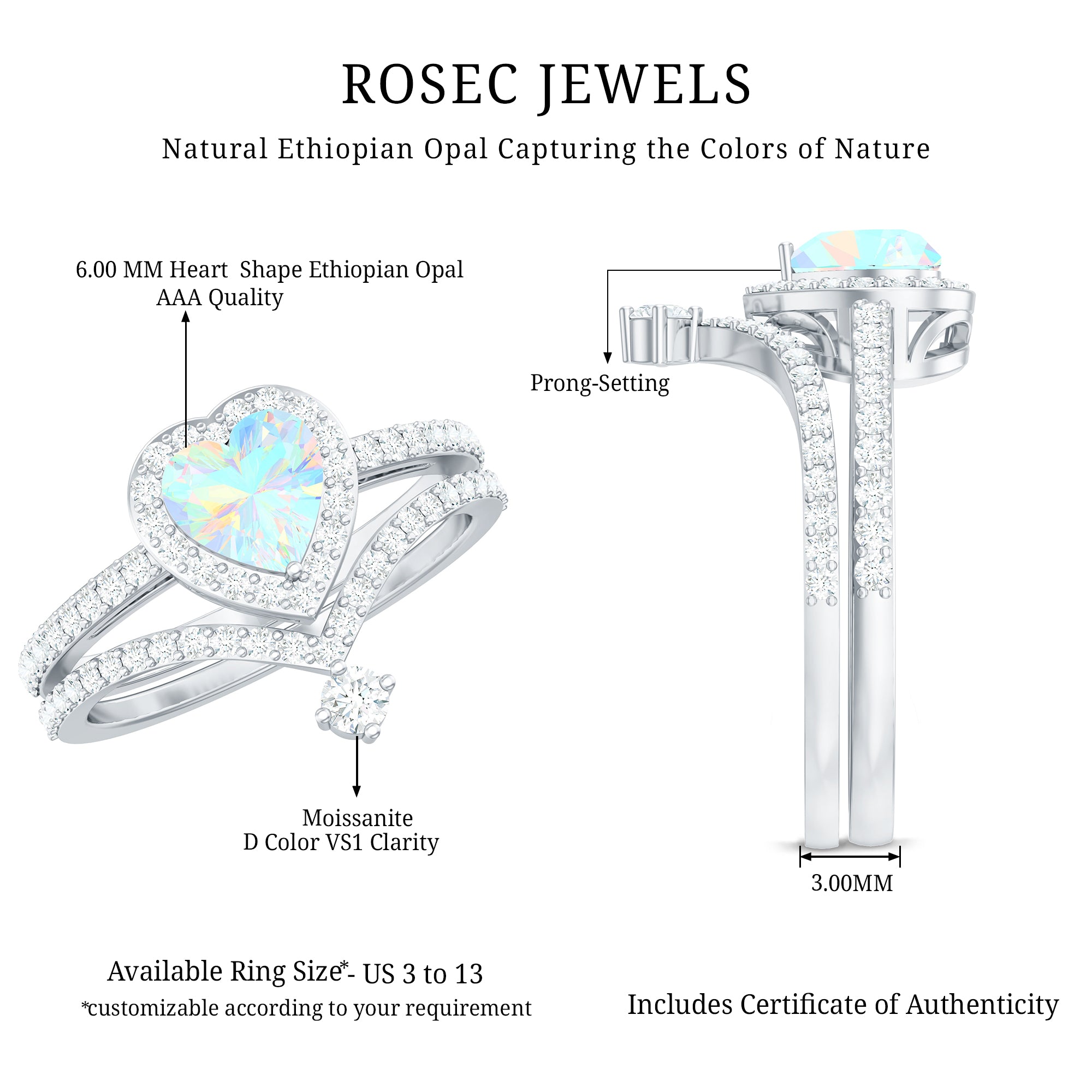 Celebrate love with this Heart Shaped Wedding Ring Set, a dreamy design that captures emotion, color and sparkle in perfect harmony. The Engagement Ring showcases a captivating 6 mm Heart Shape Ethiopian Opal set in Prong Setting, glowing with rainbow hues that shimmer with every movement, symbolizing the vibrant layers of your love story. Encircled by a Halo of Moissanite and complemented by sparkling Side Stones along the band, it is a piece that blends romance with bold elegance. Paired with a matching V Shaped Wedding Band, adorned with round Moissanite stones, creating a perfectly stacked design that feels both modern and timeless. Intricately designed, this Wedding Bridal Ring Set is ideal for the bride who wants her ring to feel as unique and unforgettable as the love it represents. Whether you are planning a heartfelt proposal or searching for the ultimate gift, this Opal Wedding Ring Set comes in various sizes and arrives ready to impress in a signature jewelry box.