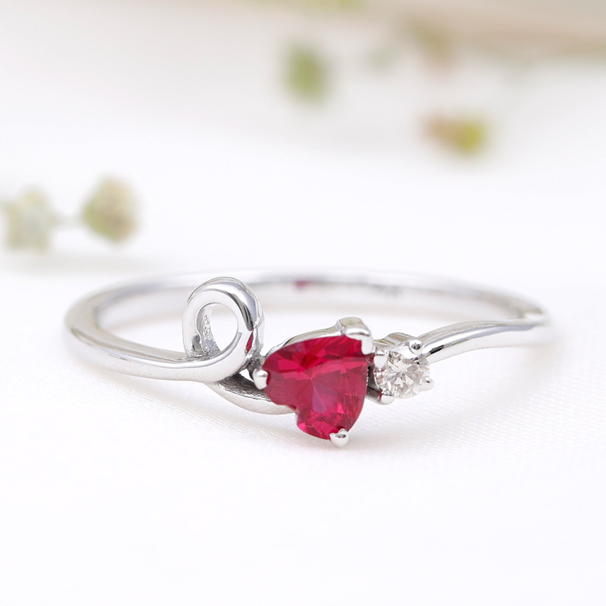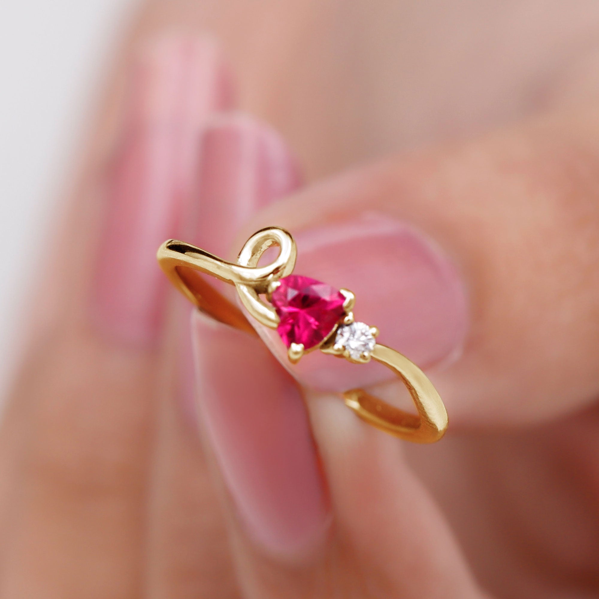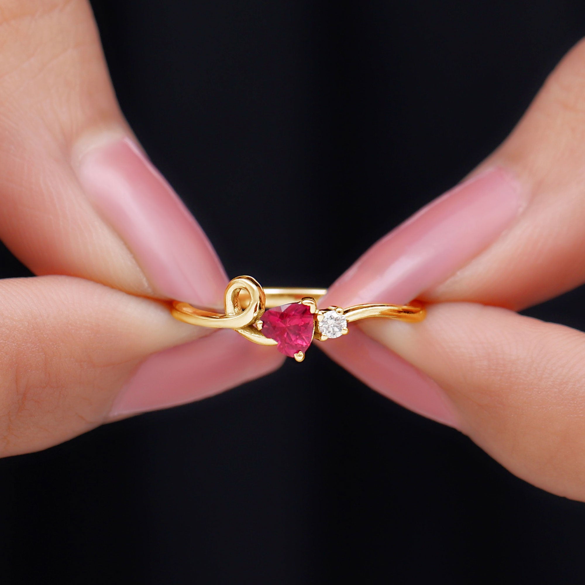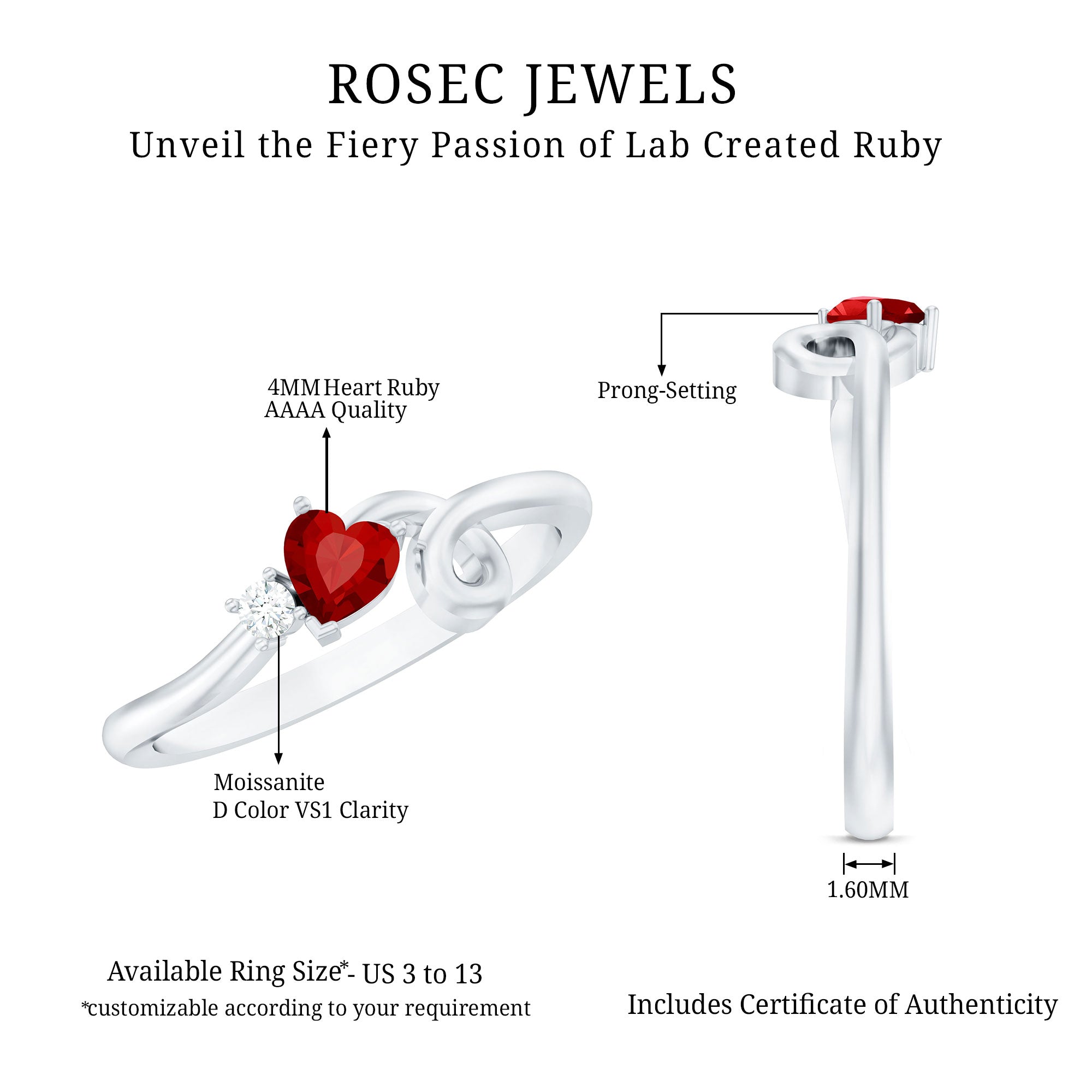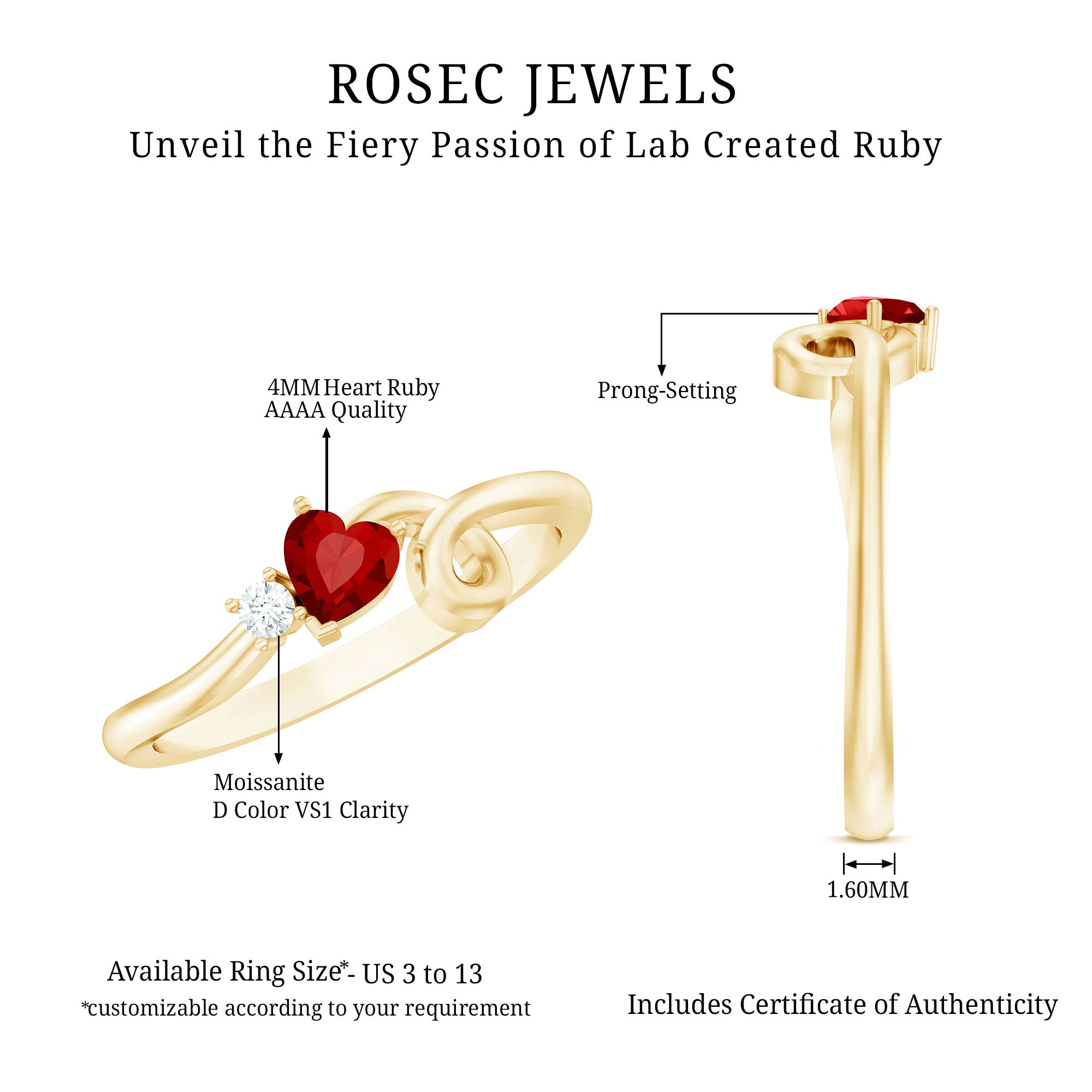 Embrace eternal love with our Heart Promise Ring, a ring as timeless as your love. Adorned with Heart-Shaped Created Ruby meticulously set in prong setting along with Round Moissanite embracing the beauty of twisted shank. Make every moment sparkle with the brilliant touch of this Created Ruby Ring showcasing both elegance and sophistication. If you are looking for a unique piece to enchant her eyes then grab this Ruby Heart Ring crafted with proper care and precision.
