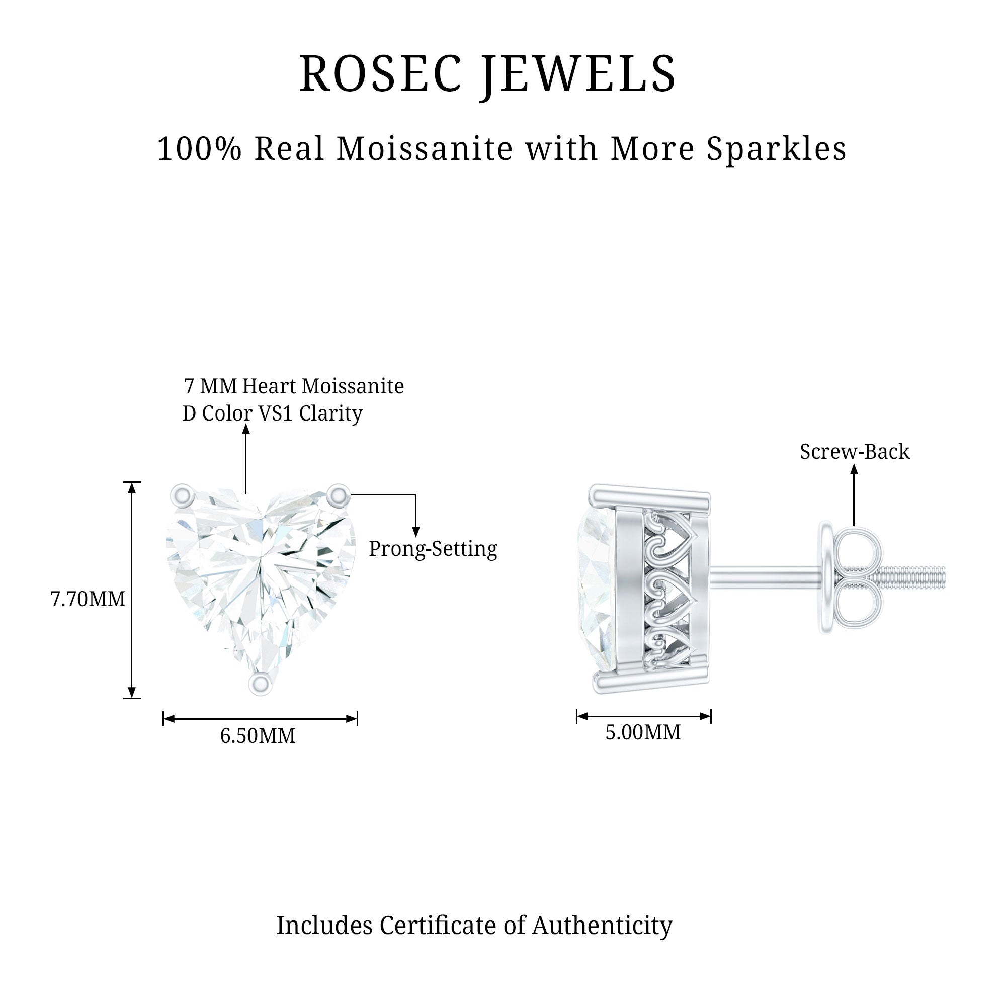 Sparkle and shine with these cute and pretty Certified Moissanite Stud Earrings. They feature 7 MM Heart Shape Moissanite in Prong Setting as Solitaire on Stud Earrings. Radiating a marvelous elegant appeal these Heart Stud Earrings are mesmerizing jewelry for the one close to your heart. Get ready to draw compliments with these that makes perfect for everyday wear or your evening date too. Even if you are among the ones who just love all things hearts then these Heart Studs make a great present for yourself.