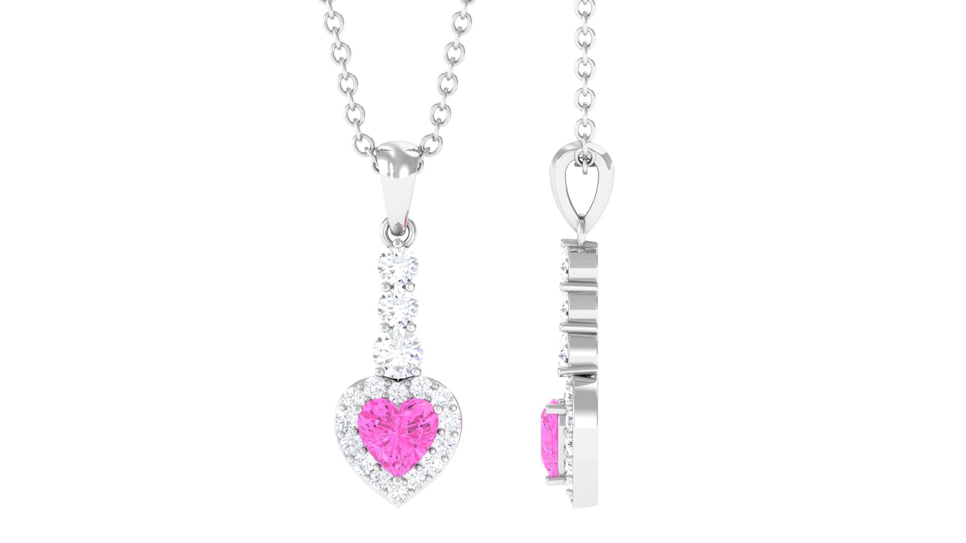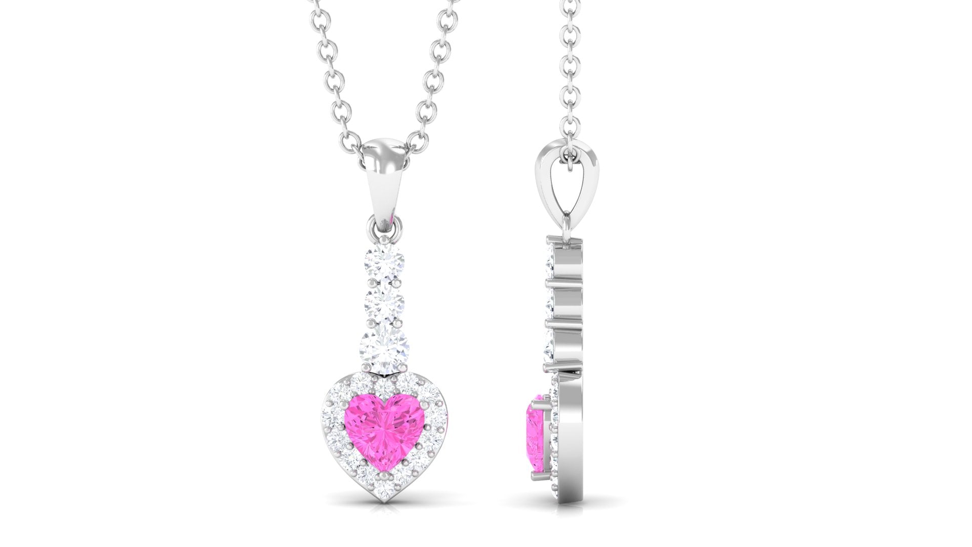 This stunning drop pendant features a brilliant heart shape Pink Sapphire gemstone surrounded by a Diamond halo, elegantly suspended from a delicate Diamond-studded bail. The vibrant hue of the Pink Sapphire contrasts beautifully with the sparkling Diamond stones, creating a piece that exudes sophistication and charm. Perfect for any occasion, this Pink Sapphire heart pendant is sure to become a cherished addition to any jewelry collection.