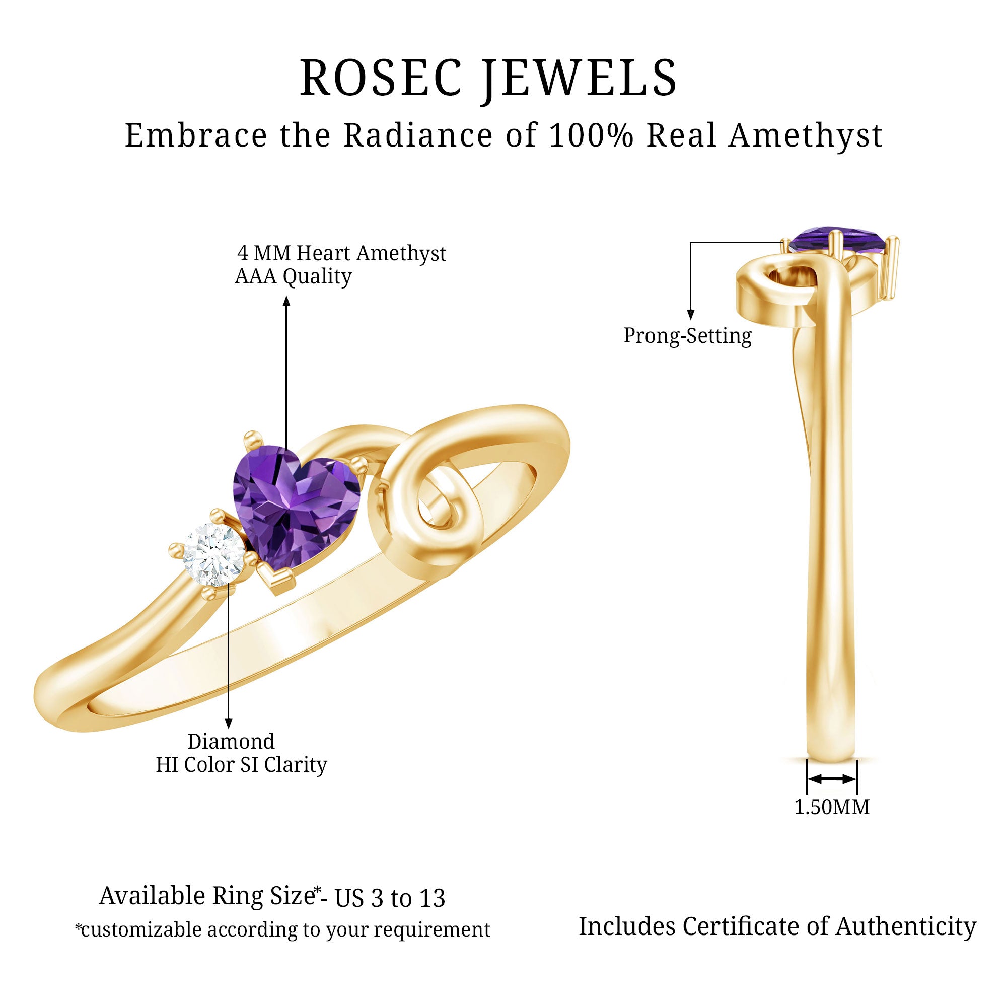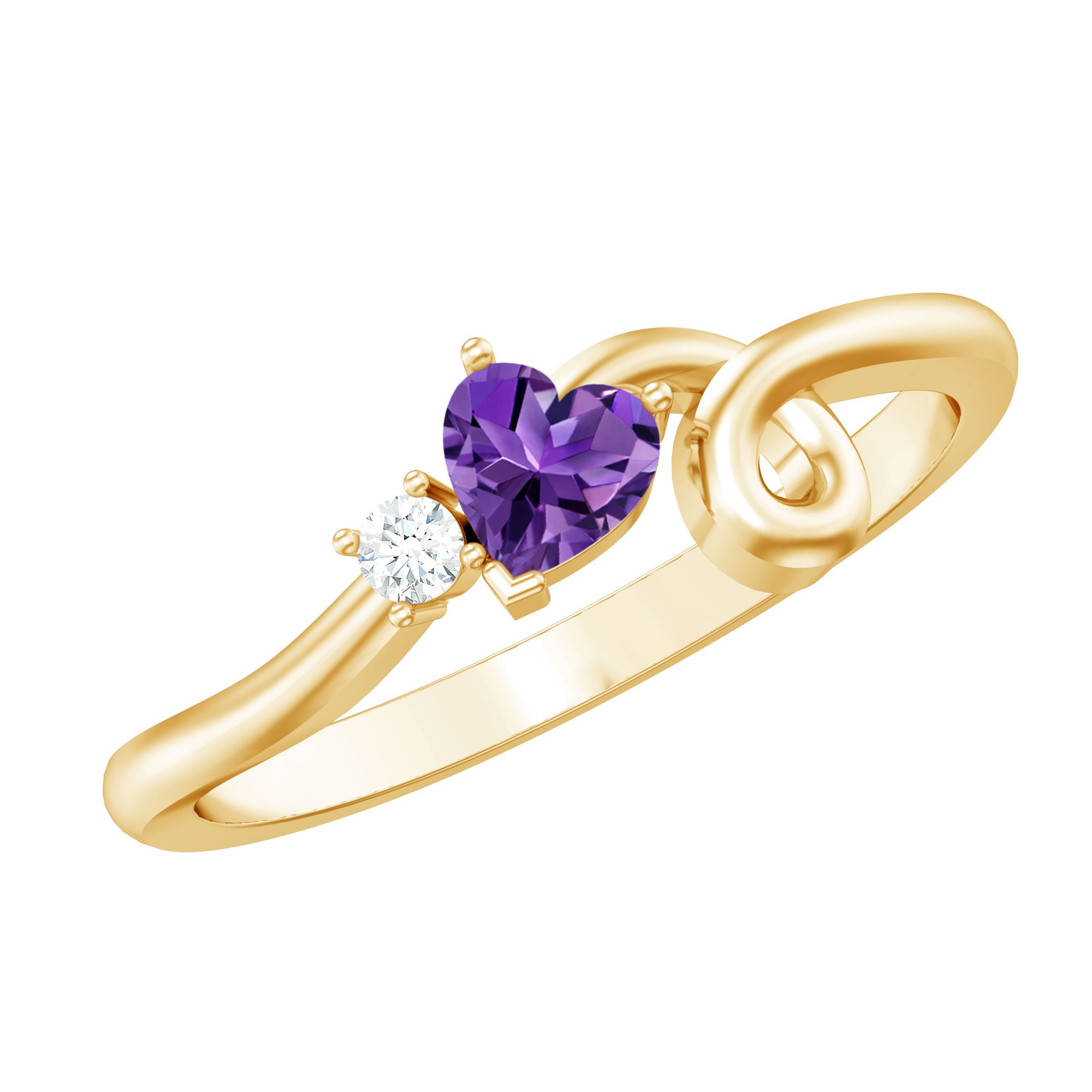 Radiant with brilliance and shimmer, behold the Heart Promise Ring designed for women. It showcases a heart-shaped Amethyst held elegantly in a prong setting, accompanied by sparkling Diamond stone. The ring features an intricately crafted twisted band, all fashioned from high quality metal.