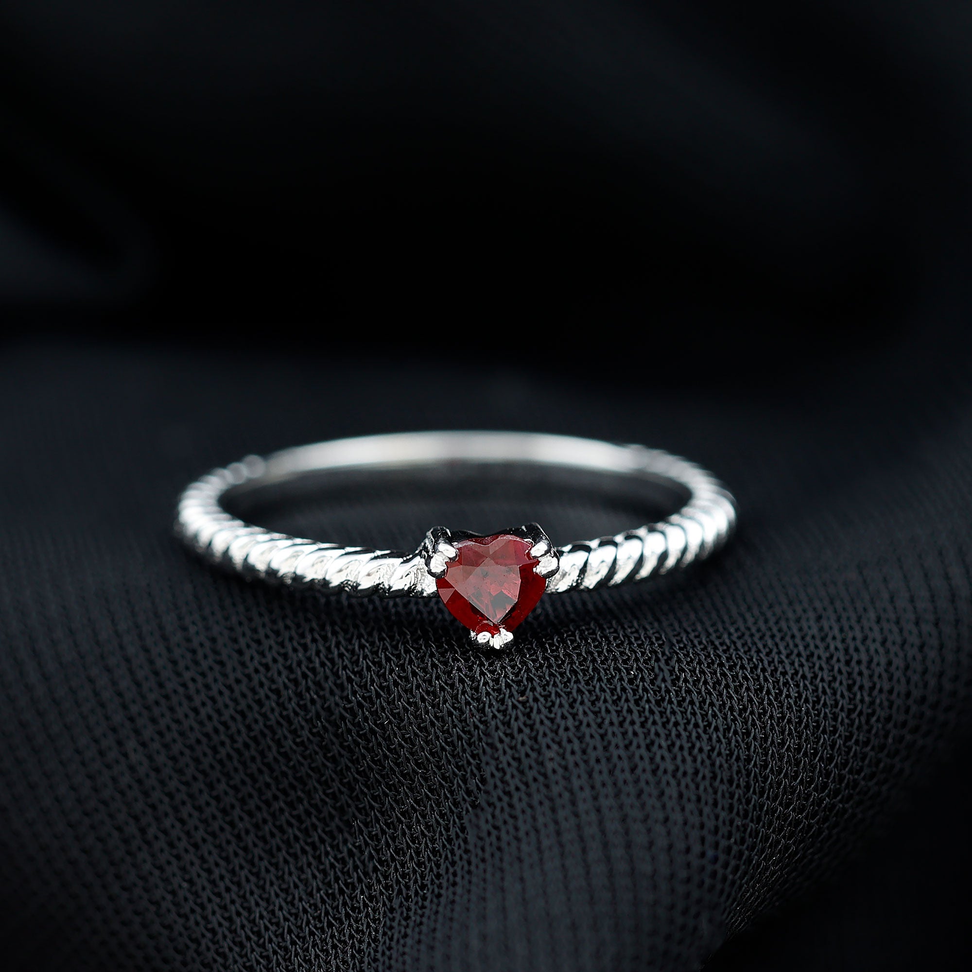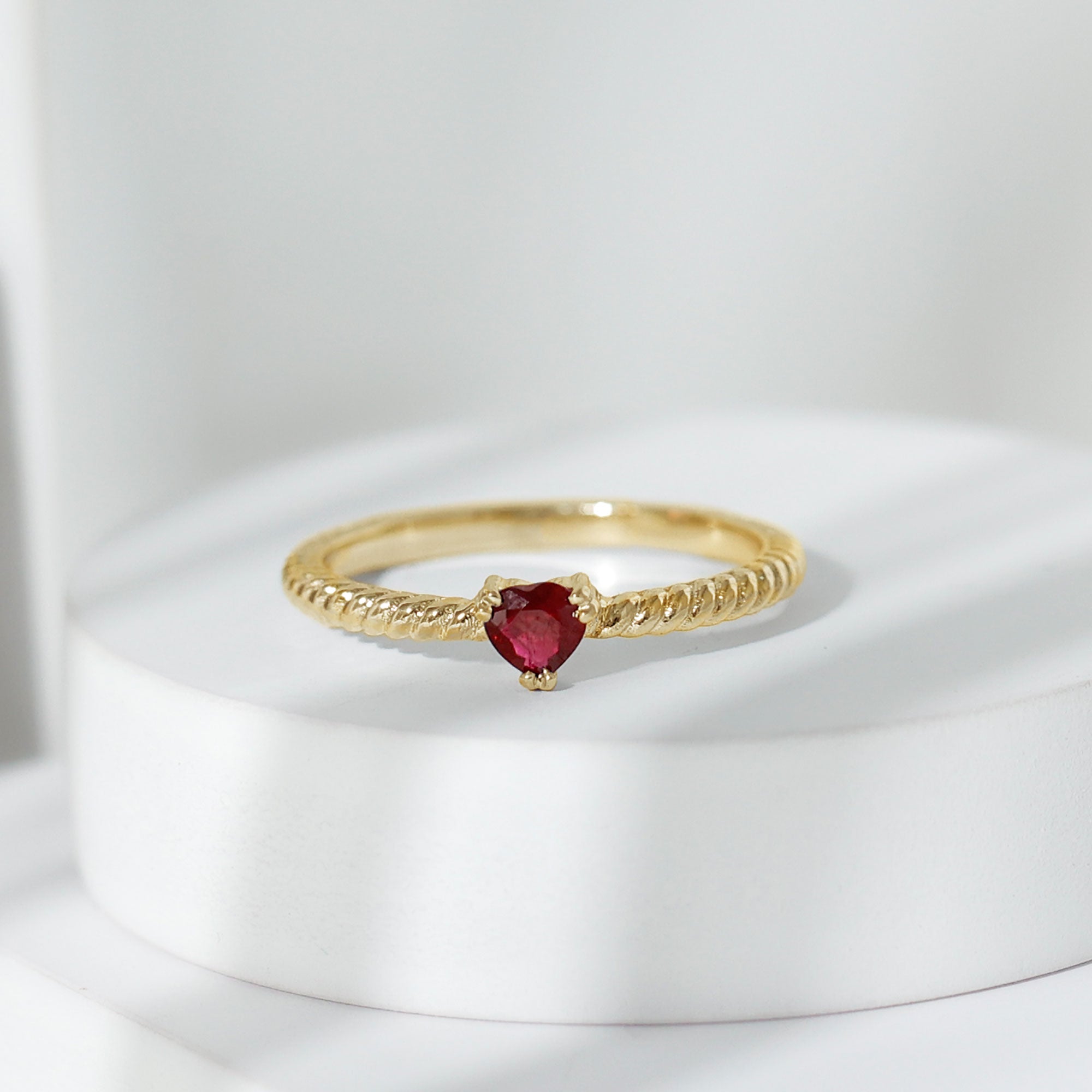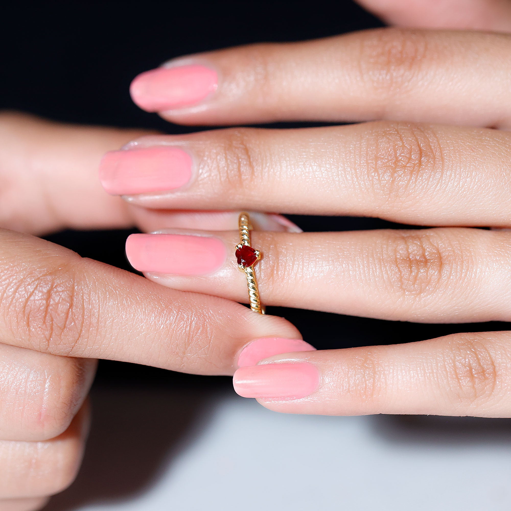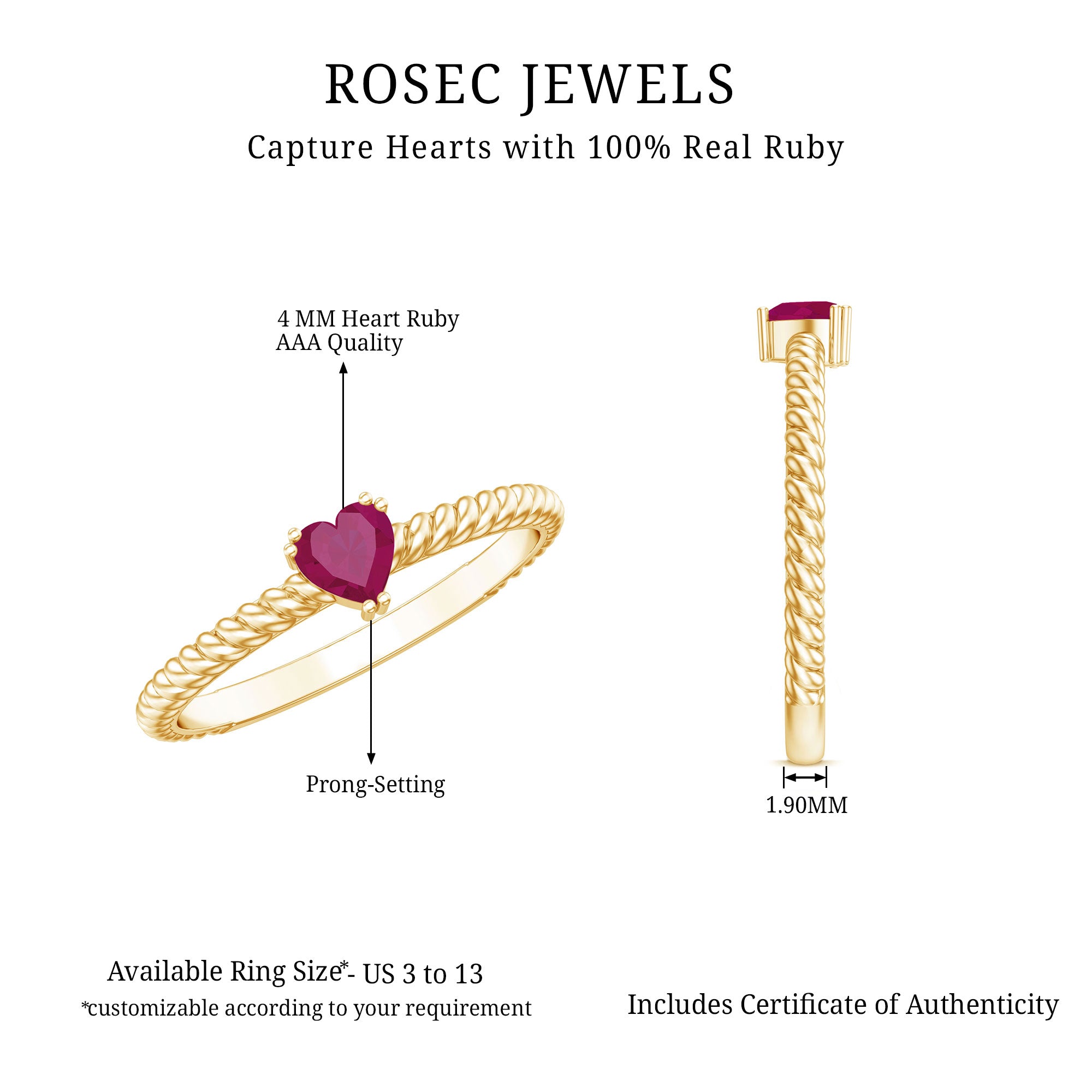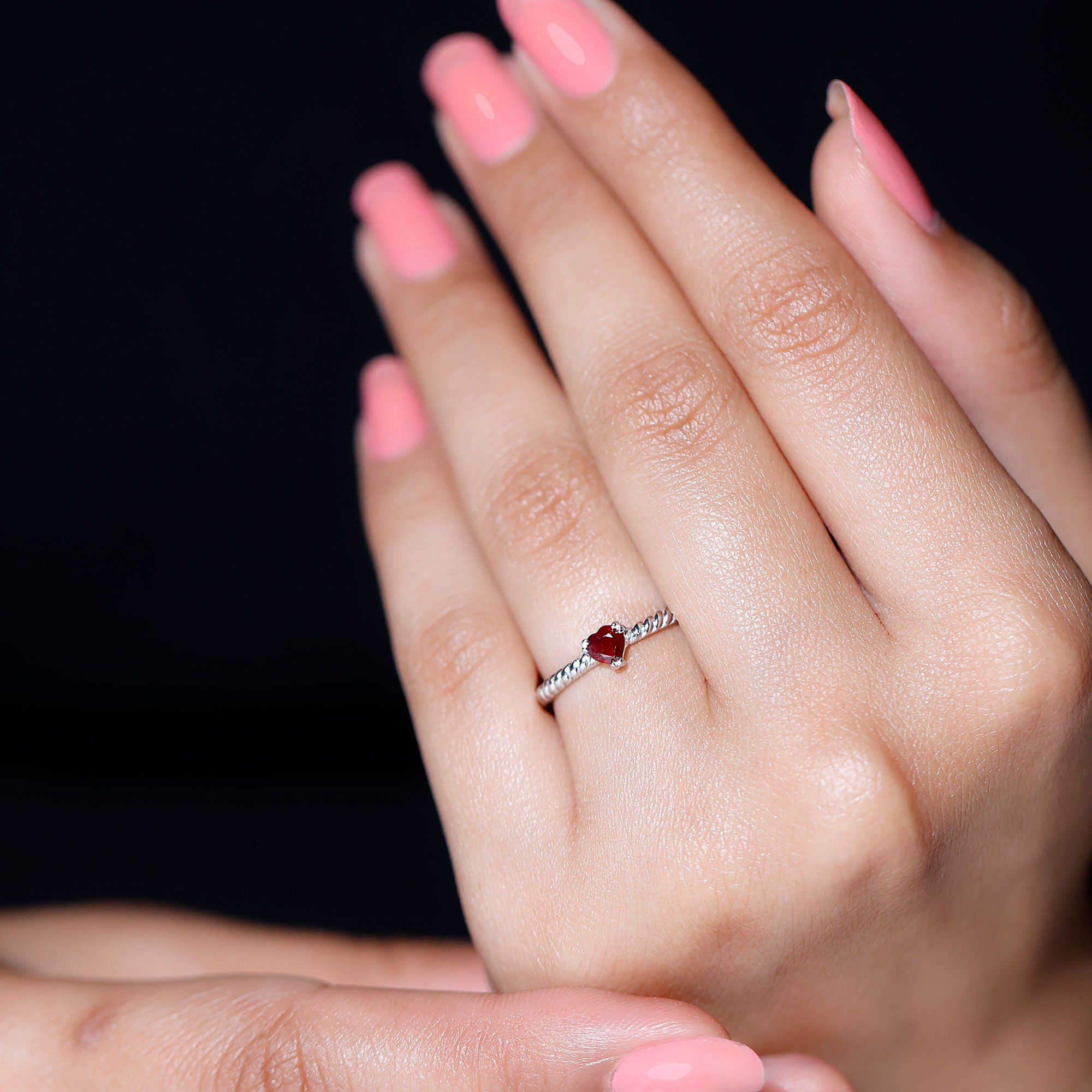 The beautiful dainty and striking Ruby Promise Ring represents an unconditional love for your special one. When modern meets stylish design with twisted rope details that add a special touch to your outfits. This Ring is adorned with a 4 mm Heart Shape Ruby in Double Prong Setting as Solitaire. This ring embodies simplicity and elegance, making it a meaningful symbol of love. Truly a versatile and beautiful Promise Ring for Her, representing a perfect anniversary, promise, or a July birthday. The center stone dazzles and sparkles with shine, symbolizing this sentiment. As a commitment symbol, this Heart Ruby Ring goes beyond just a pledge of love, creating the perfect symbol of your commitment and making a romantic gesture she will never forget.