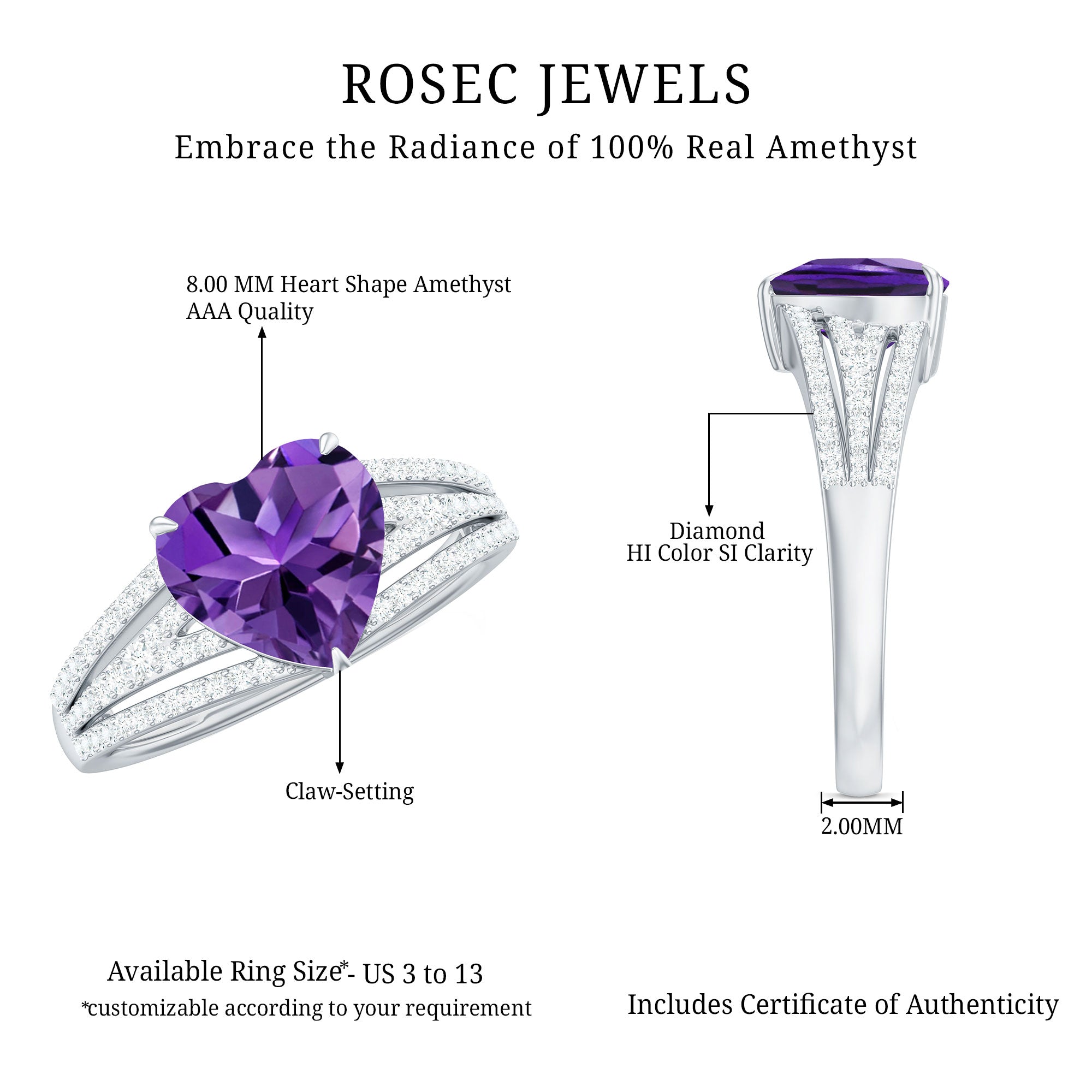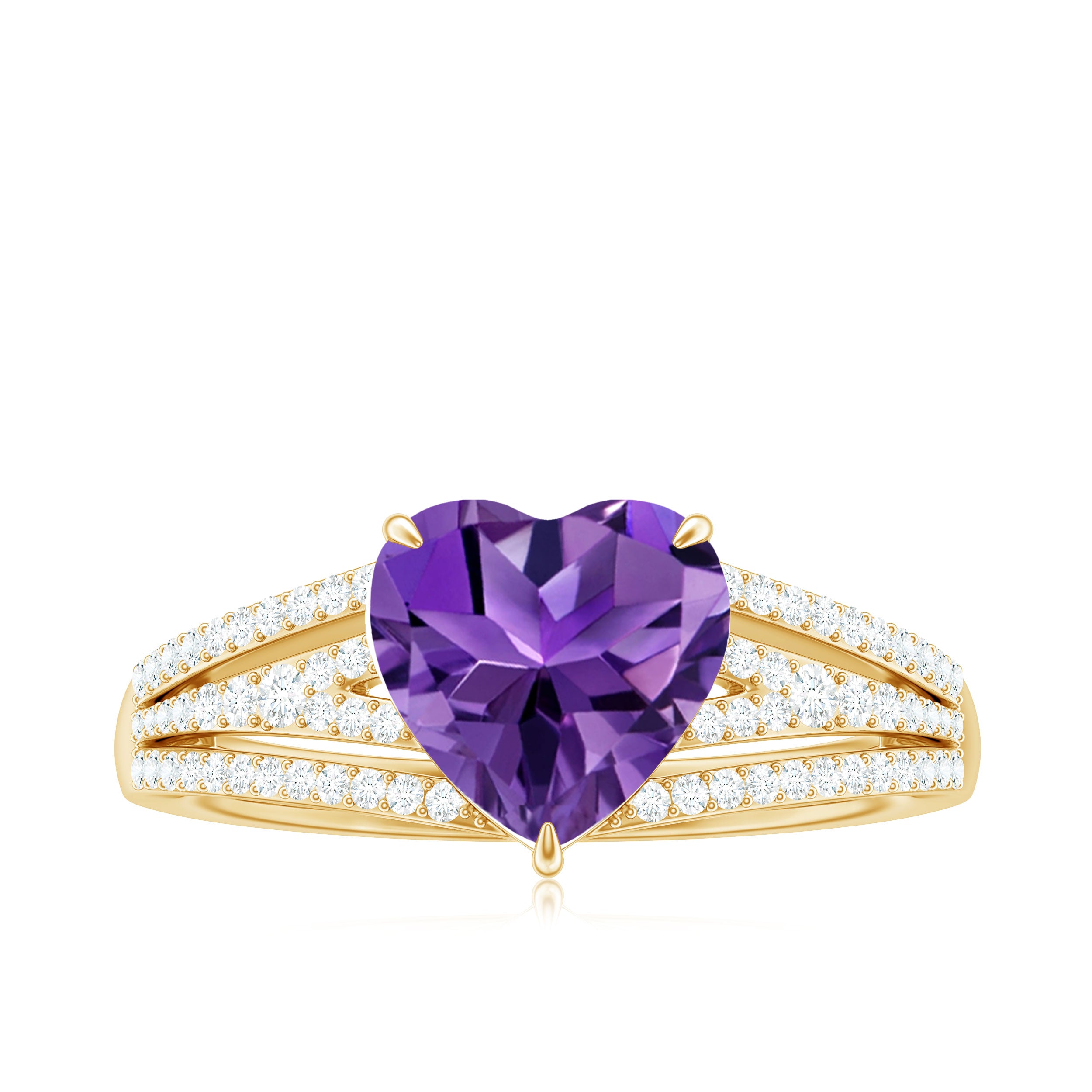 A charming Heart Engagement Ring, crafted with exquisite solid gold, adds a special touch. The ring features a beautiful Heart Shape Amethyst solitaire set in a claw prong setting, and is accented with tiny round Diamond on a split shank.