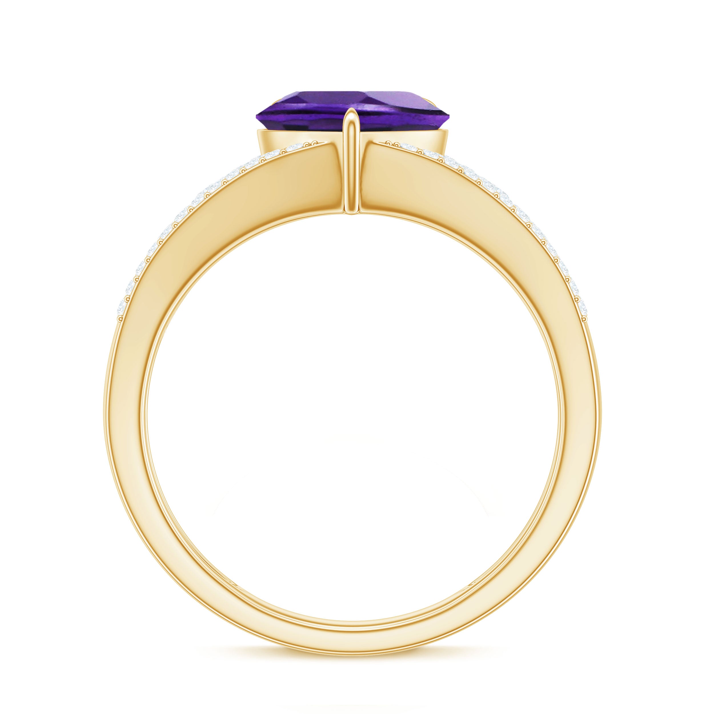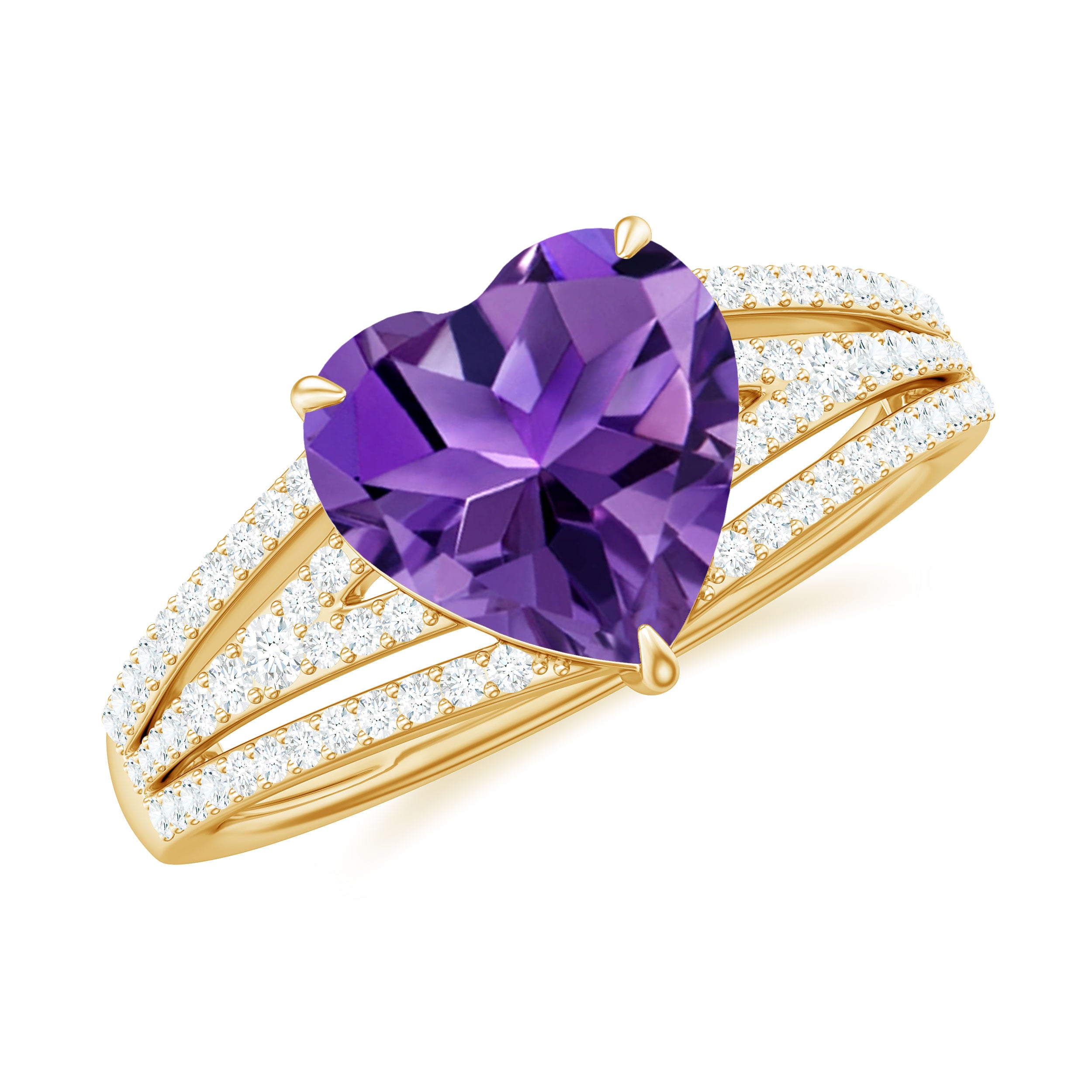 A charming Heart Engagement Ring, crafted with exquisite solid gold, adds a special touch. The ring features a beautiful Heart Shape Amethyst solitaire set in a claw prong setting, and is accented with tiny round Diamond on a split shank.