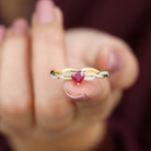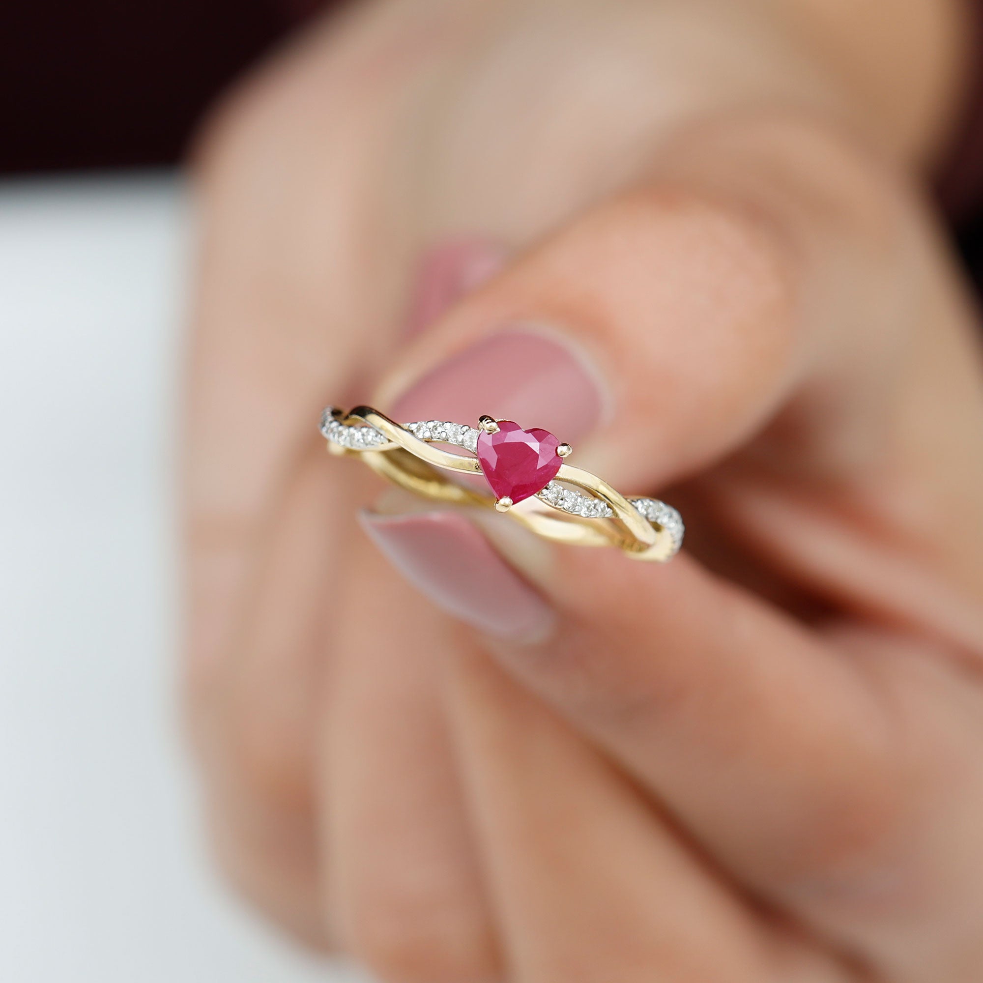 Radiate like a diva in this glamorous Ruby and Diamond Ring, featuring a dazzling Heart Shape Ruby gemstone in a 3 Prong Setting with Diamond accents. This Classy Ruby Solitaire Ring is the perfect Engagement Ring to propose to your lady love. Embrace the elegance and allure of this exquisite gemstone ring, a symbol of your love and commitment that will make her heart skip a beat.