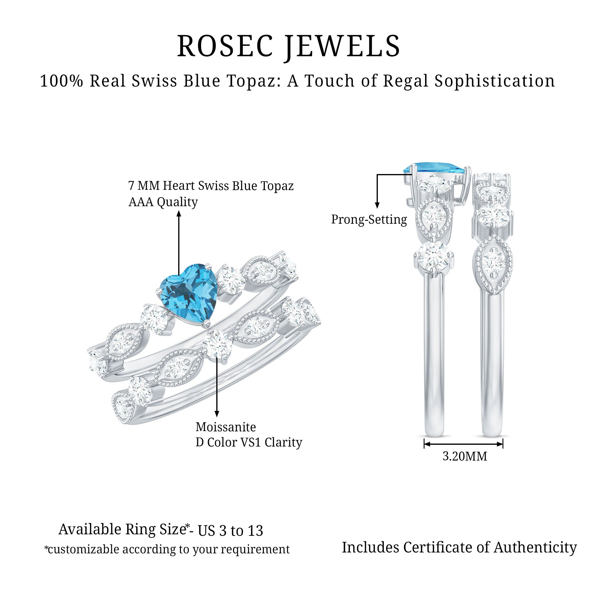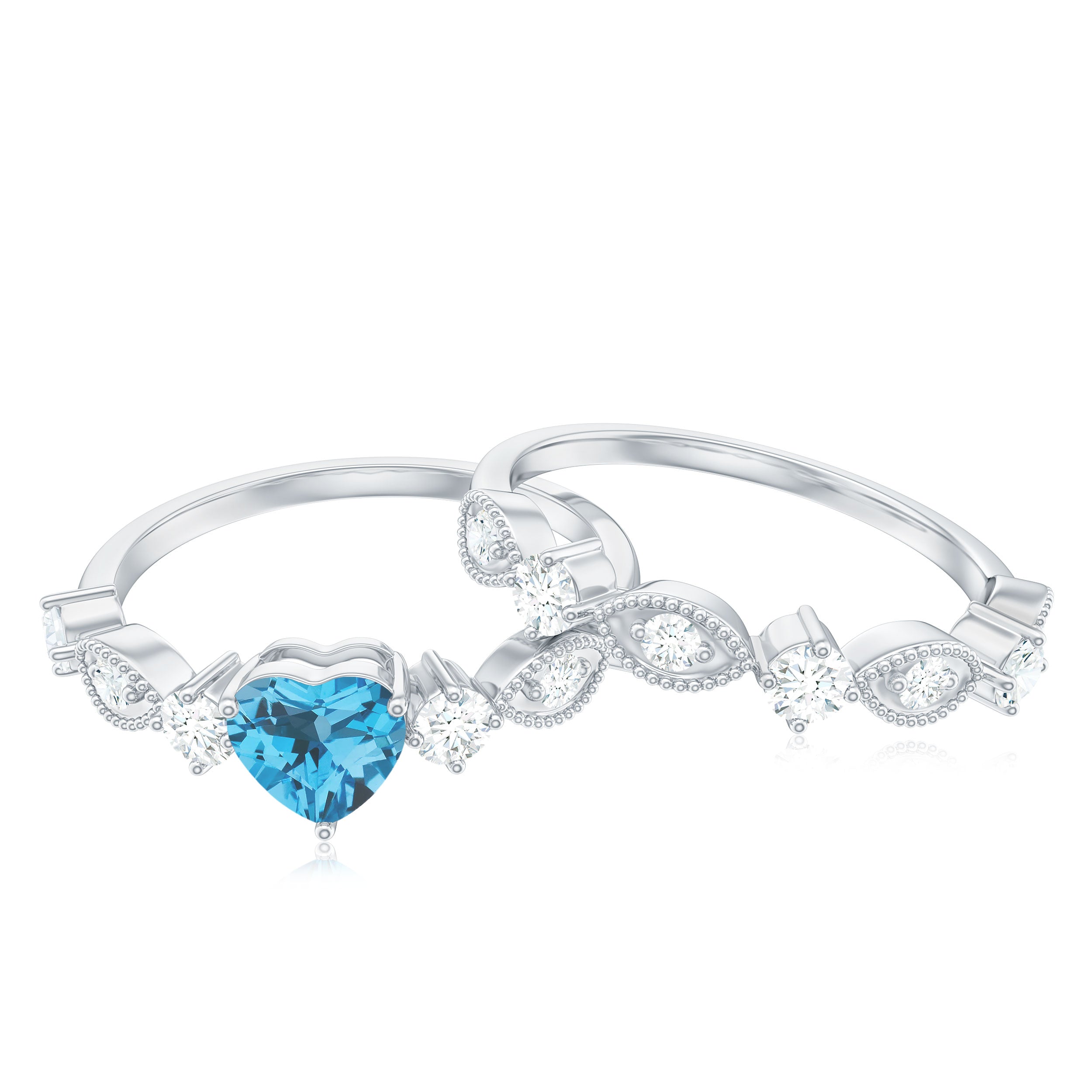 Heart Shape Swiss Blue Topaz and Moissanite Stackable Ring Set