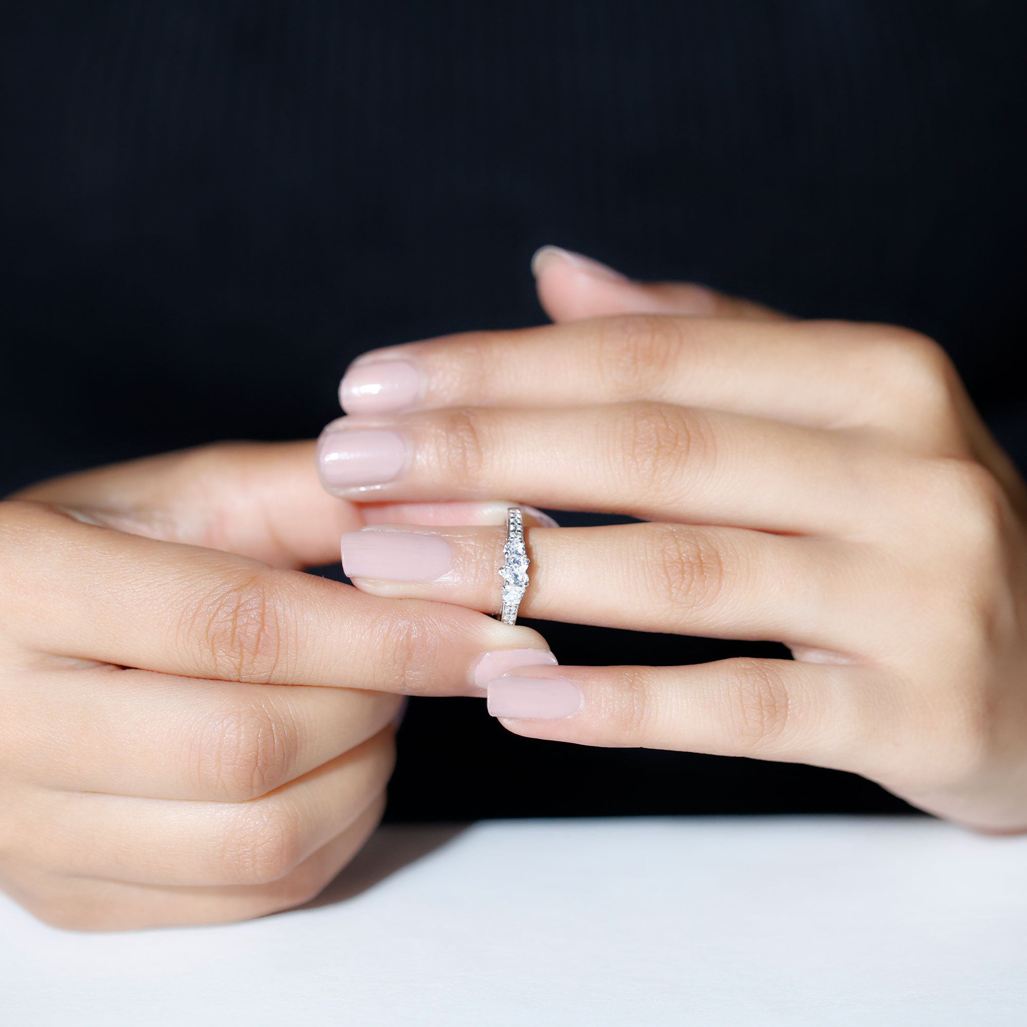 Symbolizing your cherished past, present, and promising future, three heart-shaped zircon stones are elegantly cradled in secure prong settings. Complementing these meaningful hearts, round zircon accents grace the shank in a surface prong setting, adding a touch of sparkle to this significant piece. Each heart-shaped zircon represents a distinct chapter of your journey, while the radiant cubic zirconia accents symbolize the moments that beautifully connect them.
