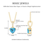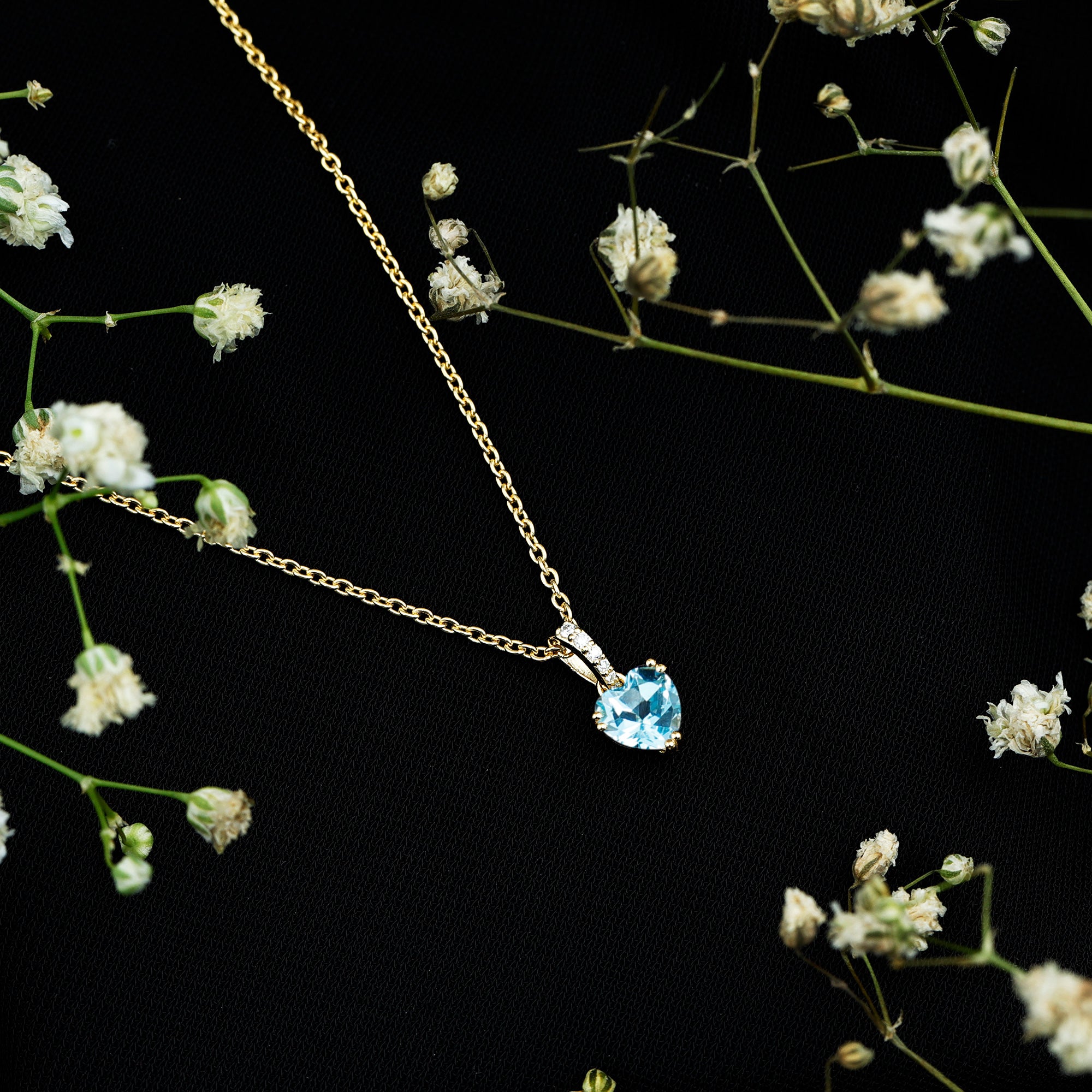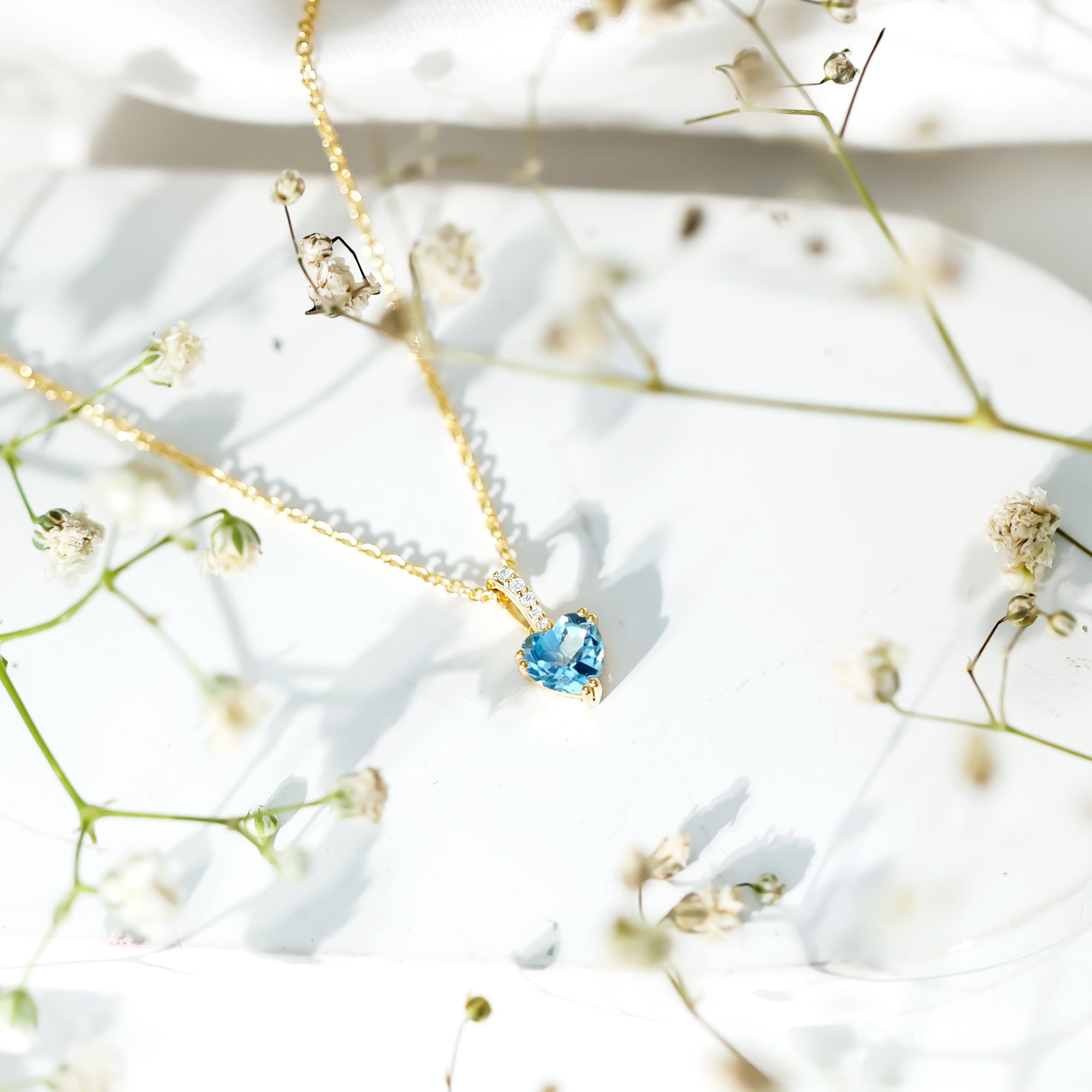 Delicate yet striking, this Swiss Blue Topaz Heart Necklace is a symbol of clarity, connection, and effortless beauty. Expertly crafted in 14k yellow gold plated sterling silver, this elegant Solitaire Pendant features a 6 MM heart shaped Swiss Blue Topaz set securely in double prong setting. Adding an extra layer of sophistication, the Heart Locket Necklace is connected to the chain by a bail adorned with shimmering lab grown diamonds. Suspended from a sleek, durable chain, this Blue Stone Necklace rests gracefully at the neckline, making it ideal for everyday wear or meaningful occasions. Whether worn alone or layered, it adds a personal touch to any outfit, from casual daytime looks to evening elegance. As the birthstone for December, Swiss Blue Topaz symbolizes peace, honesty, and emotional balance, making this Blue Topaz and Diamond Necklace a thoughtful gift for a December born loved one or anyone drawn to jewelry with deeper meaning. Presented in a signature jewelry box, this heart pendant is a beautiful way to mark birthdays, anniversaries, or moments of self-love.
