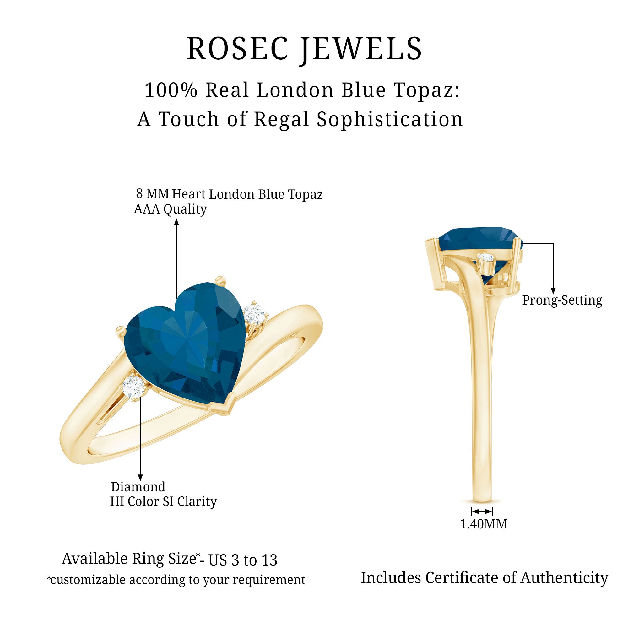 This London Blue Topaz Engagement Ring serves as a stunning tribute to love that is both distinctive and deeply meaningful. At its core lies an exquisite 8 MM heart-shaped london blue topaz, securely held in prong setting, allowing the stones beauty to radiate from every perspective. Flanking the heart are delicate round diamonds that contribute a gentle, elegant sparkle. However, what truly distinguishes this Heart Engagement Ring is its bypass shank, a fashionable twist in the band that gracefully encircles the central stone. This design imparts a sense of fluidity to the ring, reminiscent of two paths converging in perfect unity. Crafted from AAA quality london blue topaz and HI-SI quality diamonds, this Solitaire Engagement Ring is made with meticulous attention to detail, beauty, and enduring quality. Its timeless design ensures it is suitable for everyday wear, yet it remains special enough for significant occasions. Additionally, it comes presented in a charming jewelry box accompanied by a certificate of authenticity, making it ready for gifting or for personal enjoyment. Simple, elegant, and everlasting, this Blue Topaz and Diamond Ring serves as a reminder that true love assumes its own beautiful form.