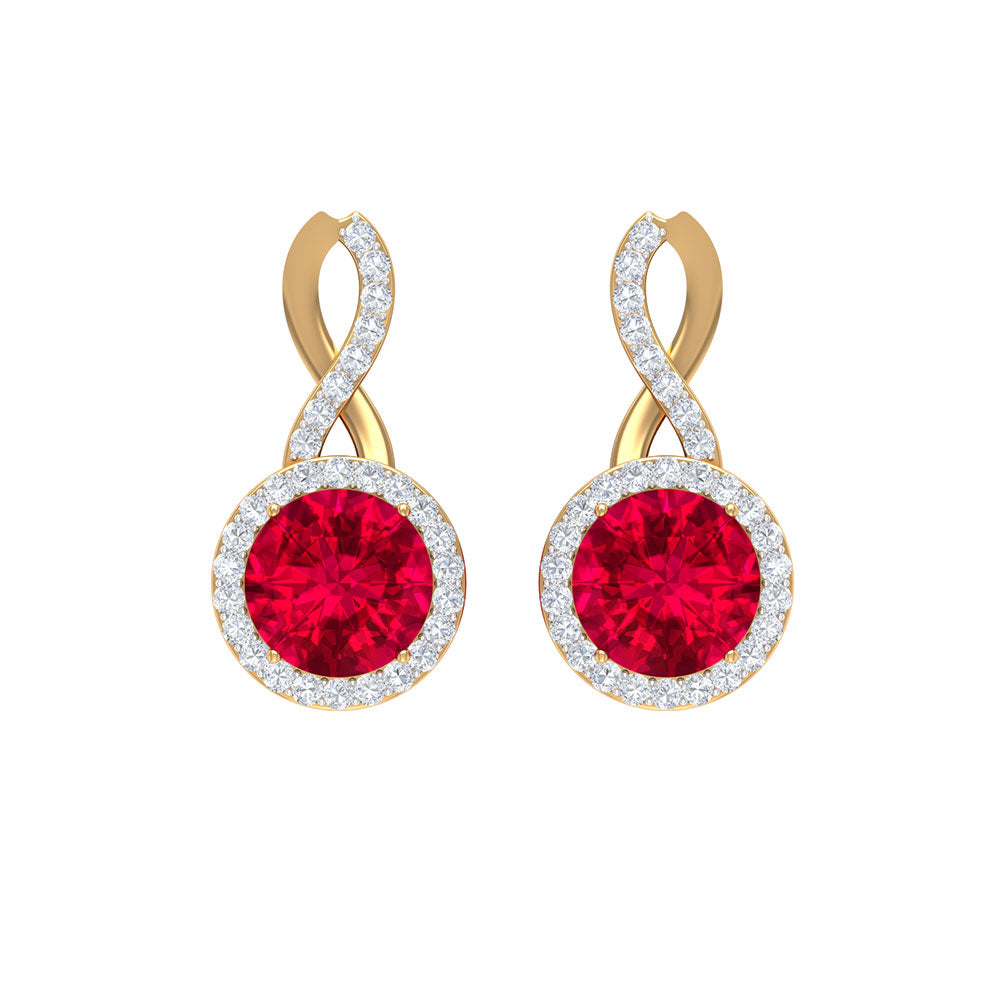 This Infinity Drop Halo Earrings embellished with Round Shape Created Ruby is set in a prong Setting encircled with small Round Shape Diamonds and more Diamonds are set on the infinity pattern, crafted in a Solid Gold Metal.