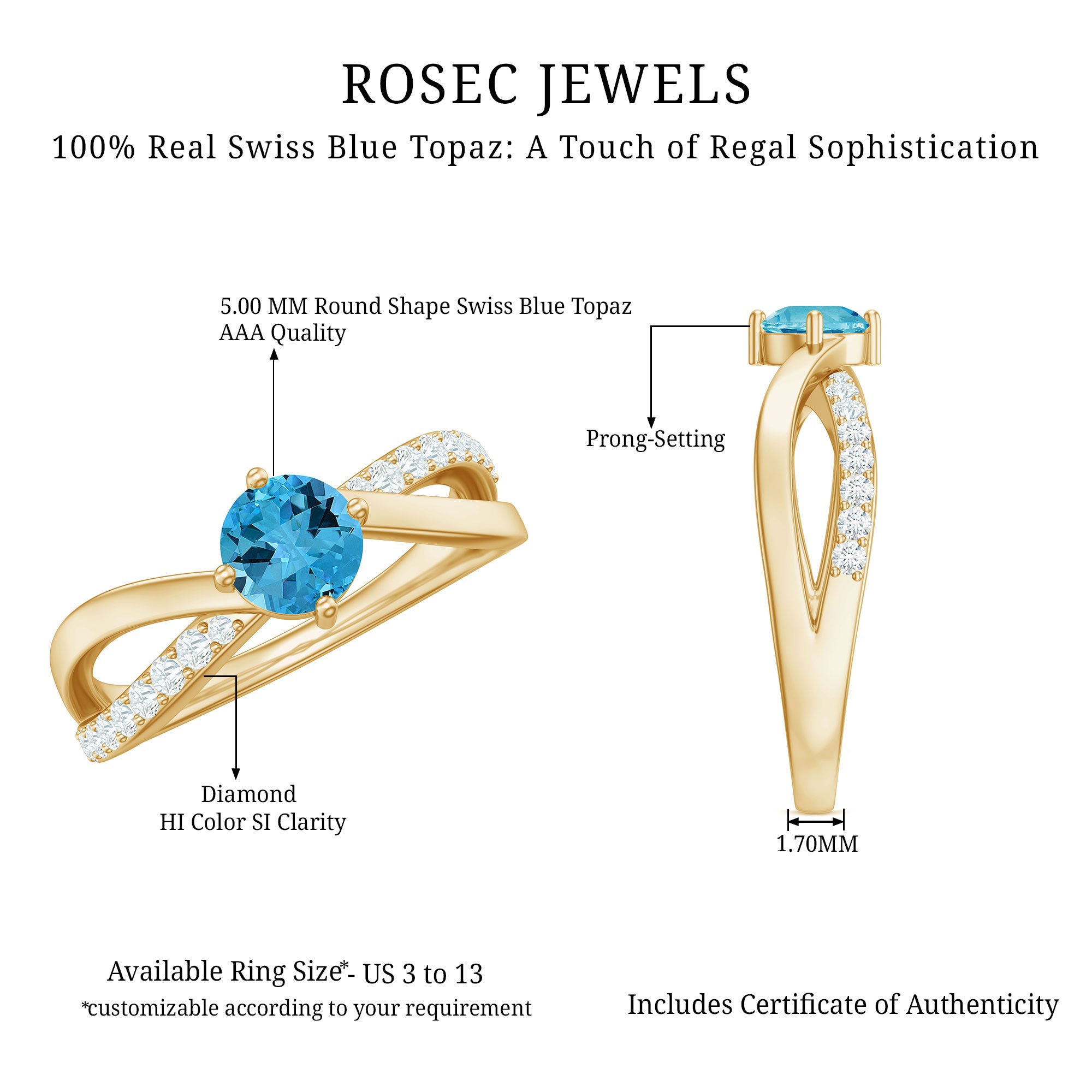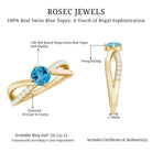 This stunning infinity engagement ring is a symbol of everlasting love and commitment. The center stone, a brilliant Swiss blue topaz, is Round Shape and set in 4 prong diagonal setting, showcasing its natural beauty and depth of color. The infinity shank design is a perfect representation of the infinite love and commitment that you share with your partner. The shank is also adorned with sparkling Diamond stones, adding extra brilliance and glamour to the piece. Elegant and timeless, this ring is the perfect choice for those who appreciate classic style and modern design.